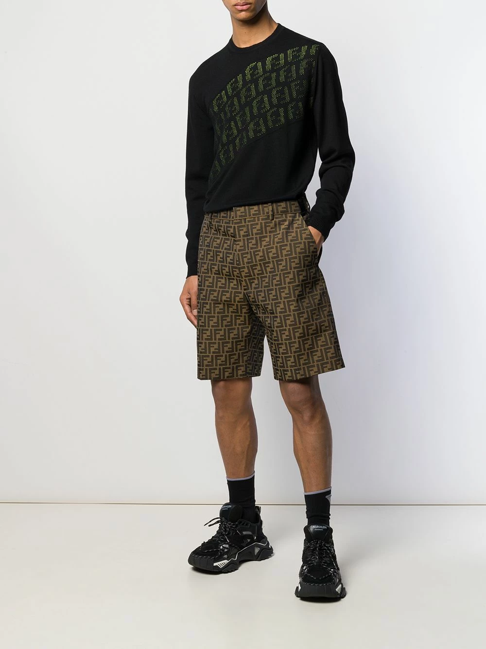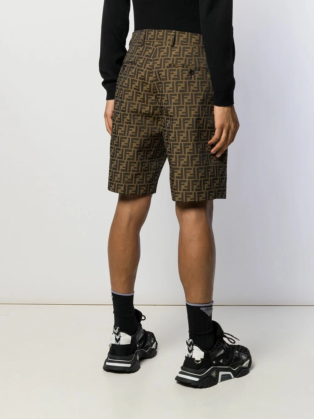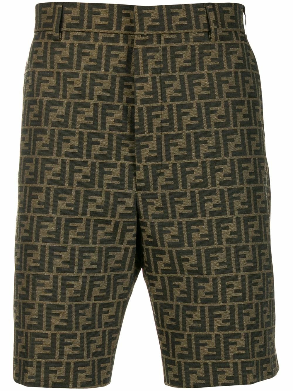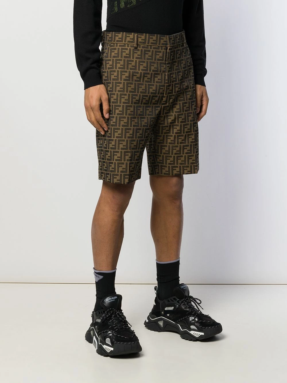 This new season expect to see classic Fendi glamour with a twist. The brand hits all the right notes with a spectacularly immaculate tailored collection that is filled with vibrant colours and monograms.These brown cotton blend FF motif shorts offer unconventional tailoring at its finest. Featuring belt loops, rear welt pockets, a three-quarter length and a jacquard logo design.