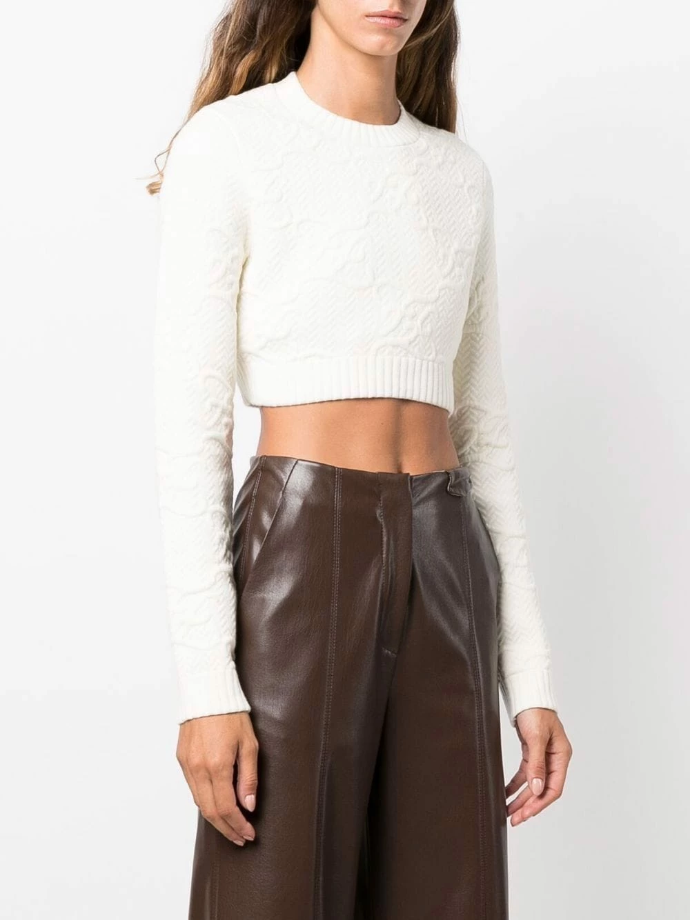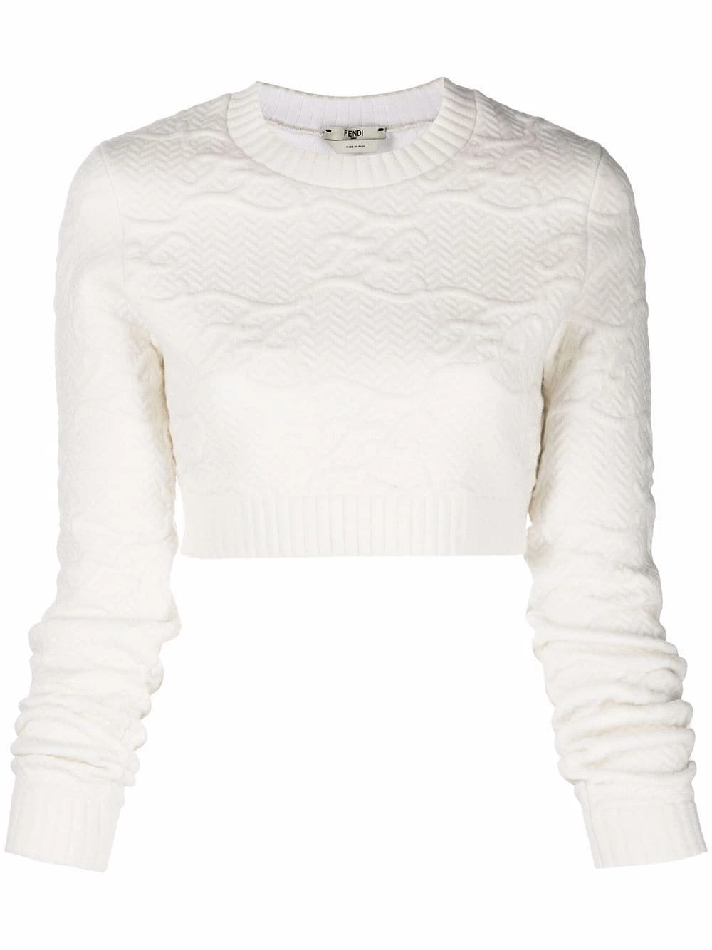 A revisited theme, Fendiβs iconic FF motif adds a recognisable look to this cropped jumper. Presented in a tonal white hue, the pattern appears in an embossed version.