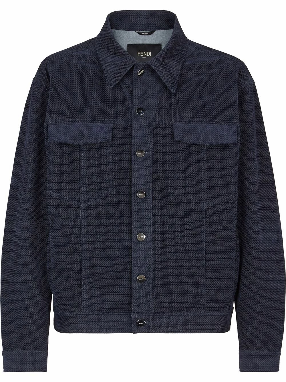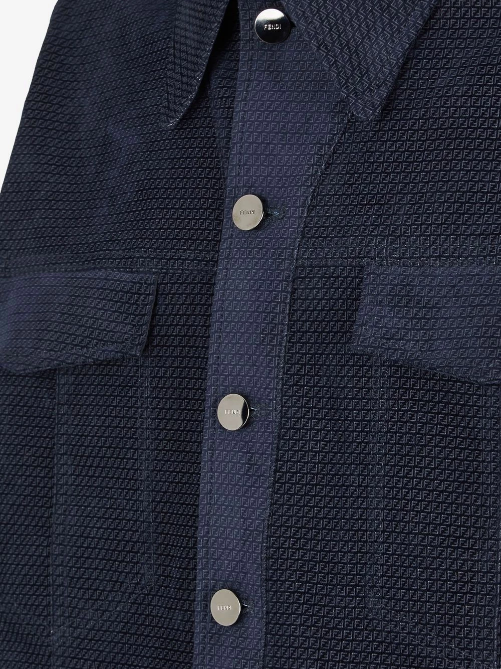 A micro FF motif appears as an all-over design on this Fendi jacket, adding a contemporary touch to the classic silhouette. This contrast speaks to the creativity at the heart of the brand.