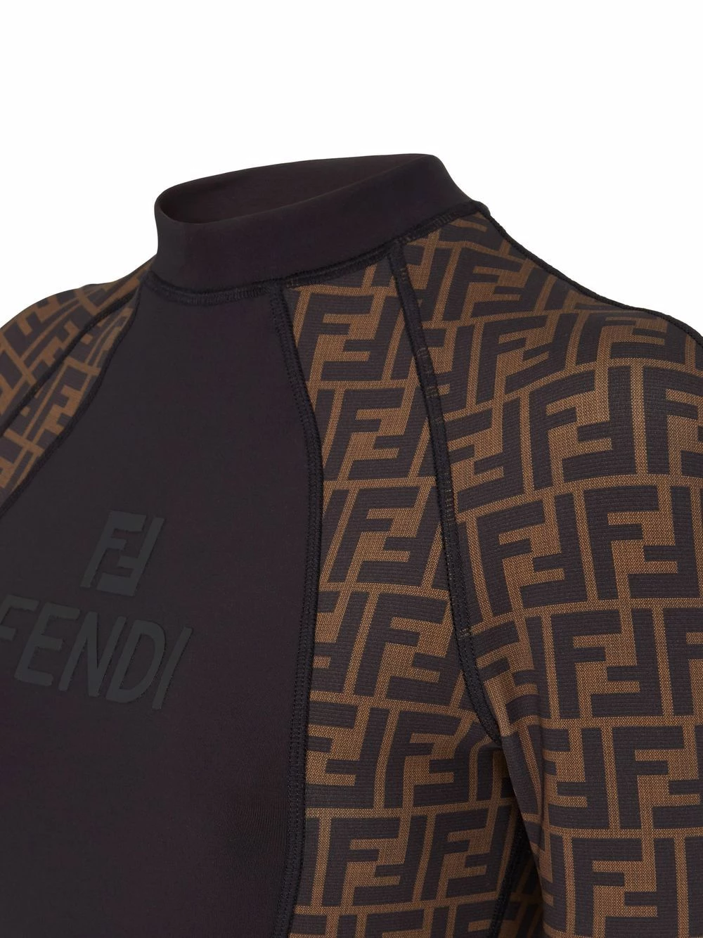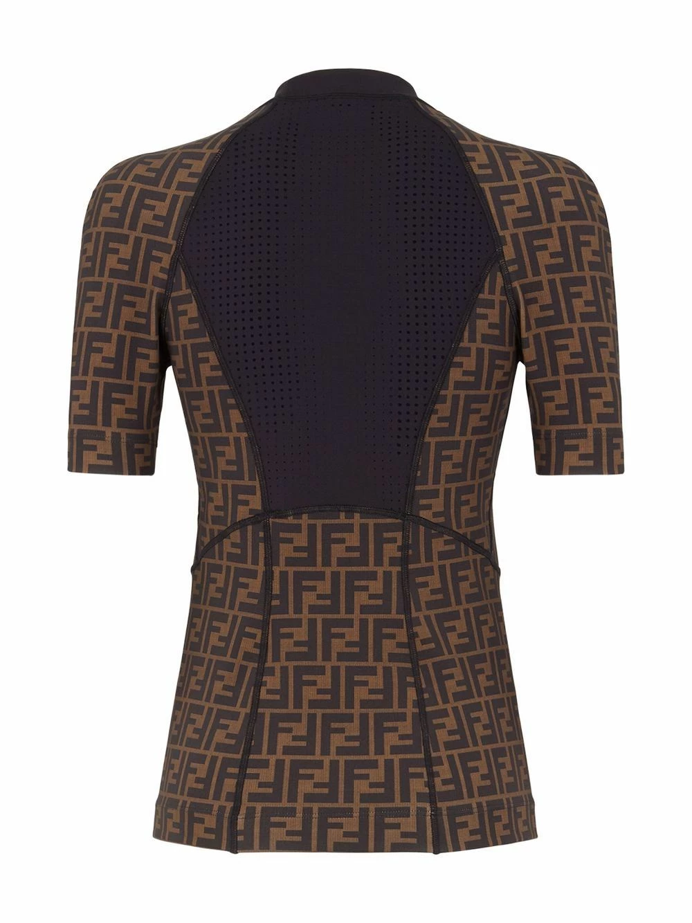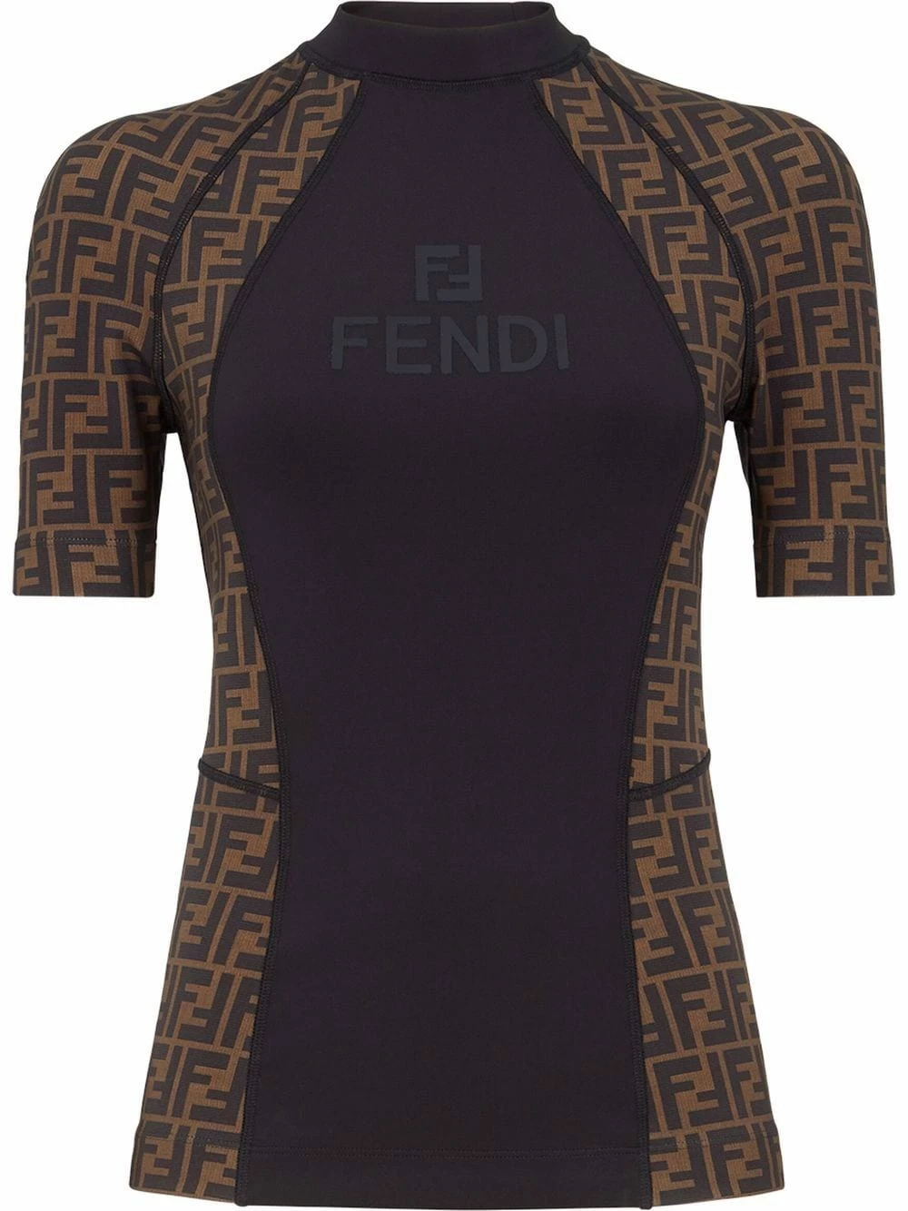 The iconic FF motif appears in the house’s signature brown and black colourway on this panelled Fendi T-shirt. First seen in 1965, the logo still feels contemporary today.