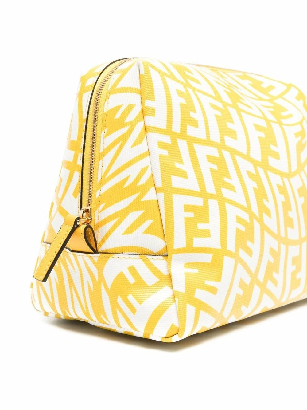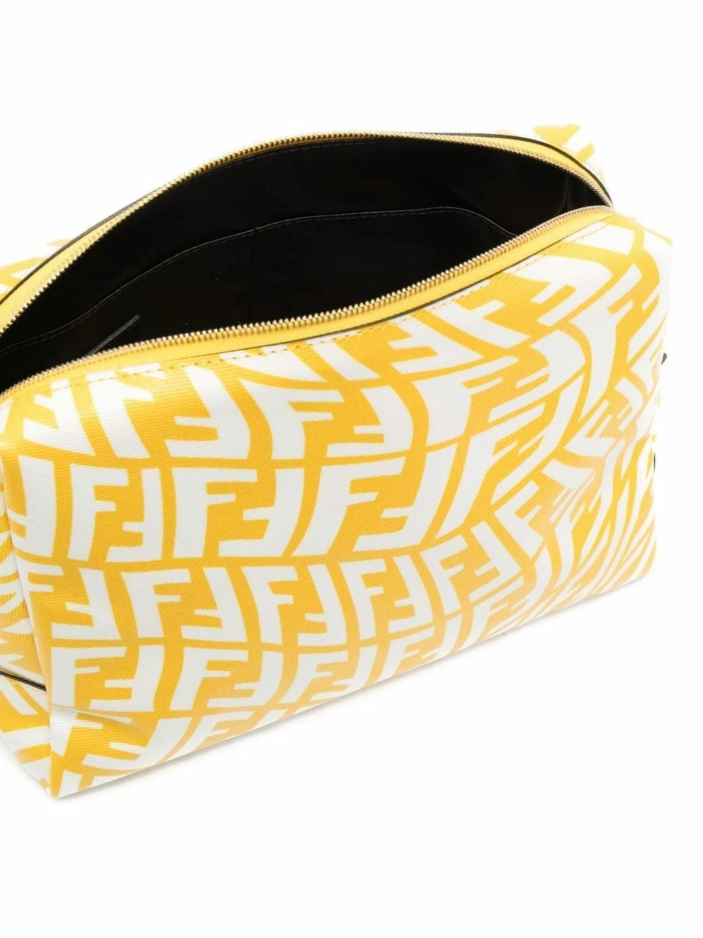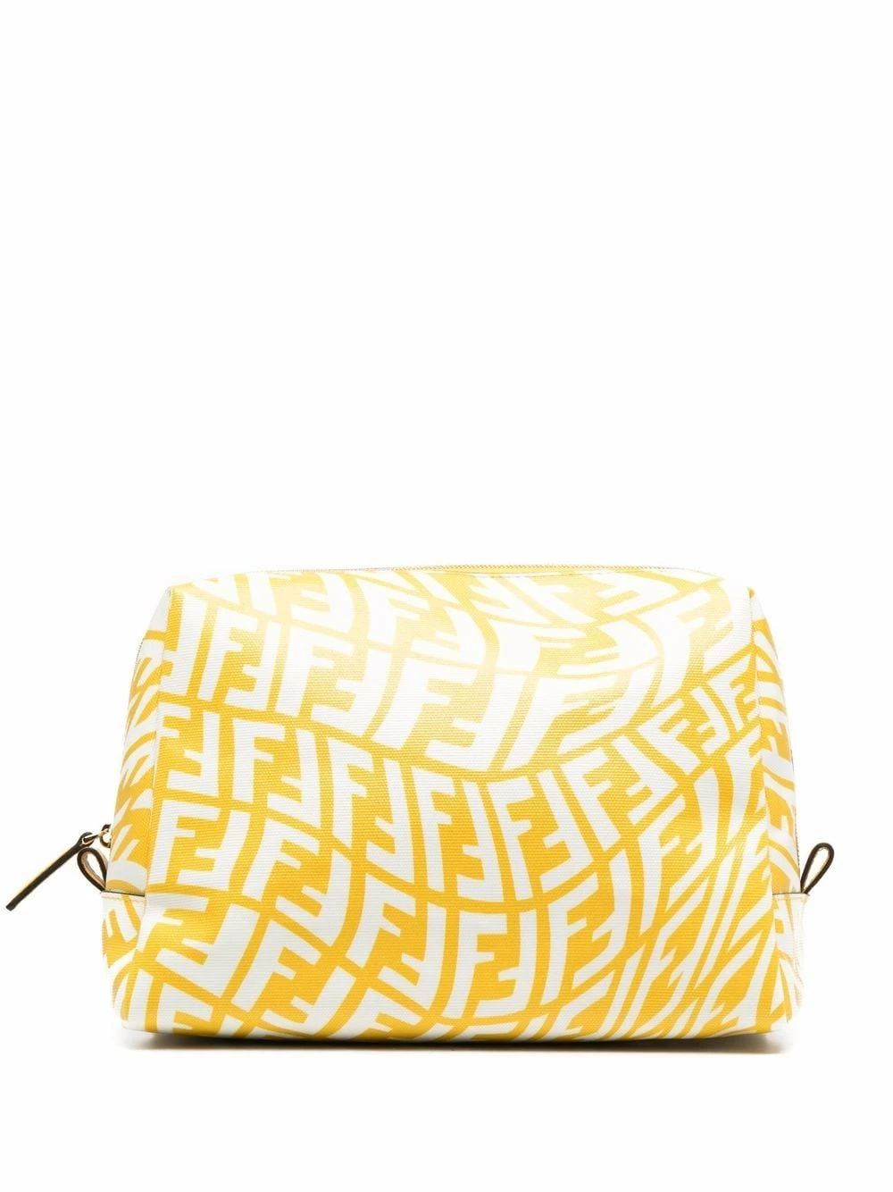 Fendi reworks its legendary brown-hued FF logo for AW21 and the result is this retro-inspired psychedelic FF Vertigo print. It’s seen here in a yellow and white colourway printed on the outside of this coated-canvas makeup bag.