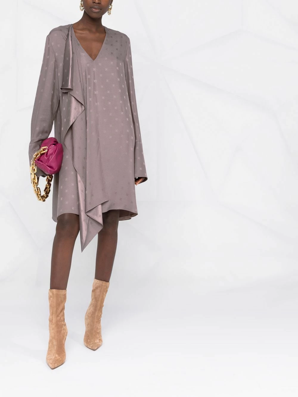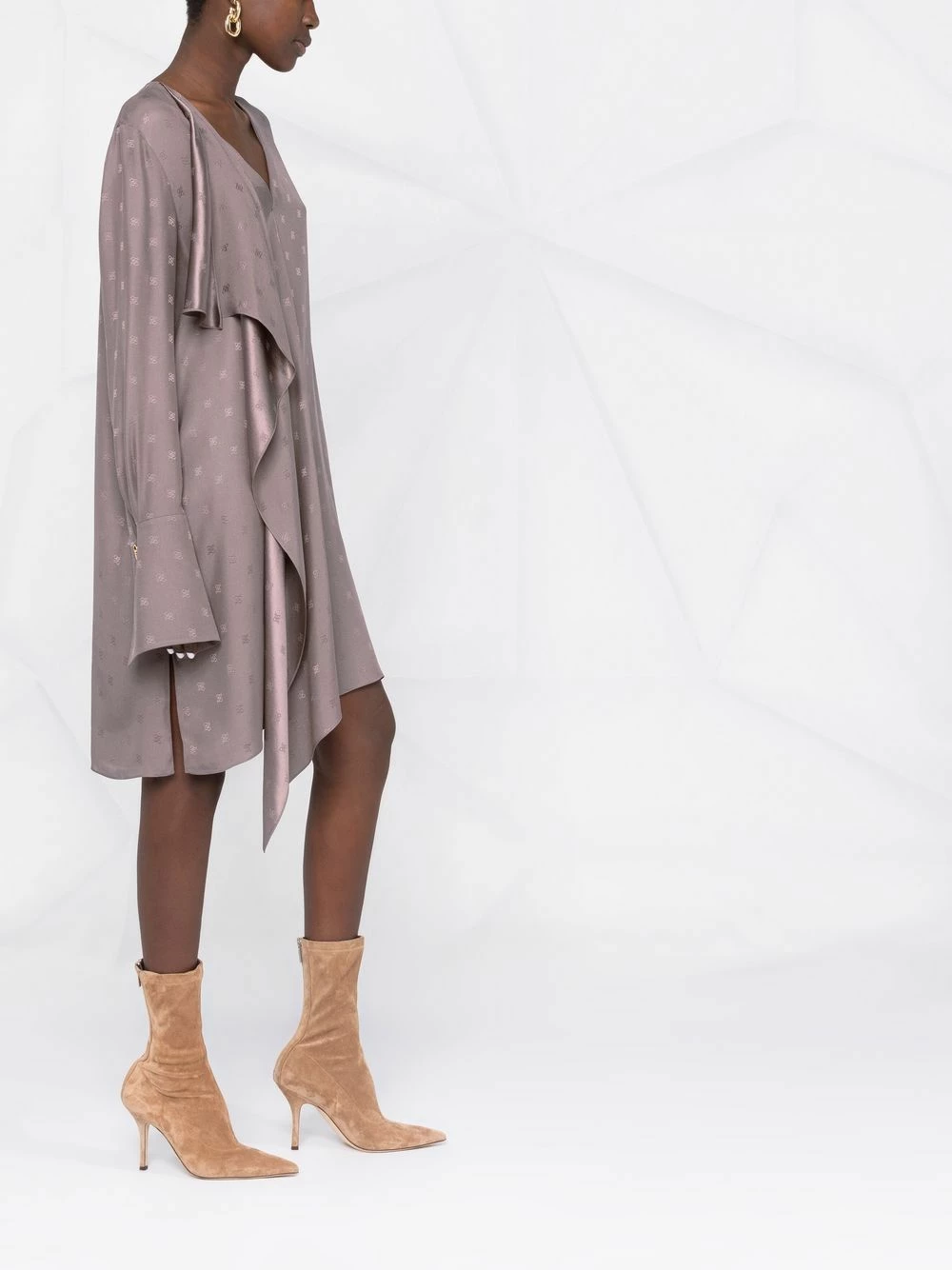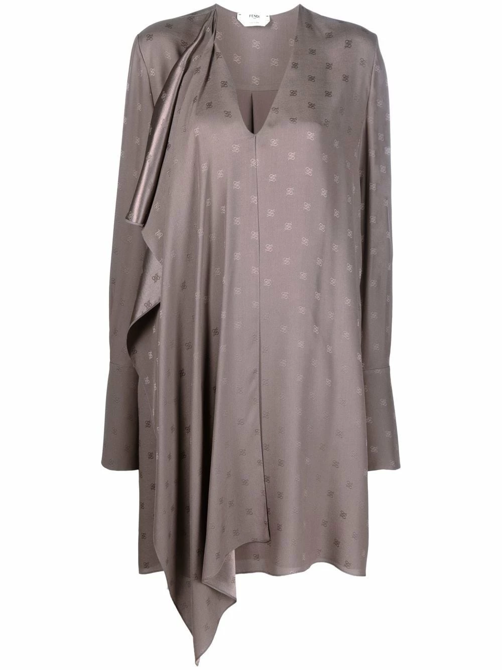 Crafted entirely from muted purple silk, this asymmetric dress from Fendi, coupled with its monogram pattern, makes for a timeless look. Voluminous flair is realised through front draped detailing and its shift style silhouette.