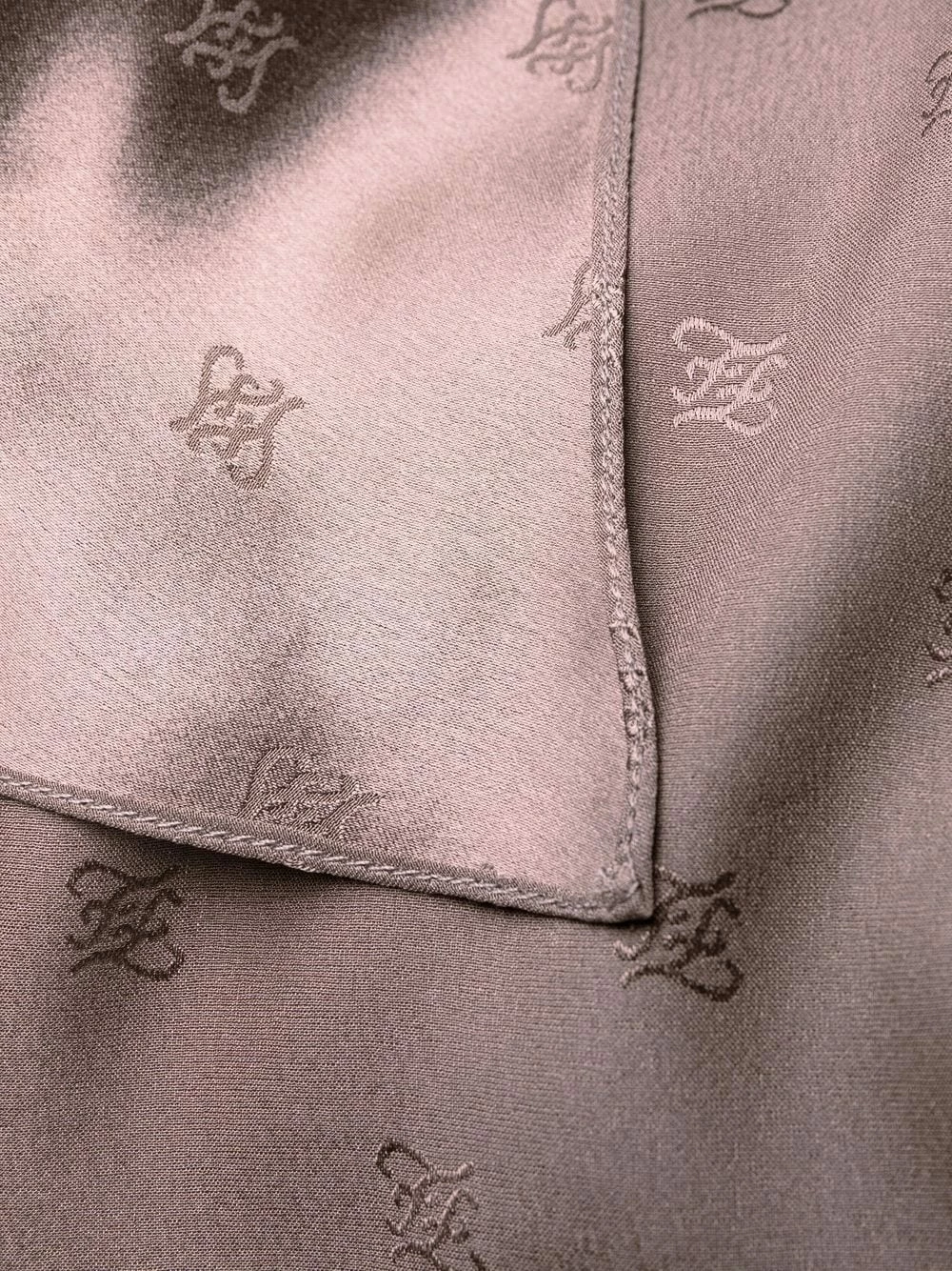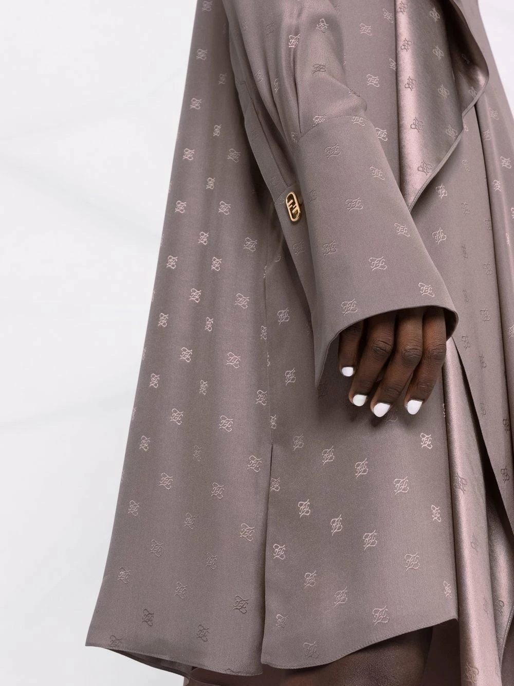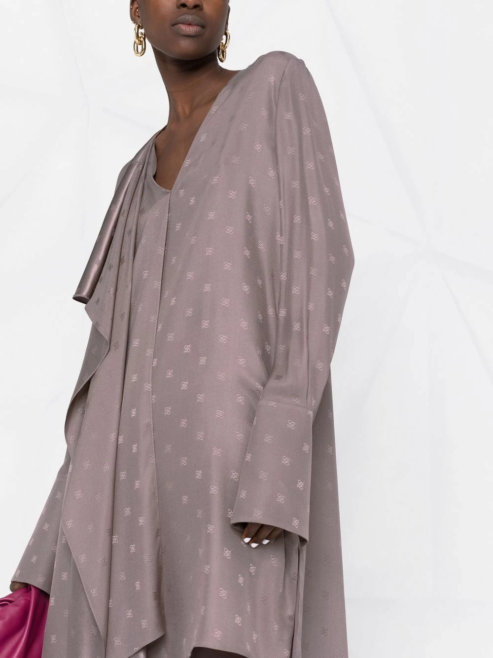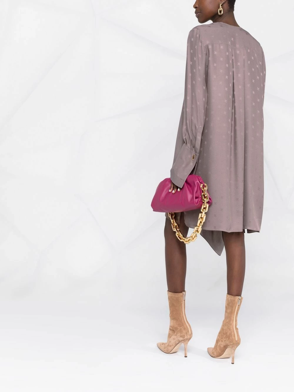 Crafted entirely from muted purple silk, this asymmetric dress from Fendi, coupled with its monogram pattern, makes for a timeless look. Voluminous flair is realised through front draped detailing and its shift style silhouette.