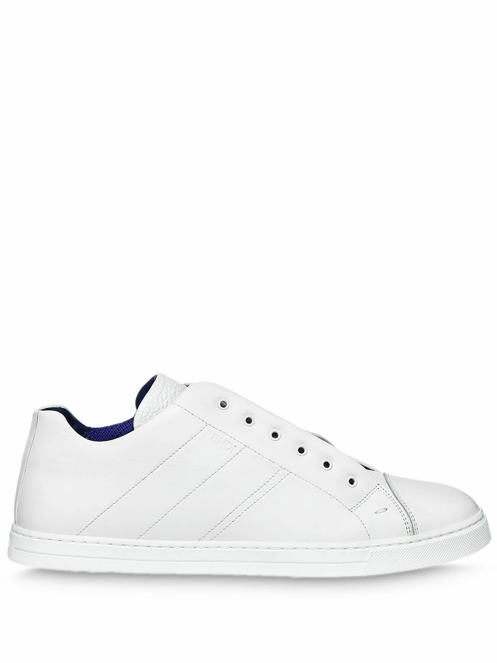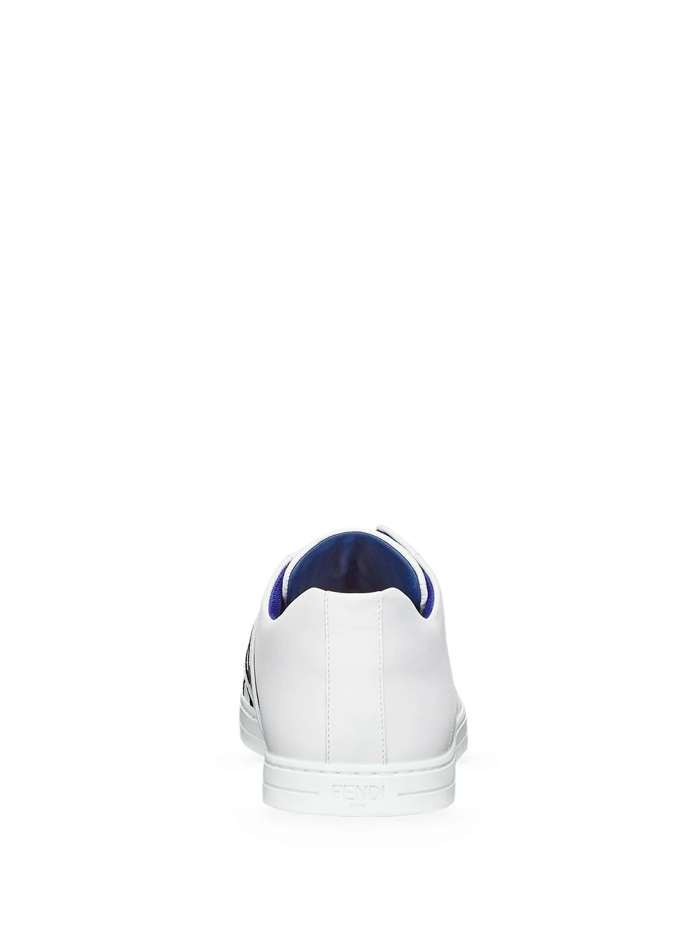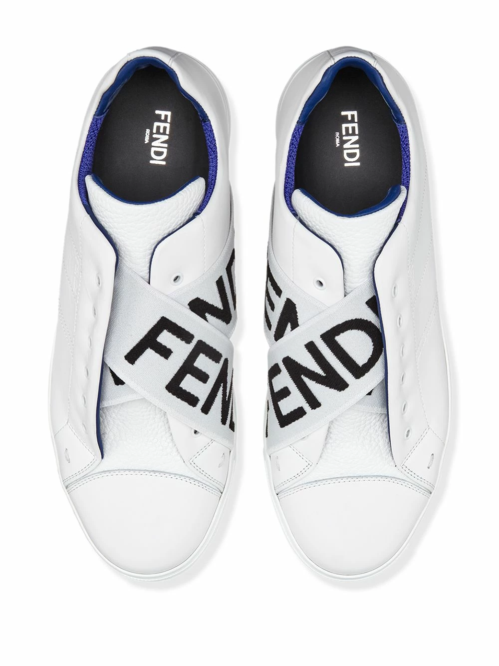 Update your sneaker edit with Fendi. Presented in a crisp white hue, these calf leather logo-strap sneakers have been trimmed with a contrasting blue tone. Kick back in style.