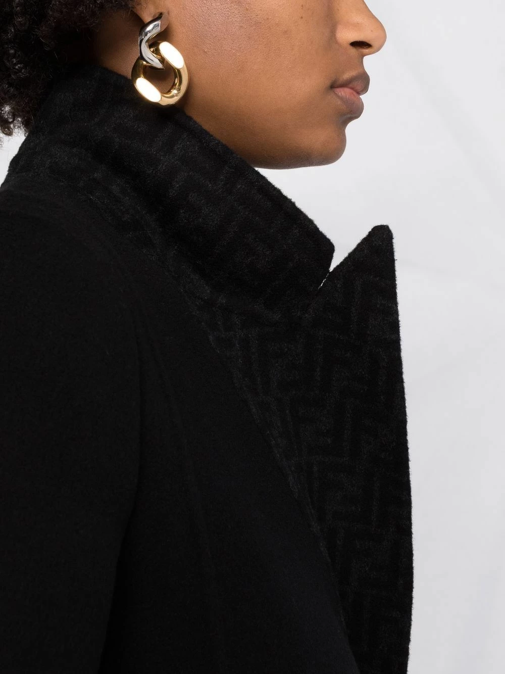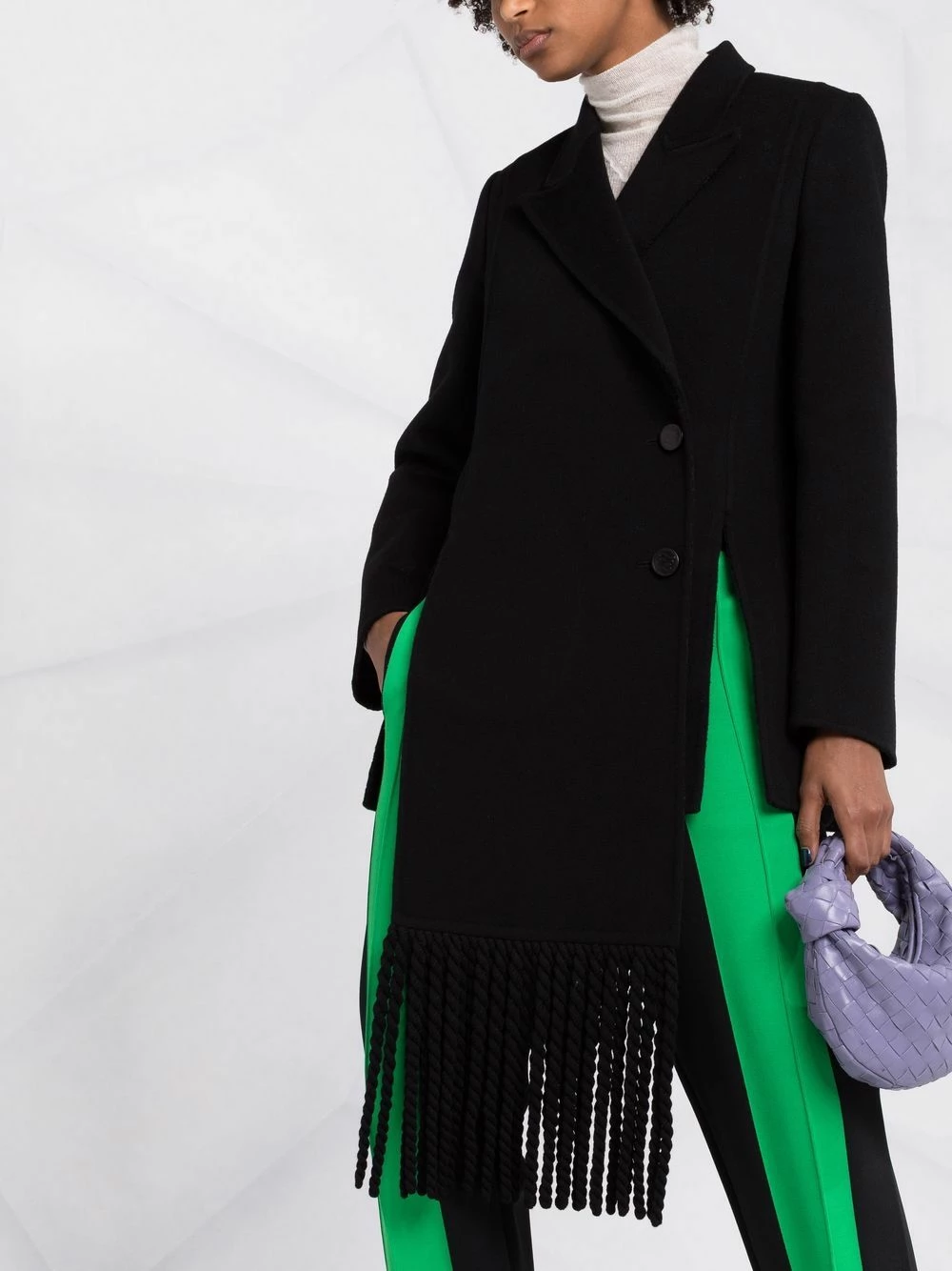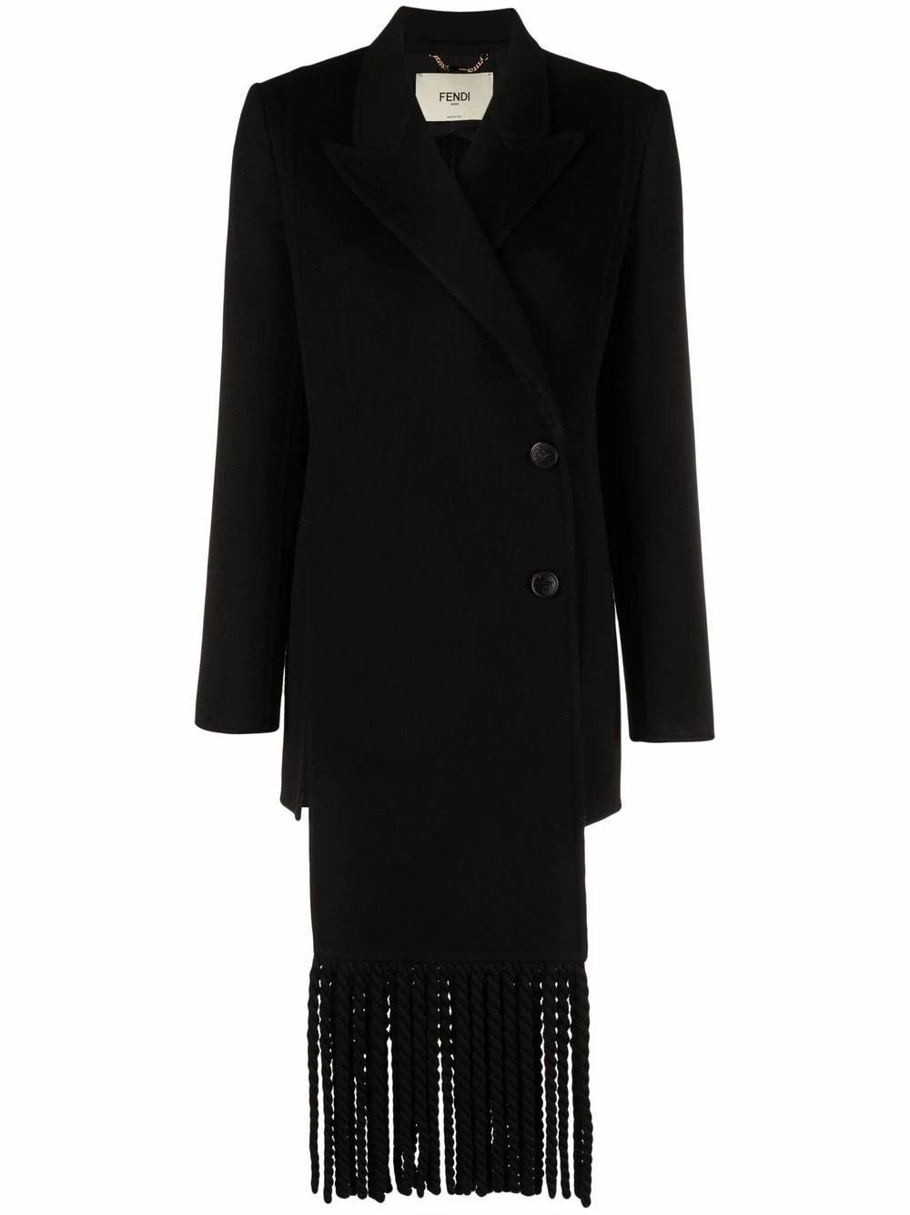 Reworking the classic double-breasted silhouette with a distinctive twist, Fendi introduces this coat as part of their AW21 collection. Presented in classic black, the piece is accented with front fringe detailing in a matching hue.Β