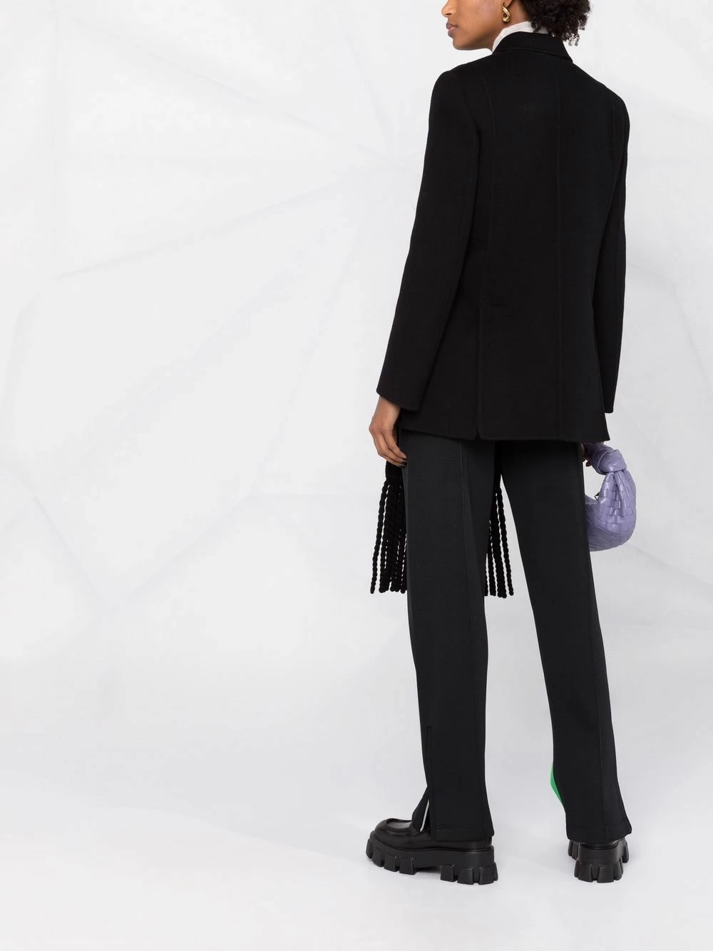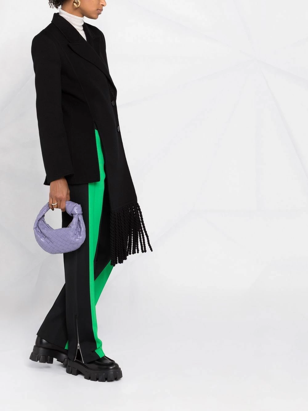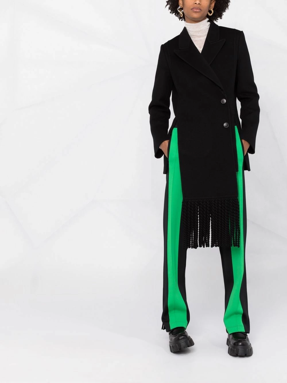 Reworking the classic double-breasted silhouette with a distinctive twist, Fendi introduces this coat as part of their AW21 collection. Presented in classic black, the piece is accented with front fringe detailing in a matching hue.Β