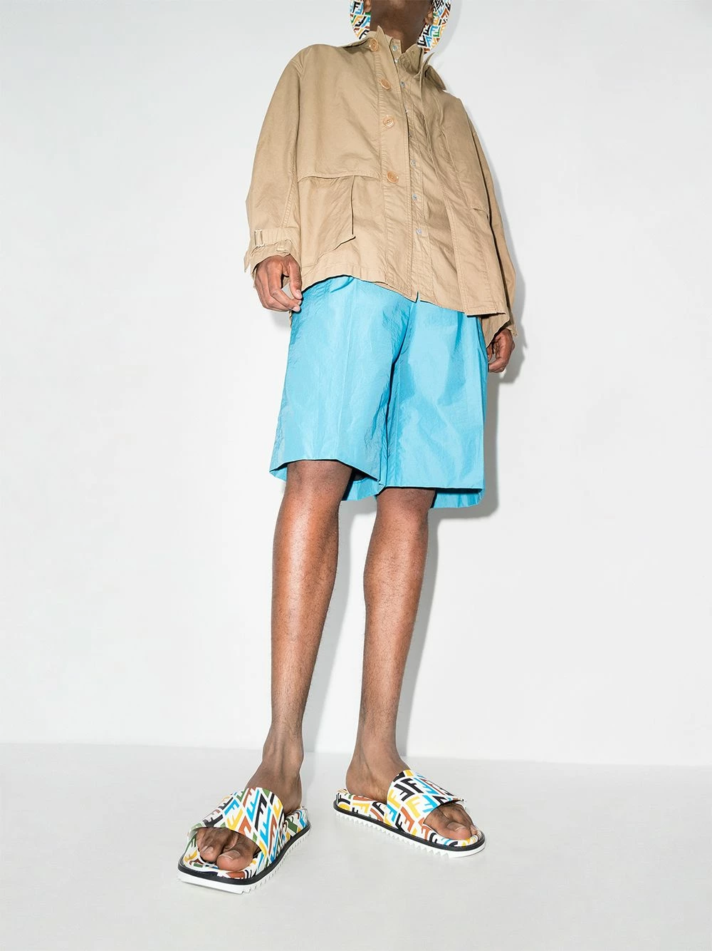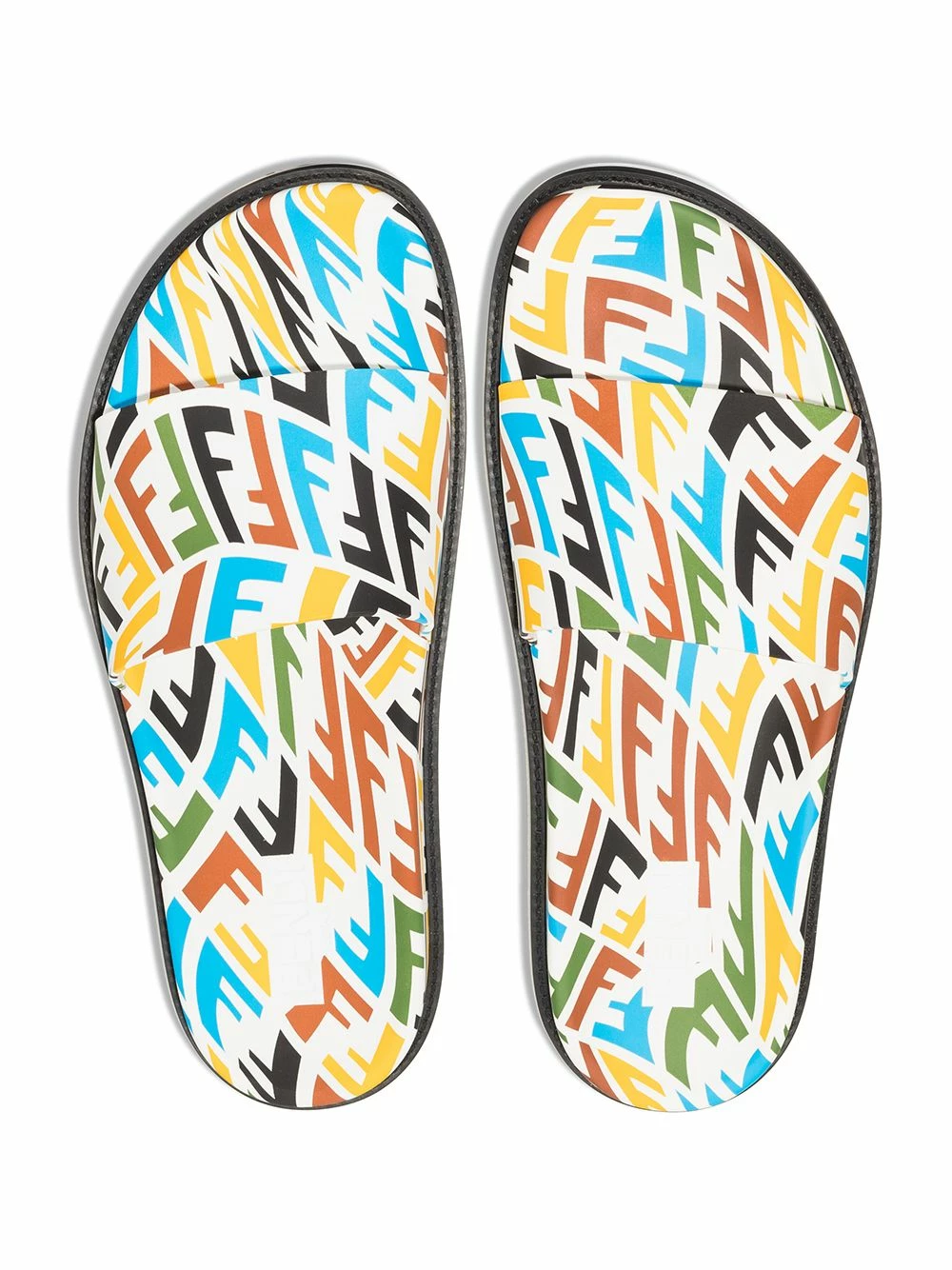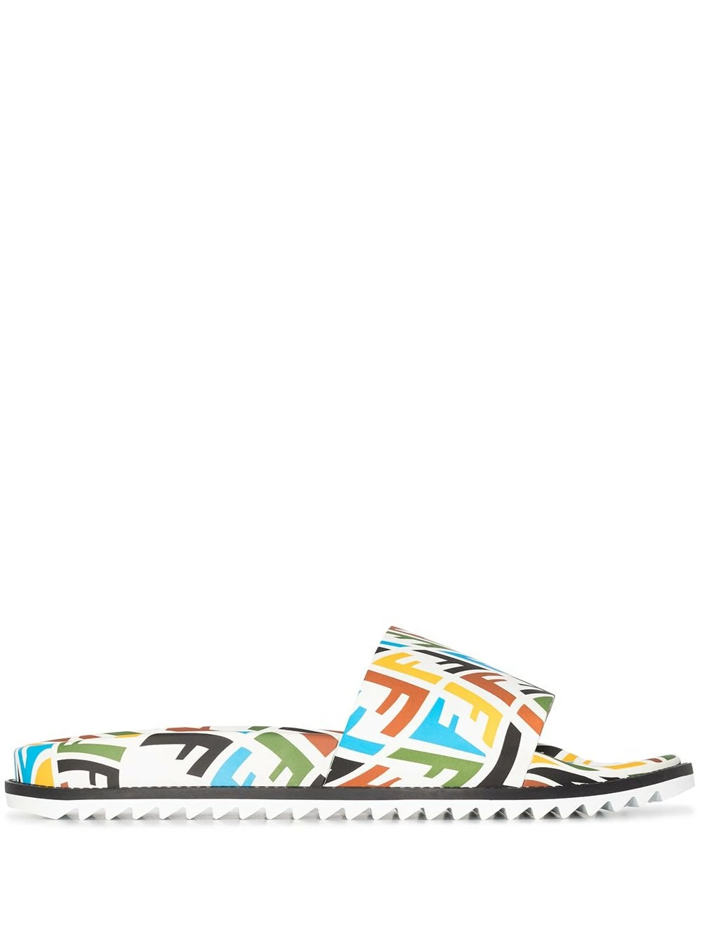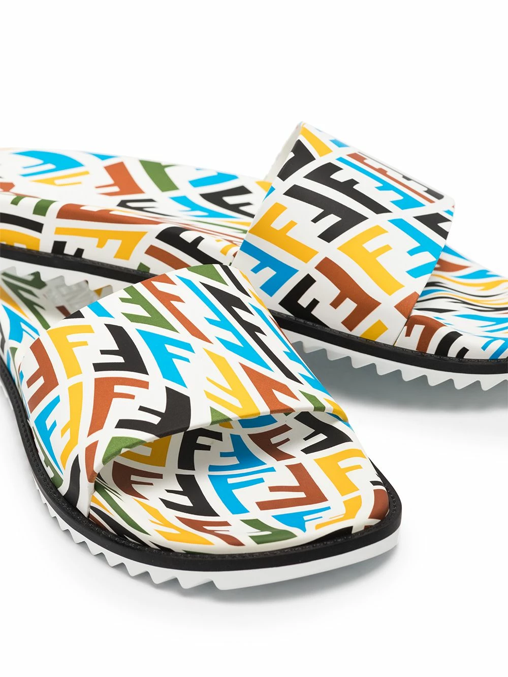Designed by multidisciplinary artist Sarah Coleman, Fendi’s FF Vertigo motif embellishes these flat slides, that feature an open rounded toe and sit atop a ridged rubber sole.