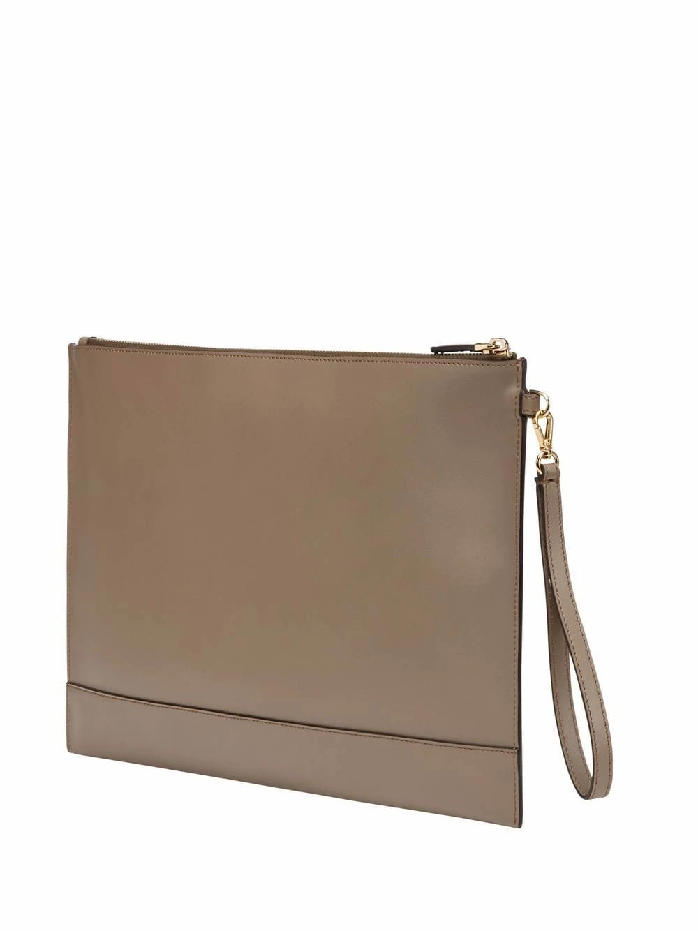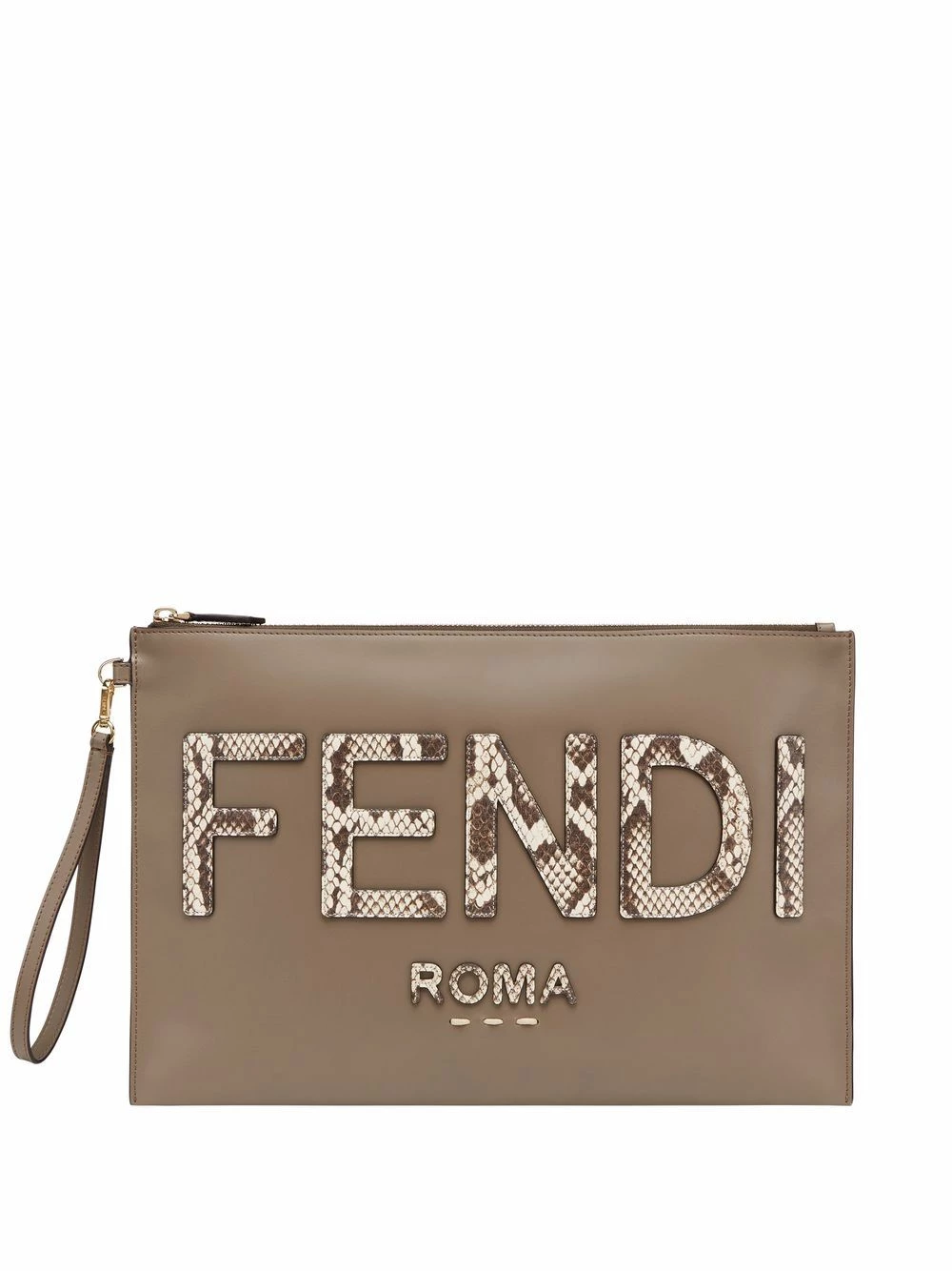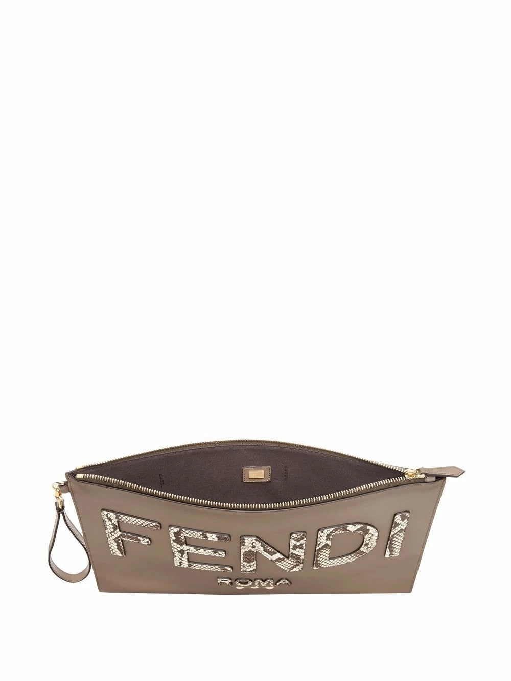 Fendi combines fashion with function. Case in point: this stone grey clutch boasts a sophisticated snakeskin logo whilst the large shape and practical wrist strap allow for ample items to be carried hands-free.Β