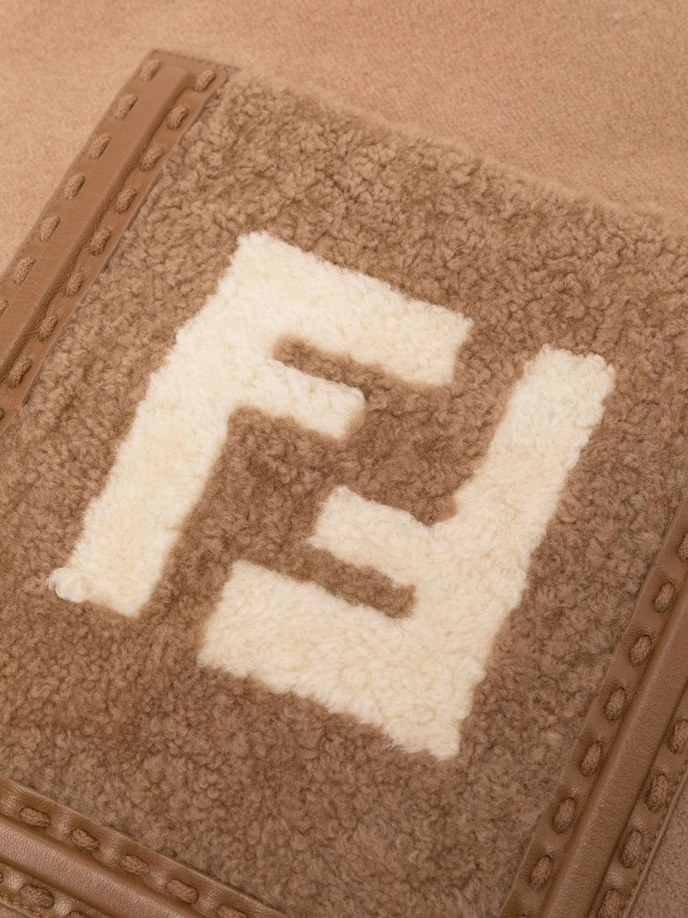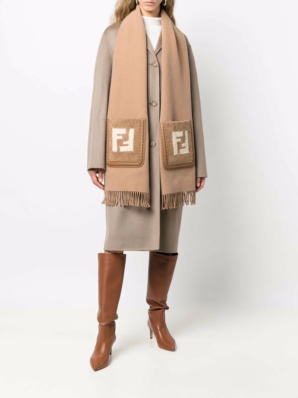 Fendi’s scarf aligns with the brand’s love for logomania. Spun from cashmere and virgin wool for a plush handle, this light brown iteration is punctuated with two shearling patches topped with the brand’s iconic FF motif.