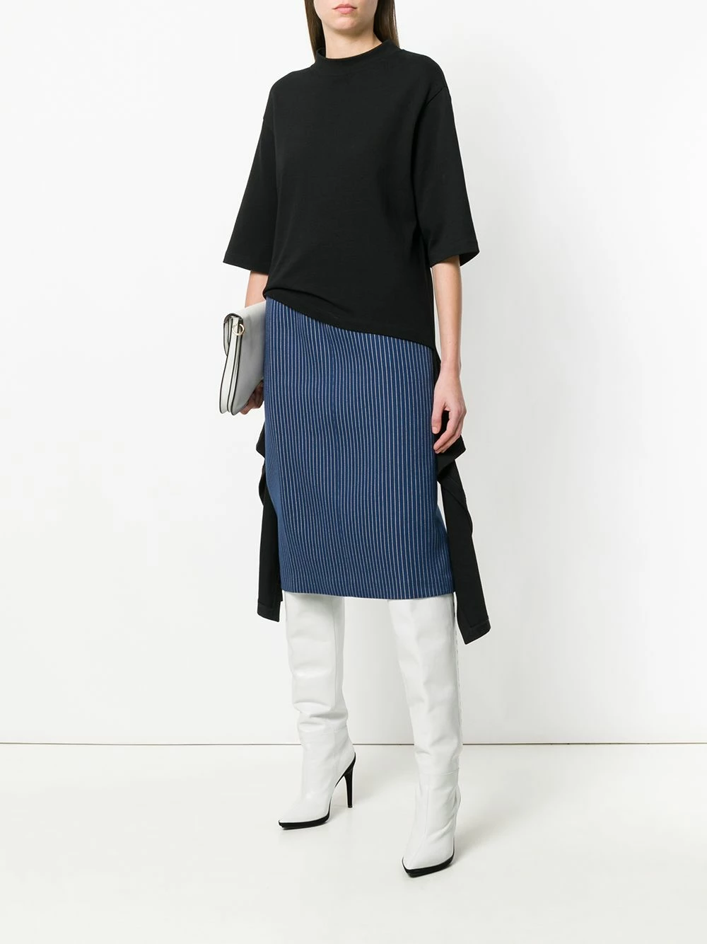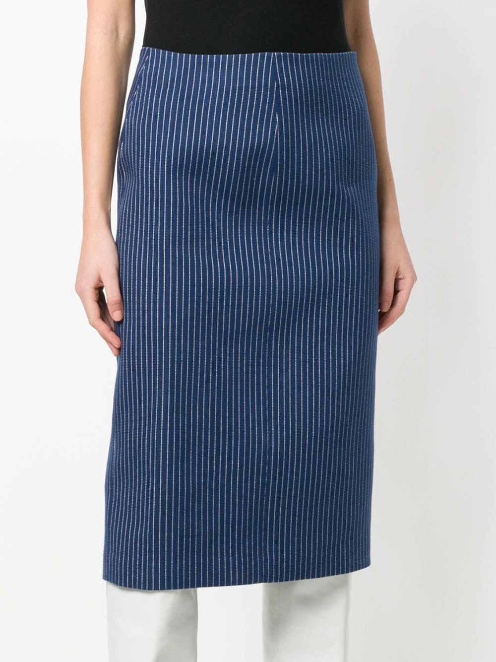 Founded in 1925 by Edoardo and Adele Fendi, fashion powerhouse Fendi is an Italian luxury brand that is undoubtedly famous for its premium leather goods and accessories. Expect to see adorable plush fur Karlito bag charms, angry little monster motifs and swoon worthy, clean lined prΓͺt-Γ -porter. This dark blue and white cotton-silk blend pinstripe midi skirt from Fendi features an a-line shape skirt, pinstripes, a mid-length and a back zip fastening.