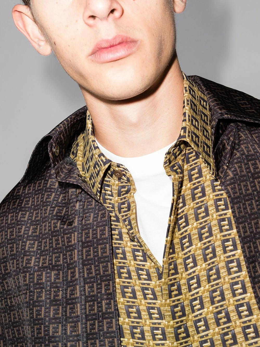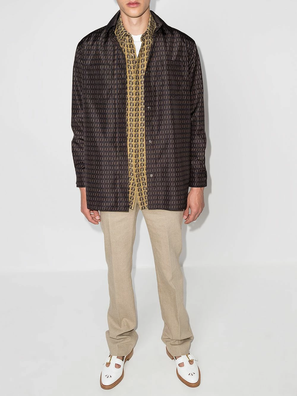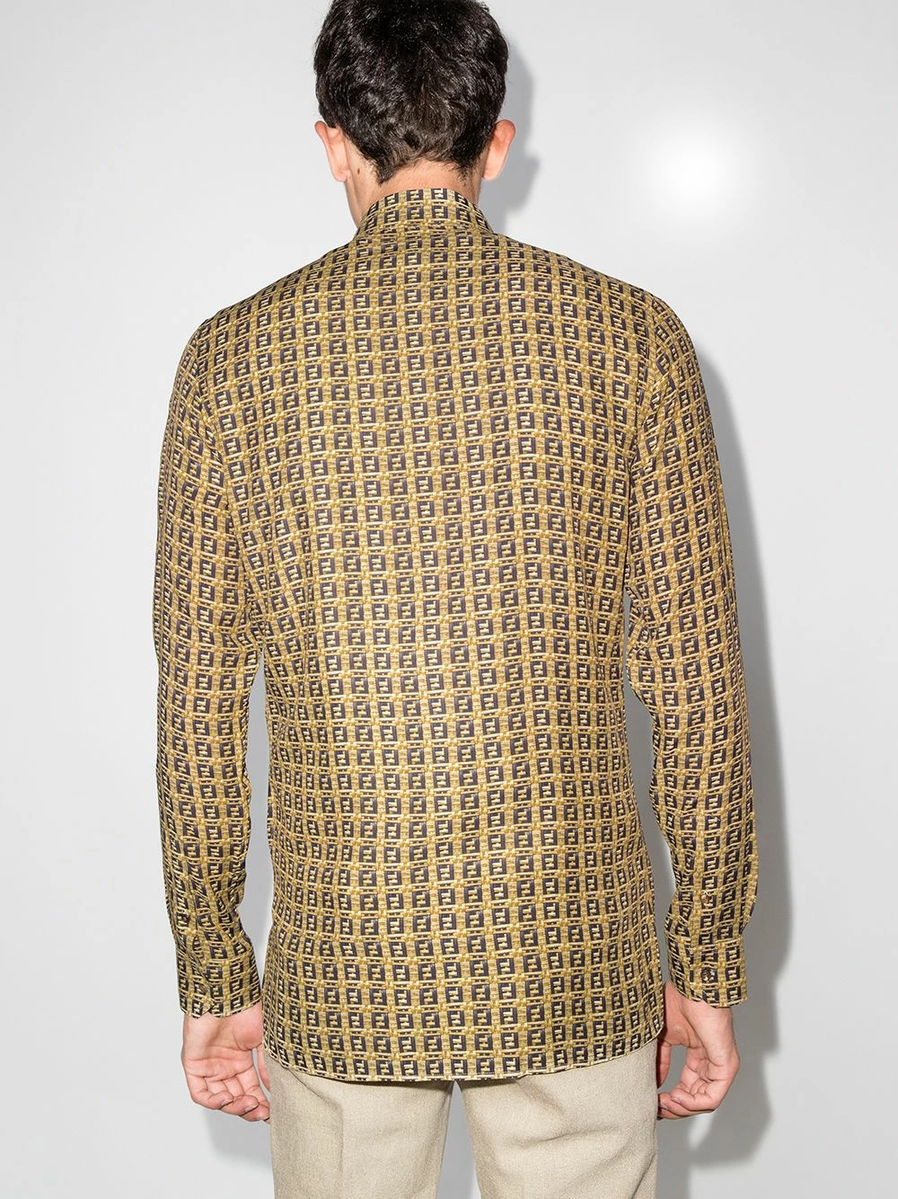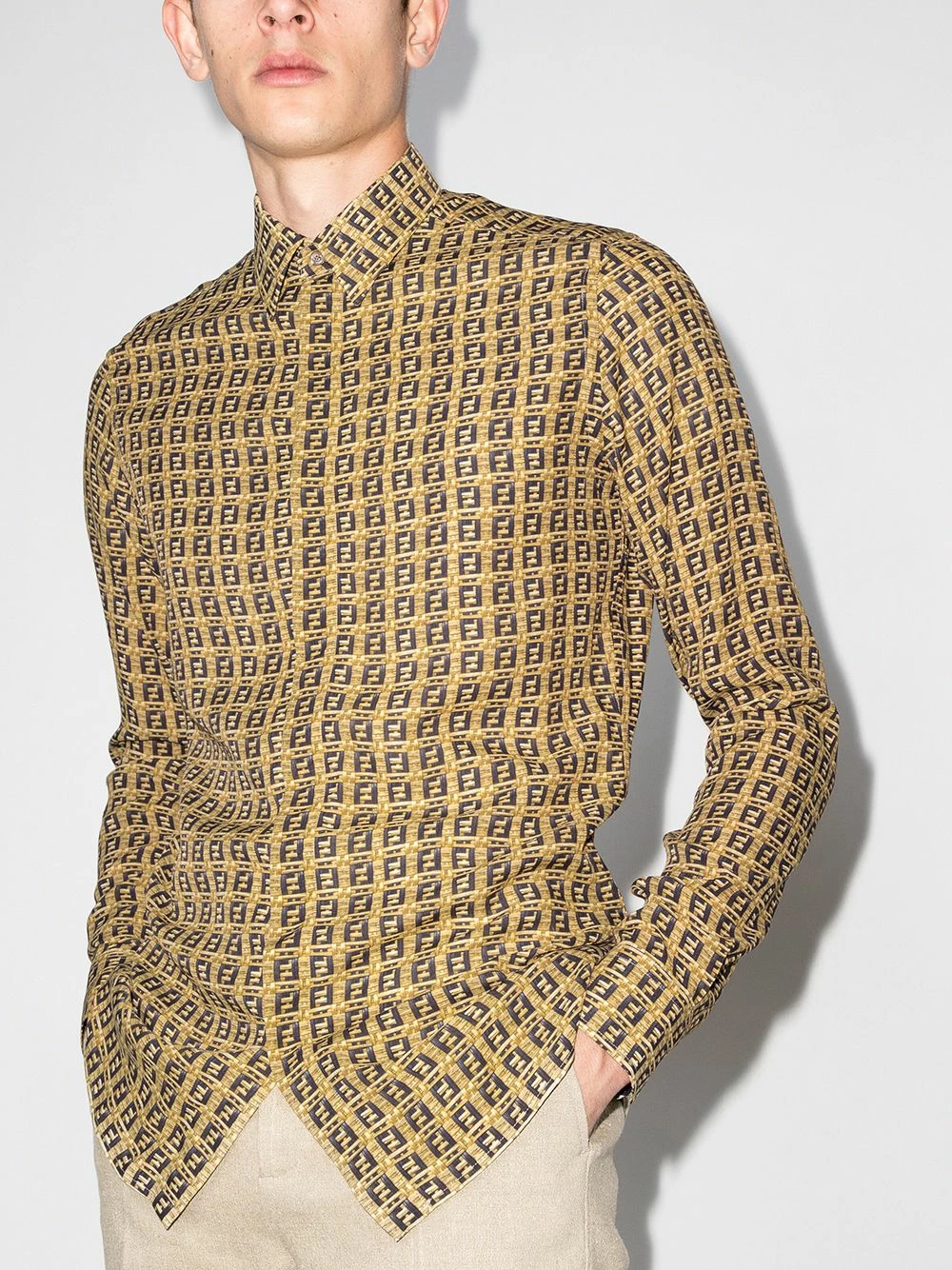Fendi’s SS21 collection sees an iteration of the house’s iconic FF motif, now printed to create the illusion of woven bamboo. This shirt perfectly exemplifies the use of a traditional silhouette paired with that same technique, adding texture and depth to this buttoned number that’s completed with a classic collar and cuff sleeves.