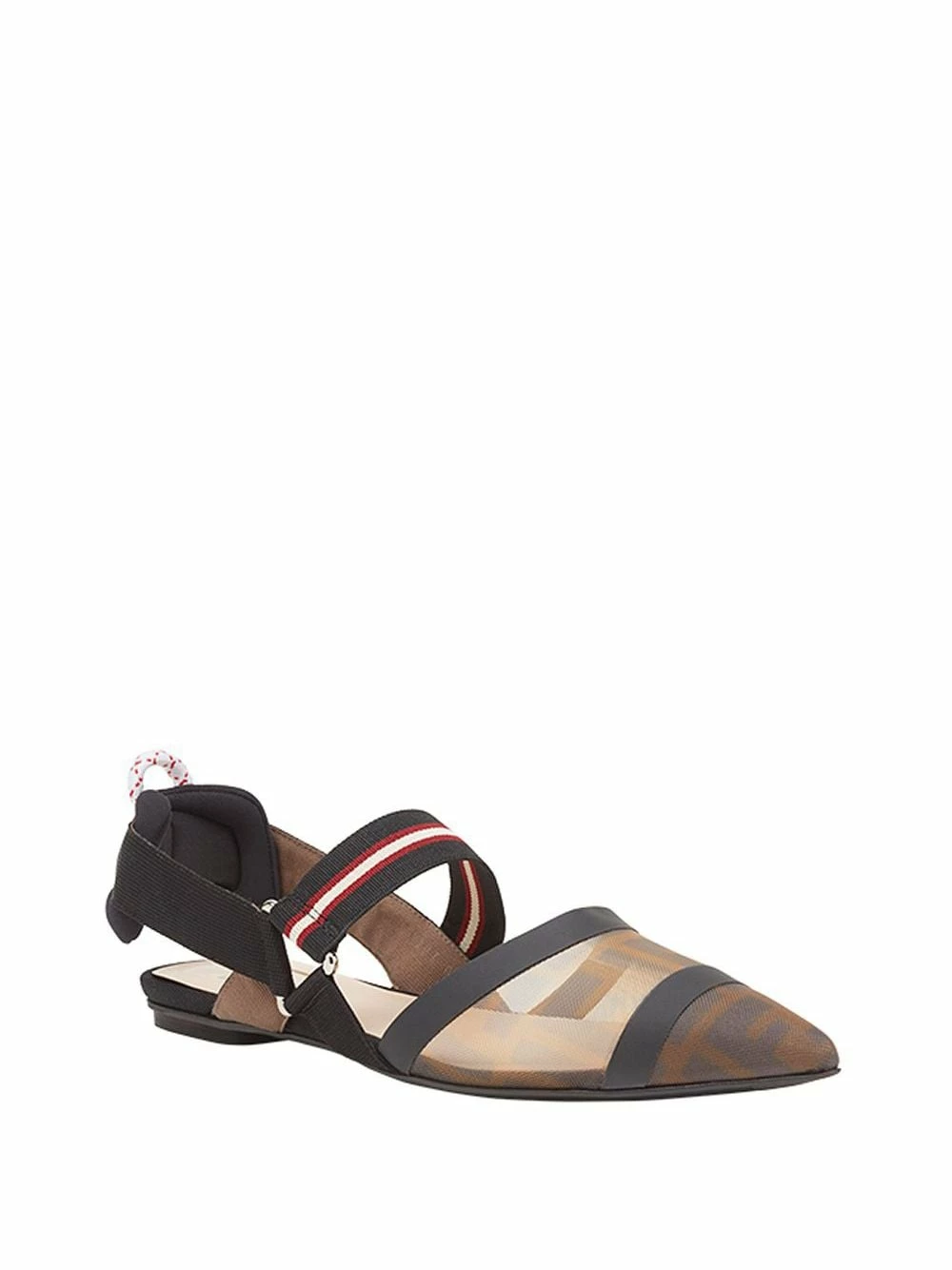 Fendi takes inspiration from Italian Futurism to present the Colibrì theme that is presented in their luxury shoe line. Here the theme is presented on these ballerinas for a unique addition to your wardrobe. Featuring a pointed toe, a branded insole, FF logo print mesh panels and a flat sole, these Fendi ballerinas are finished with elasticated slingback and ankle straps that are detailed with pad and hiking hardware for a sporty touch.