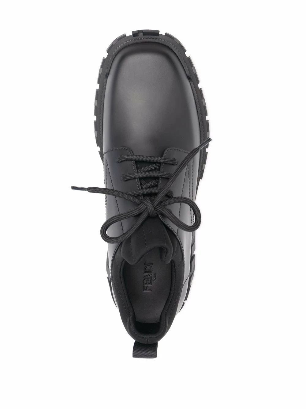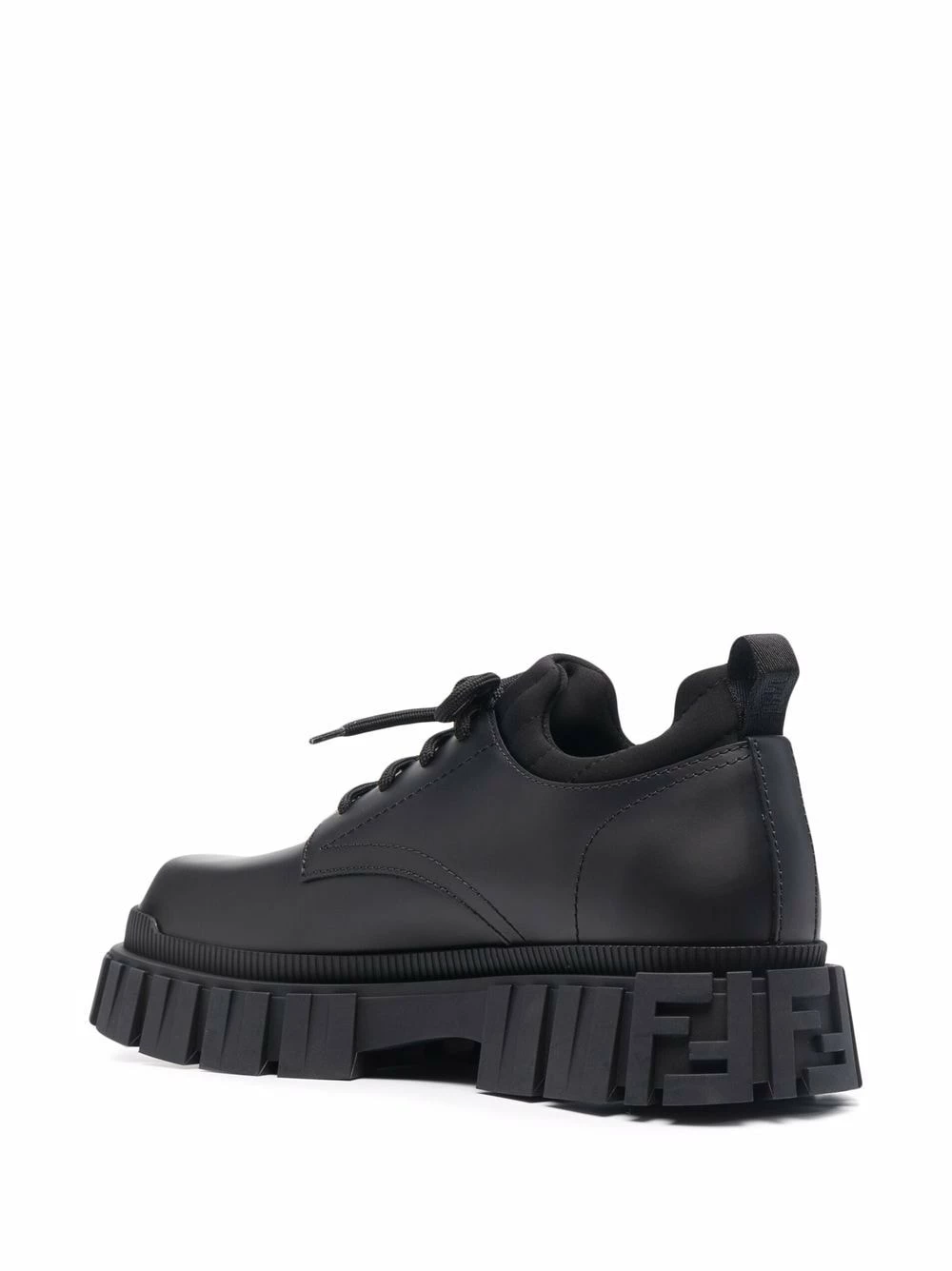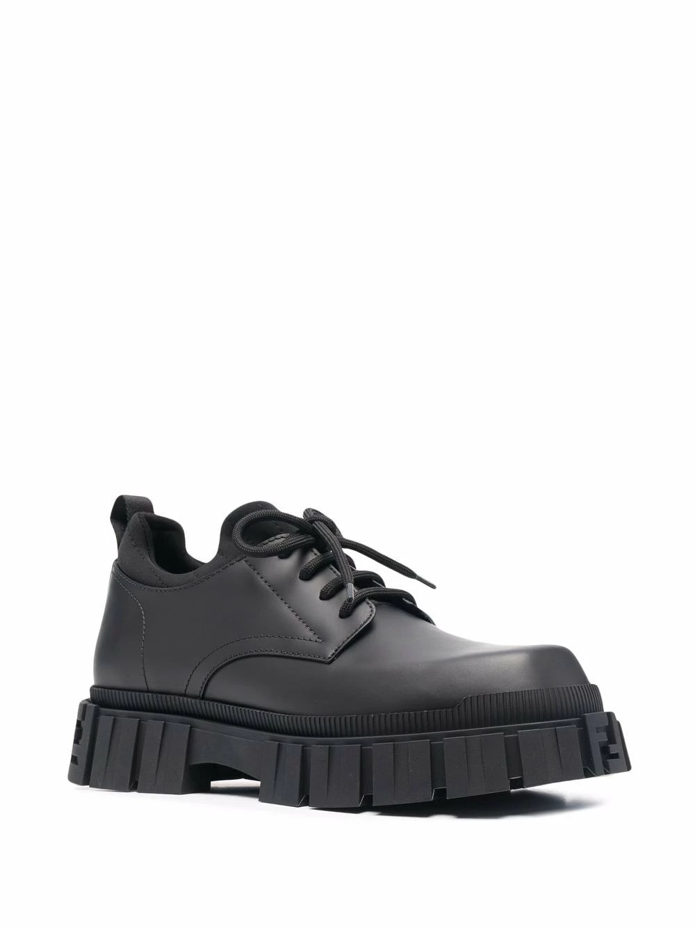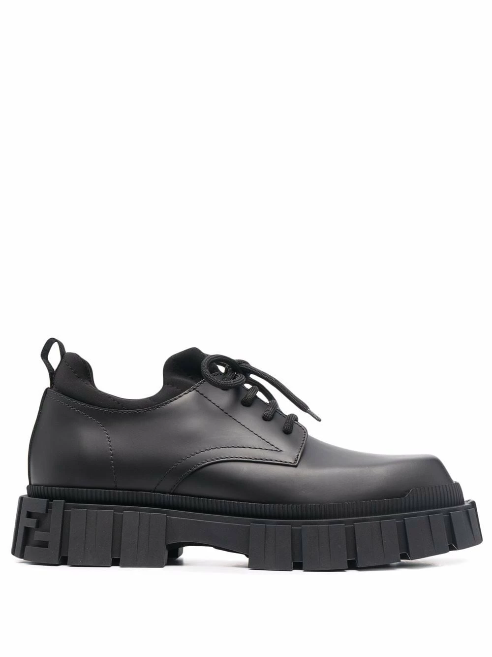 Fendi’s Derby shoes are presented in a panelled smooth leather construction. Set upon a chunky rubber sole, the design displays embossed FF detail incorporated into the ridges of the heel.Β