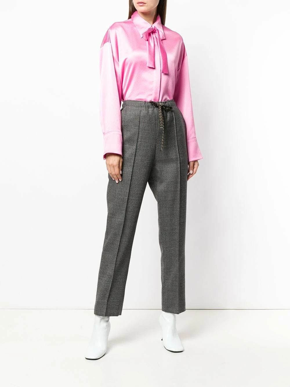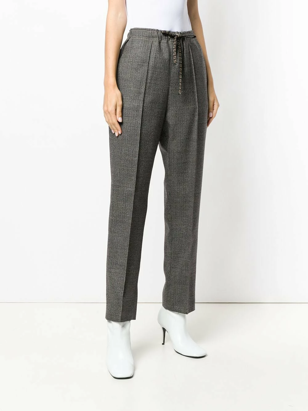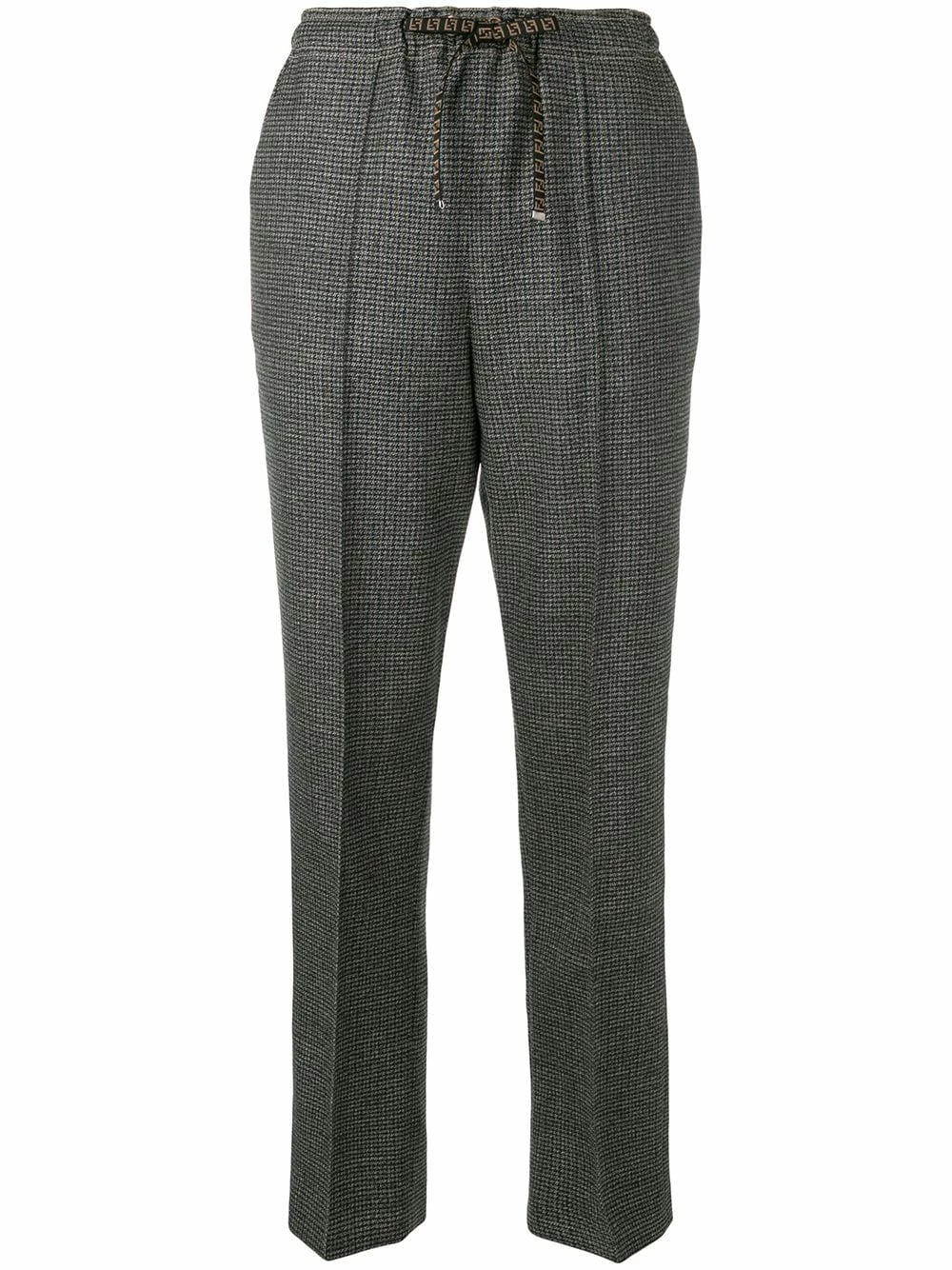 Fendiβs newest collection is stunningly adorned with beautiful and alluring patterns and prints. By mixing a joyful palette of colours with delicate and unique embroideries and motifs, Fendi has done it once again. Crafted from a grey virgin wool, this microcheck drawstring trousers from Fendi features an elasticated drawstring waist branded with the FF logo, a tailored design and side slit pockets.