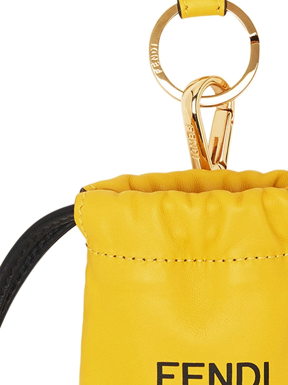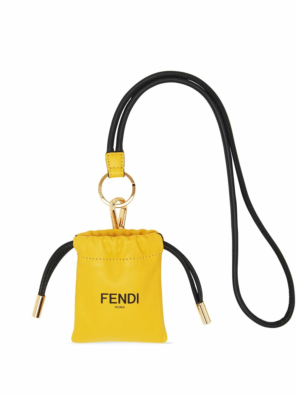 Forget classic wallets. The new way to store your monetary possession is in a pouch. Get ahead of the curve in this keyring detachable strap drawstring design from Fendi.Β