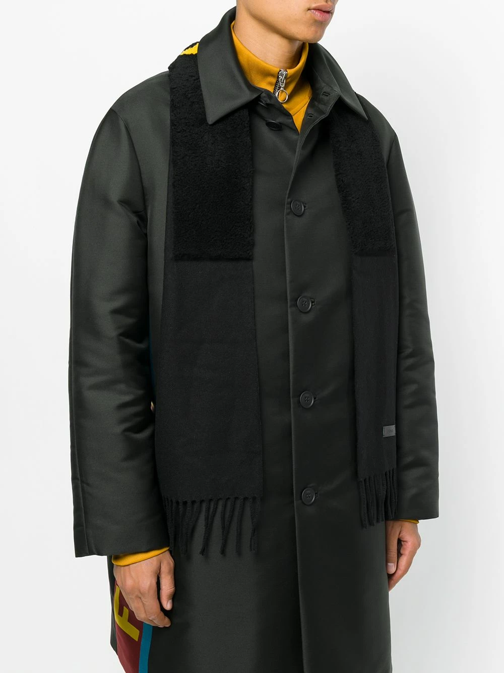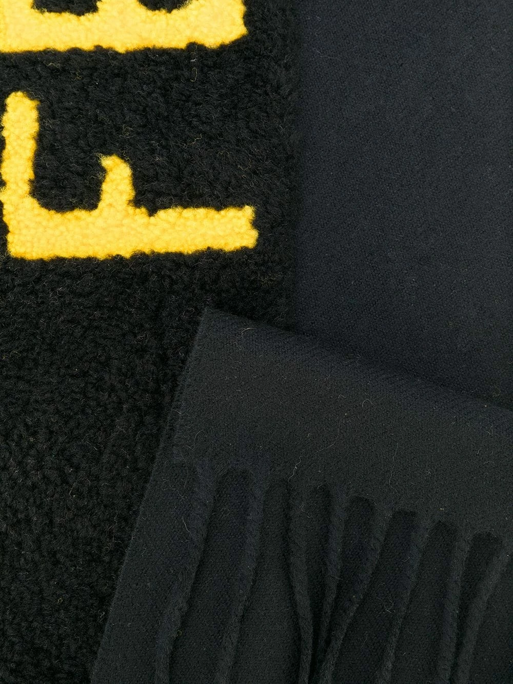 Keep yourself warm this Autumn Winter with this Fendi embroidered scarf. Crafted in Italy from black wool, this scarf showcases a lamb fur shearling insert with “Fendi” embroidered in a bright yellow at the nape of the neck. This scarf also features a fringed hem and an embroidered logo patch.