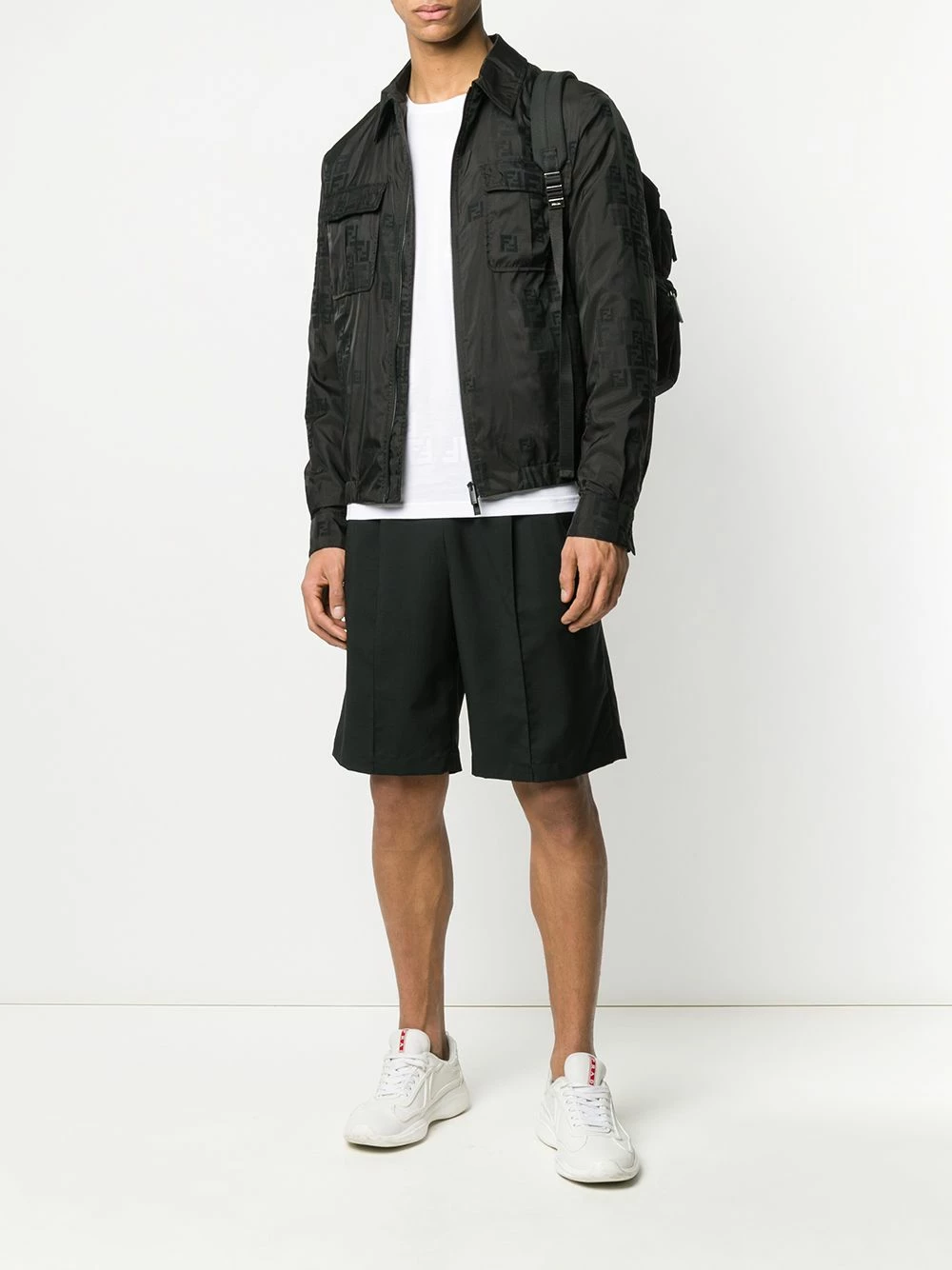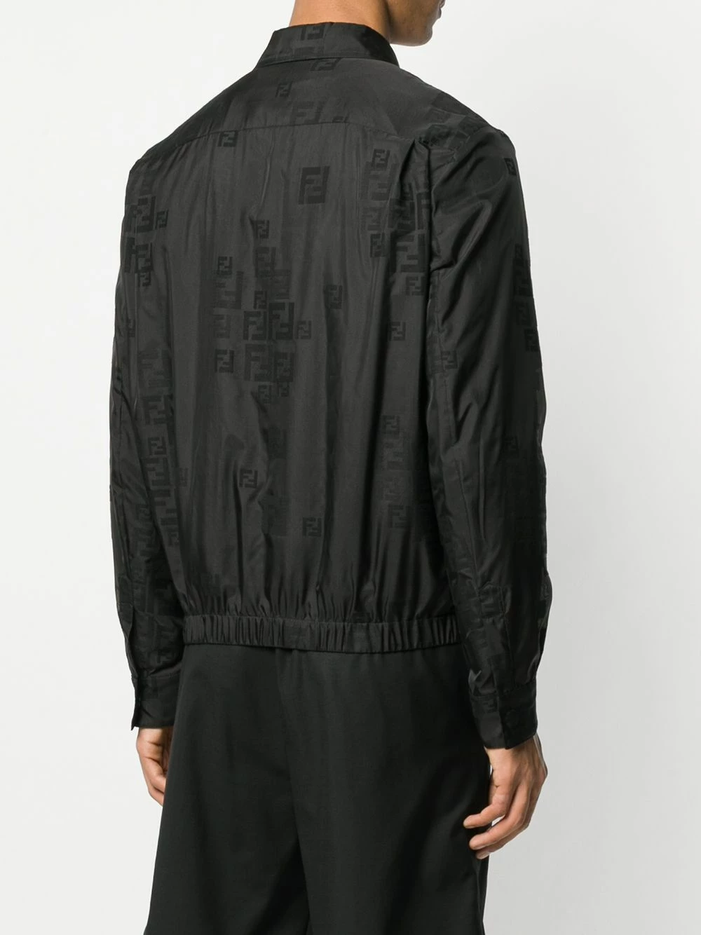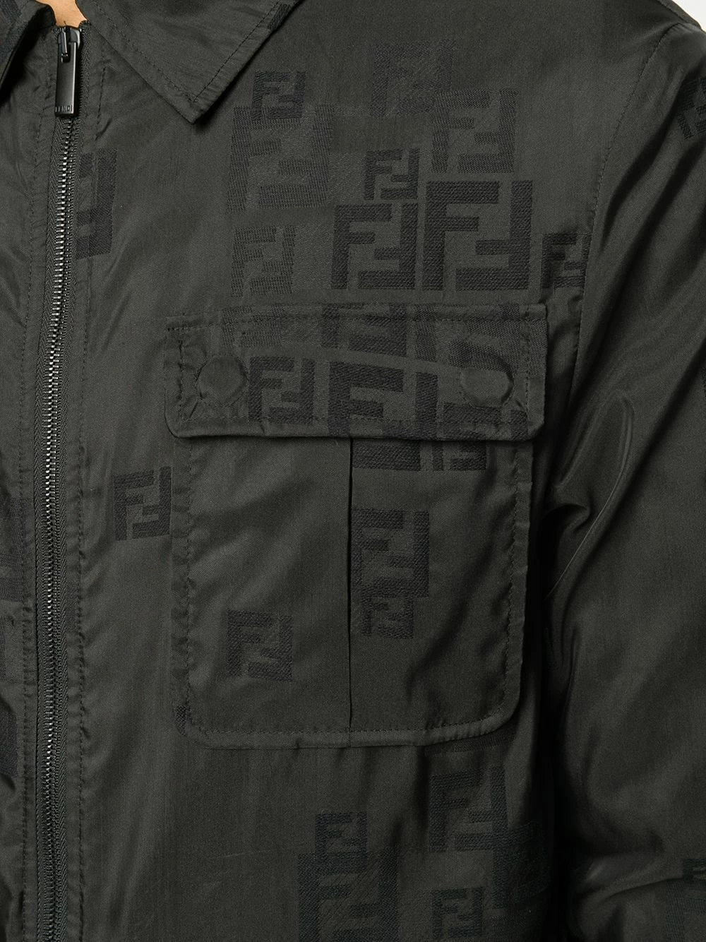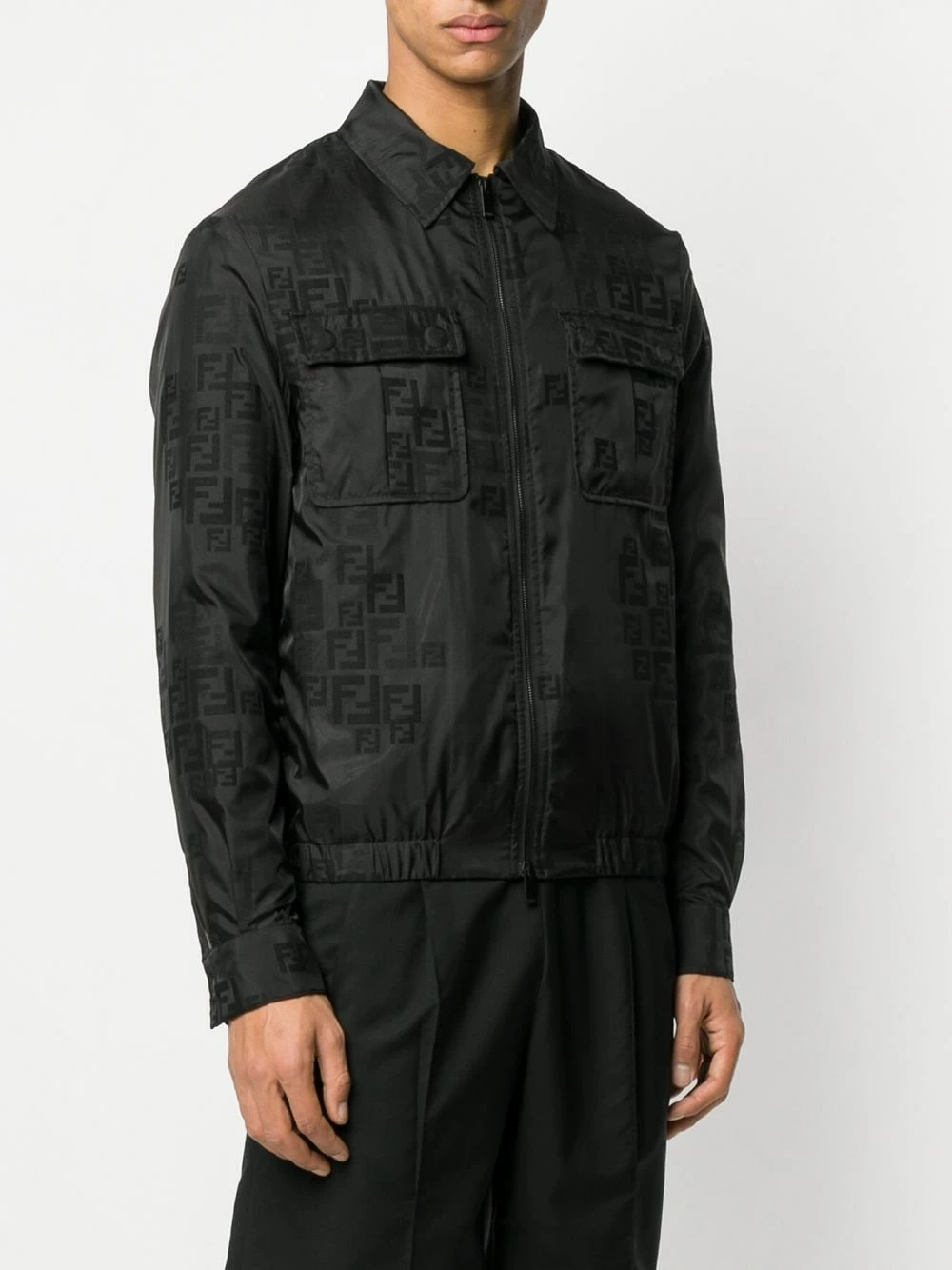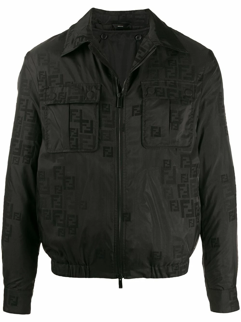 Fendi likes to make themselves known and not a piece goes by without being branded. Crafted from a black cotton-blend, this expertly constructed jacket showcases subtle FF jacquard detailing to the front and back. If you know, you know. Featuring a classic collar, a front zip fastening, front flap pockets, long sleeves, button cuffs, an elasticated hem and an embroidered design.