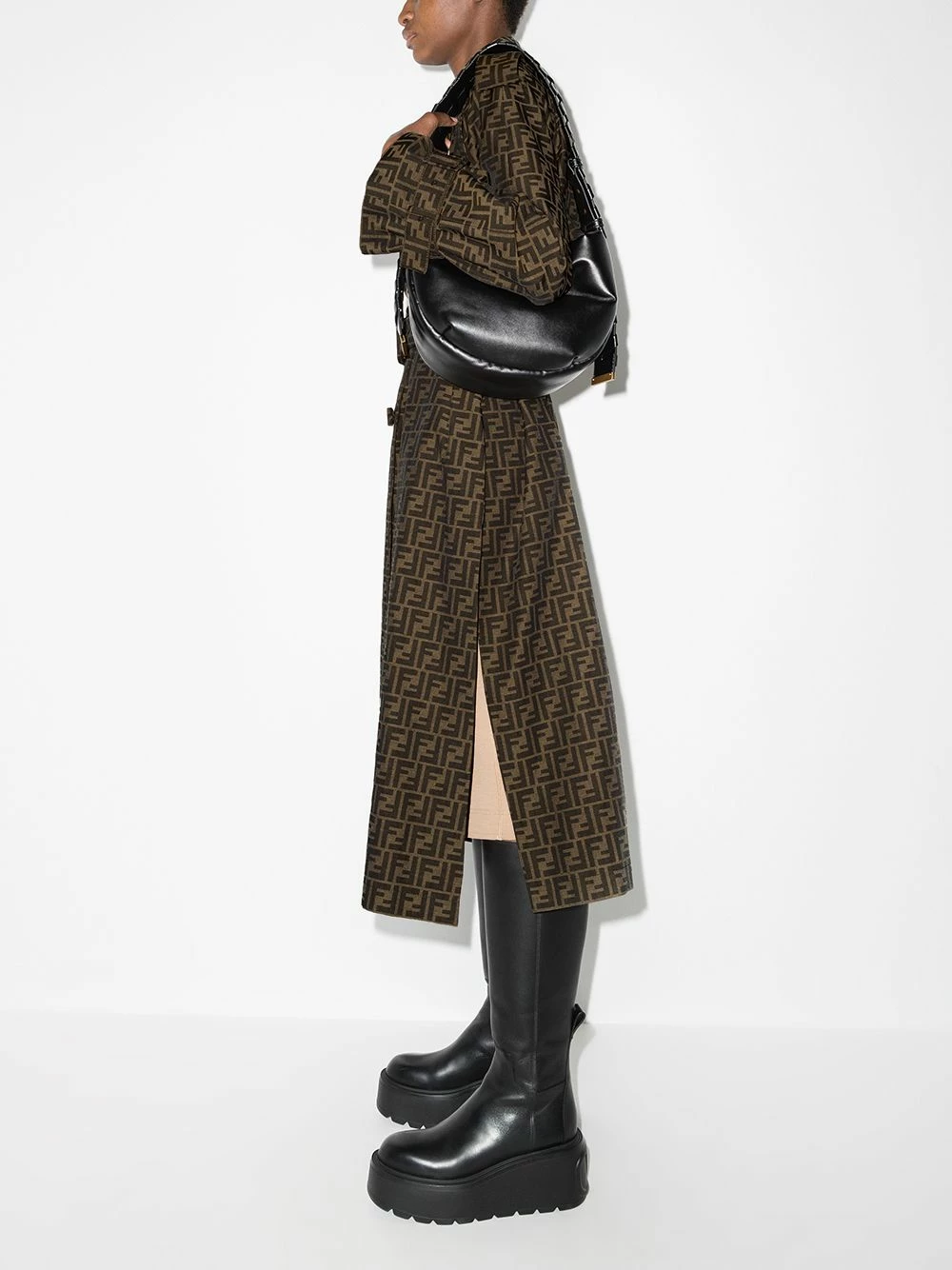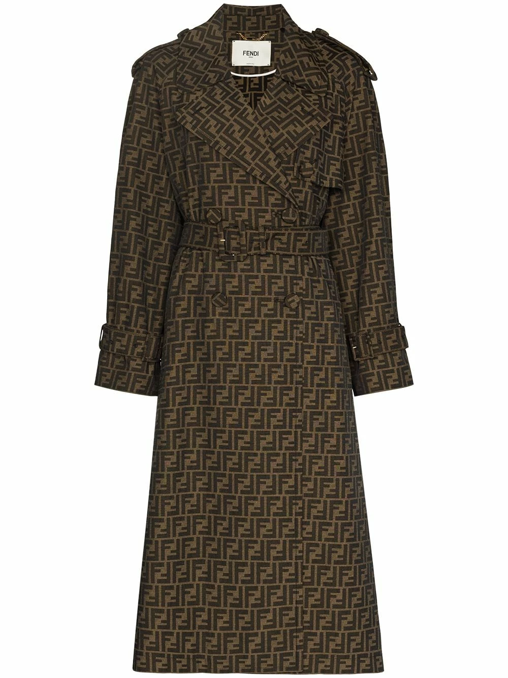 Fendi transforms the classic silhouette by adding an iconic branding detail. Crafted from cotton and cut to a traditional double-breasted profile – note the storm flap and epaulettes – this piece is fully adorned with the unmistakable FF-logo for an instantly recognisable look.
