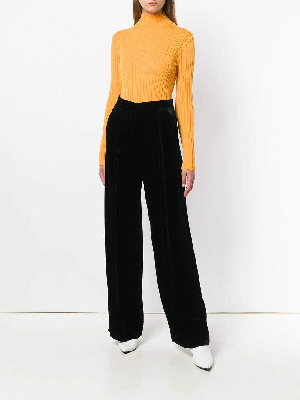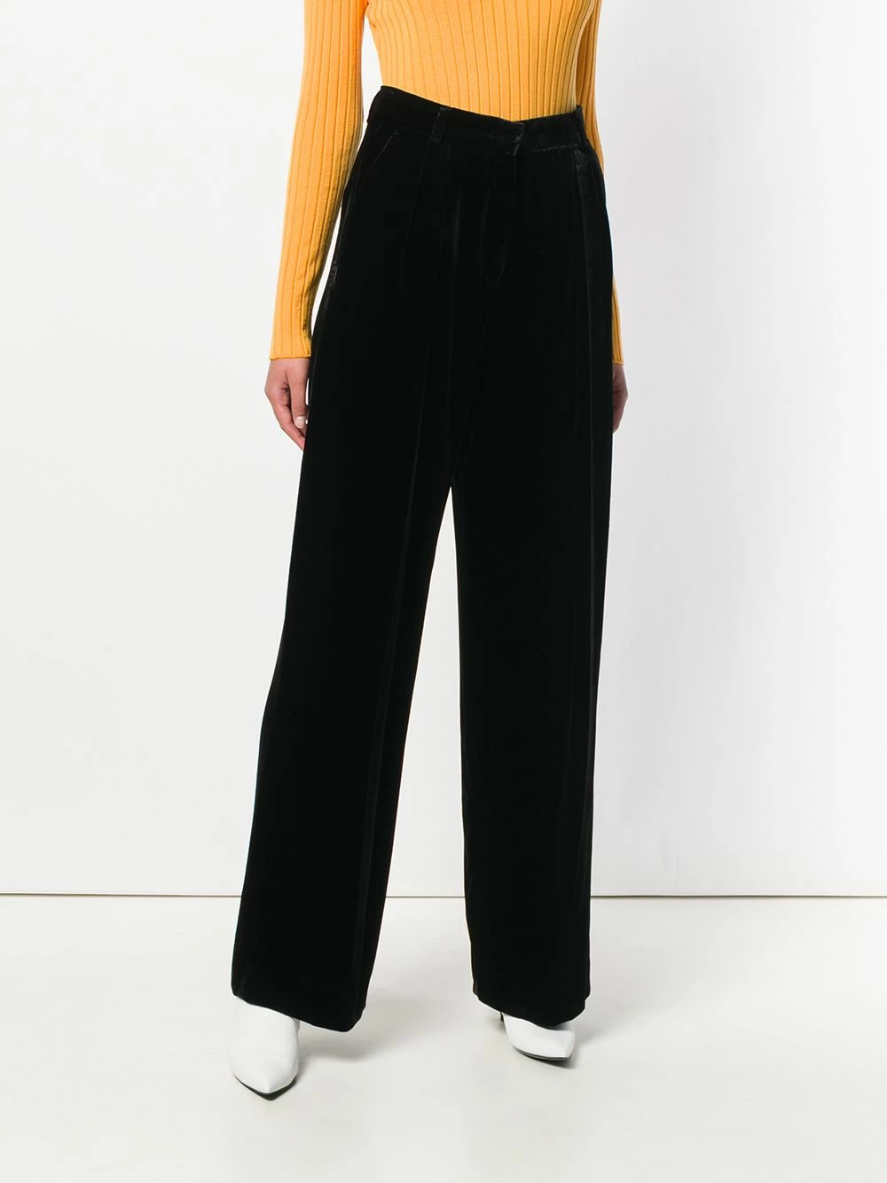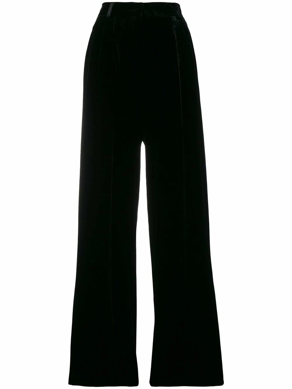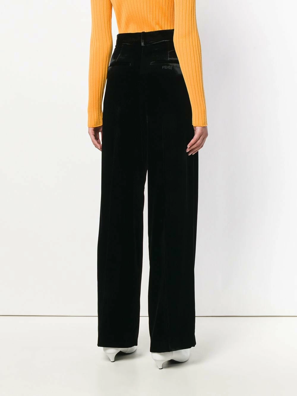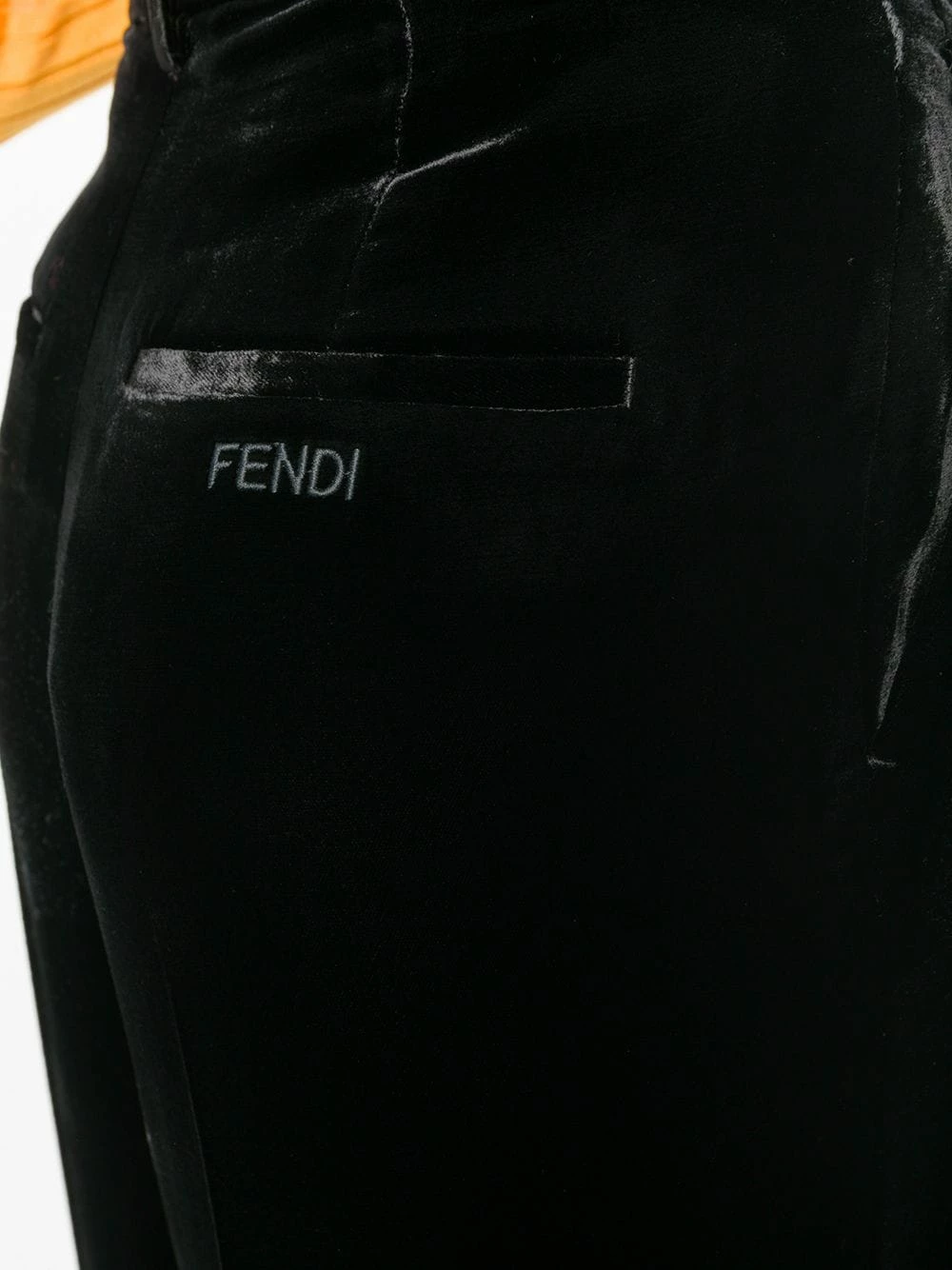 Black silk blend high waist palazzo trousers from Fendi featuring belt loops, a concealed front fastening, two front pockets, rear welt pockets, a flared style and a tone-on-tone embroidered Fendi logo at the back.