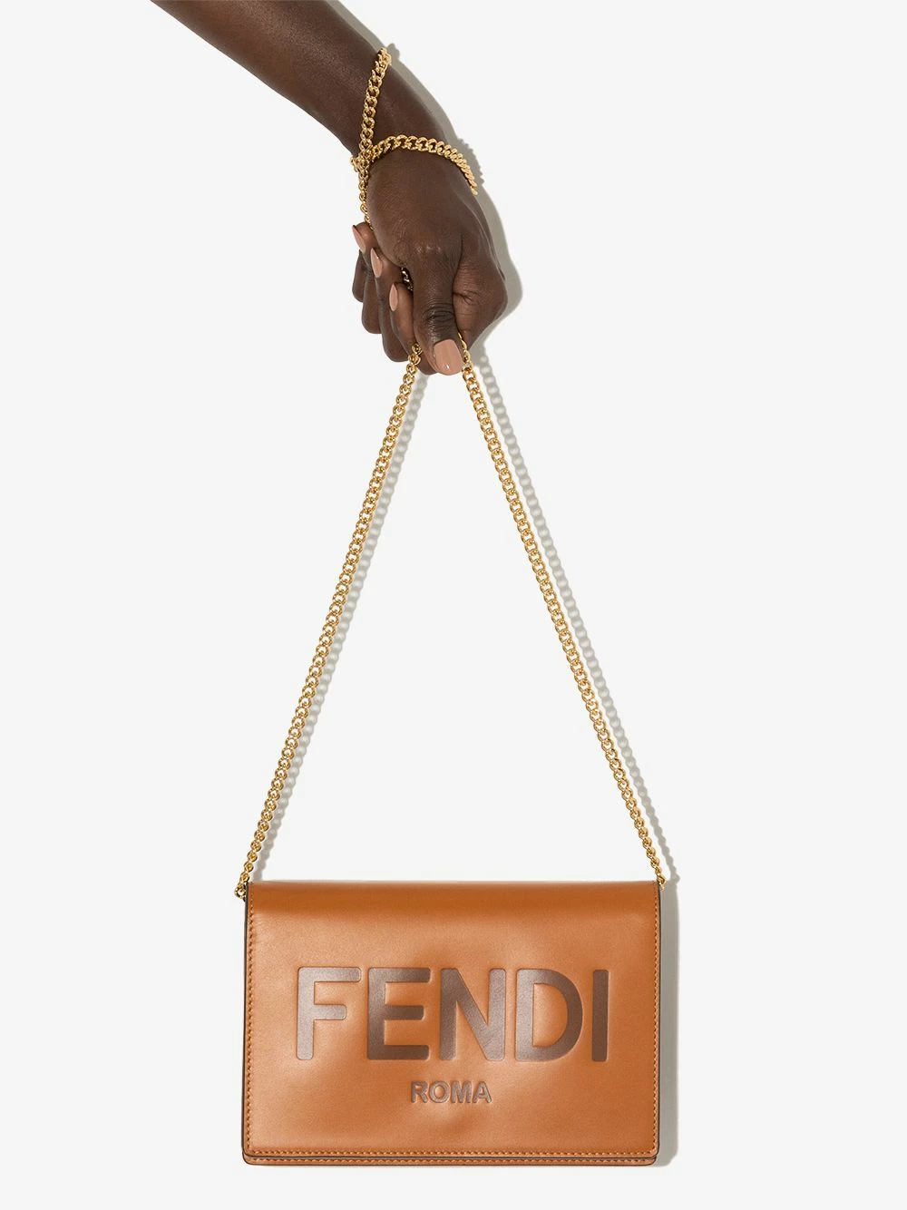 In a classic colourway, this on-chain wallet showcases the ability of the Italian fashion house for designing sleek, practical accessories. With a printed logo across the front and gold-tone hardware for a classic contrast, this piece has an interior set out like a wallet: eight card slots, a flat pocket and a zip-fastening compartment. It can be carried by hand or worn cross-body, thanks to the detachable chain-link shoulder strap.
