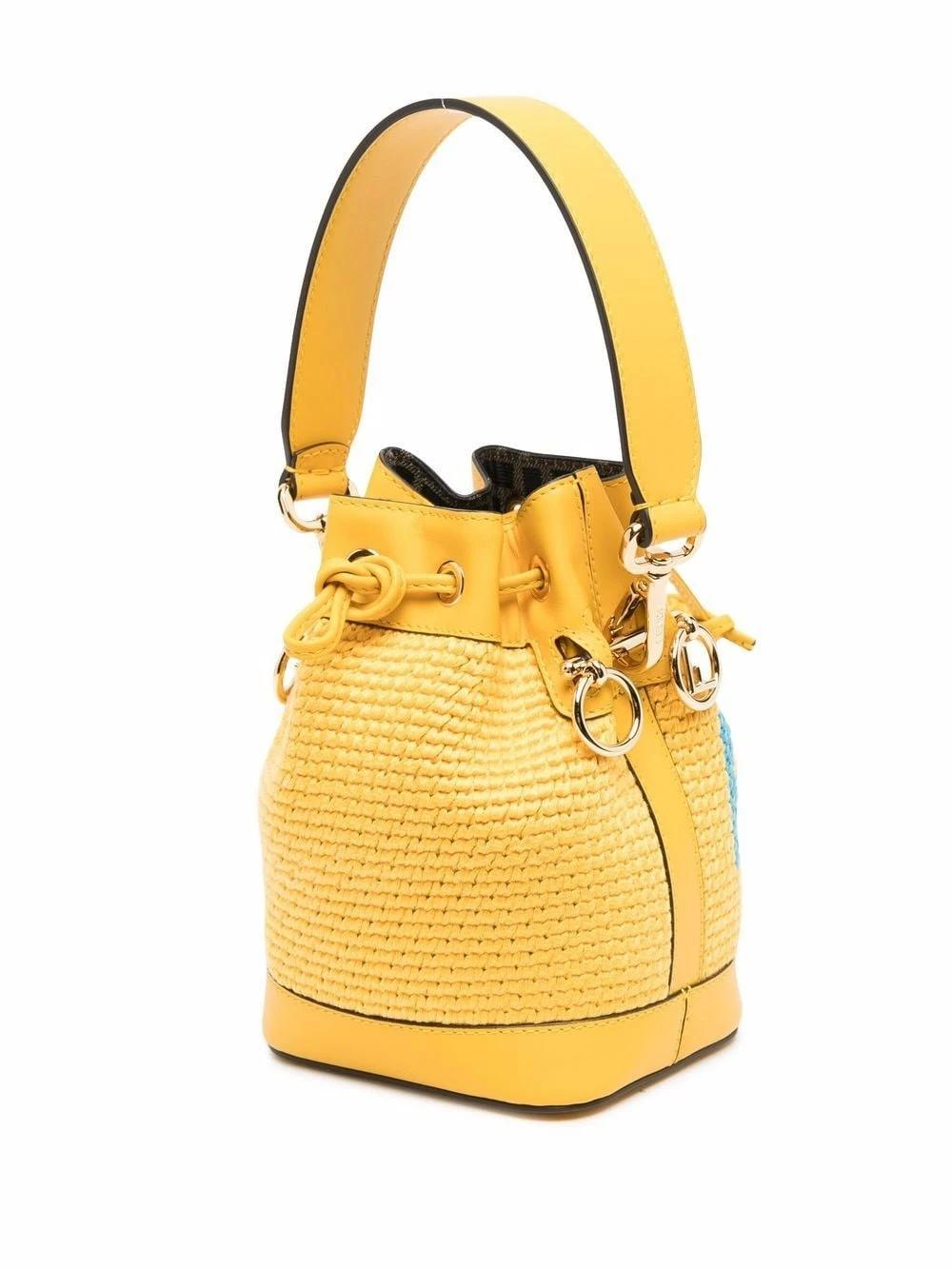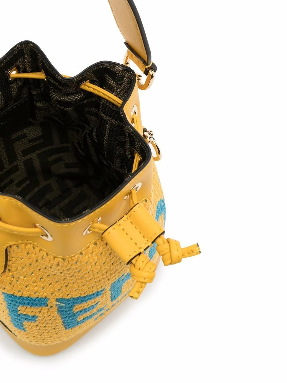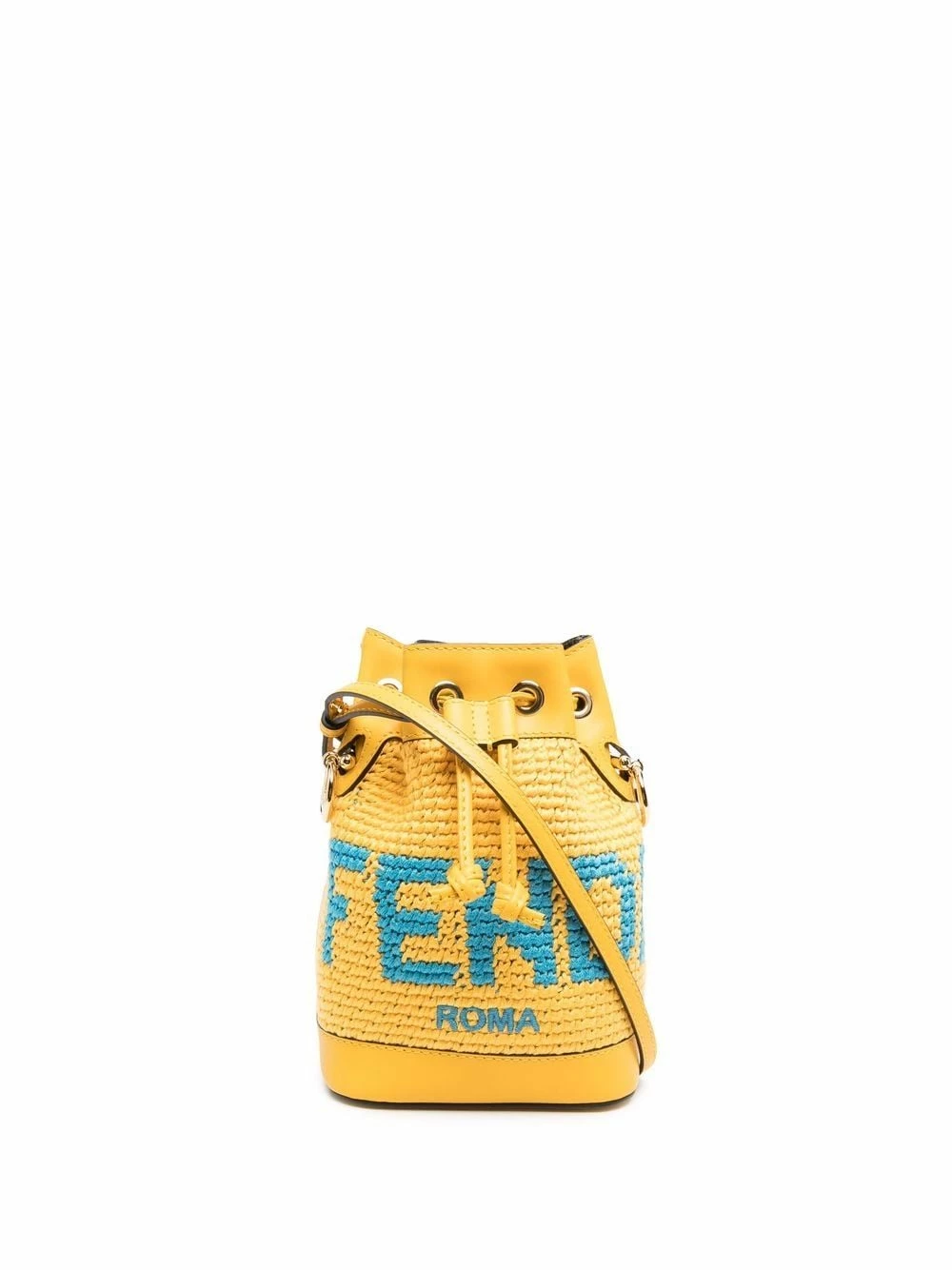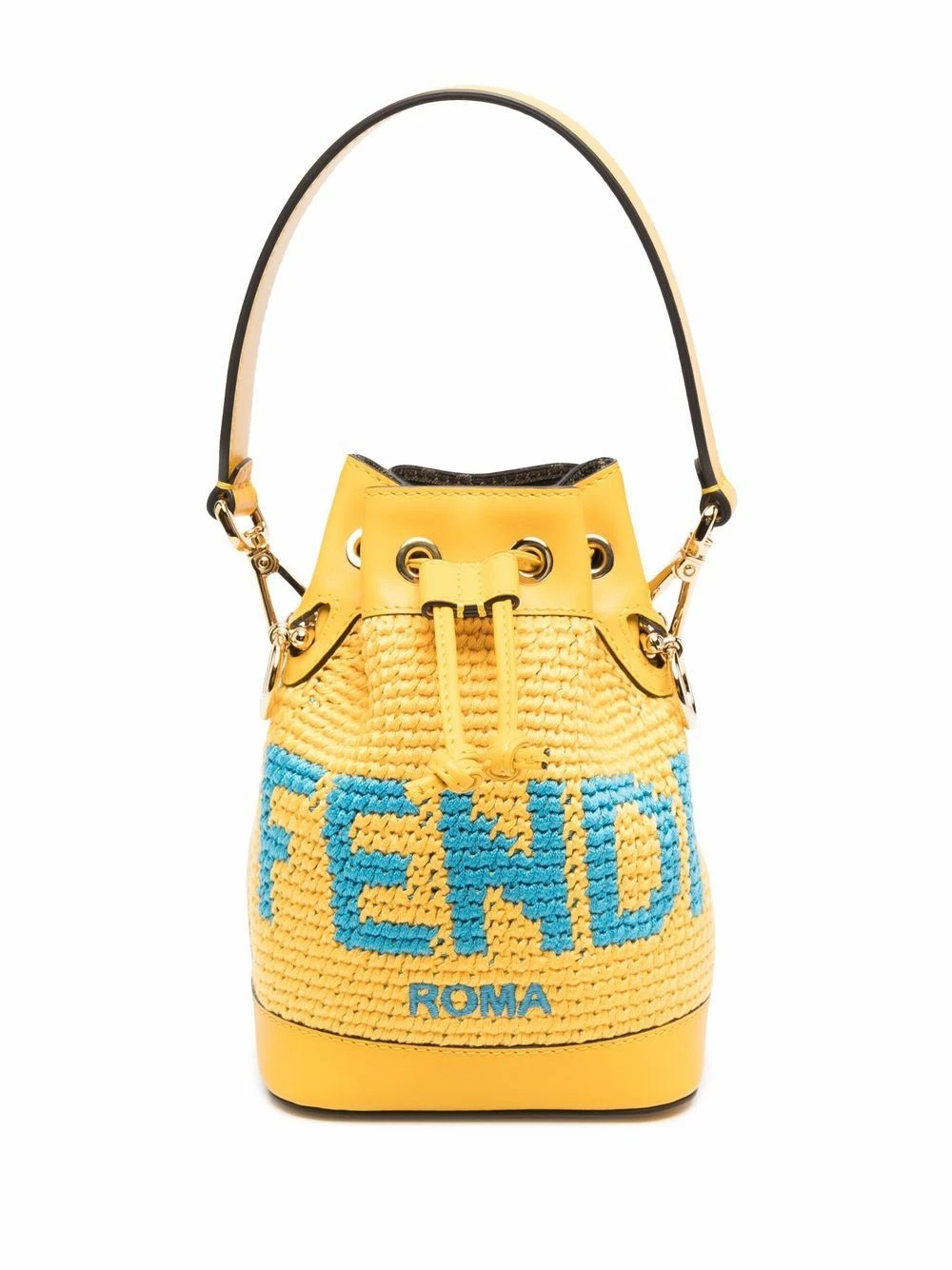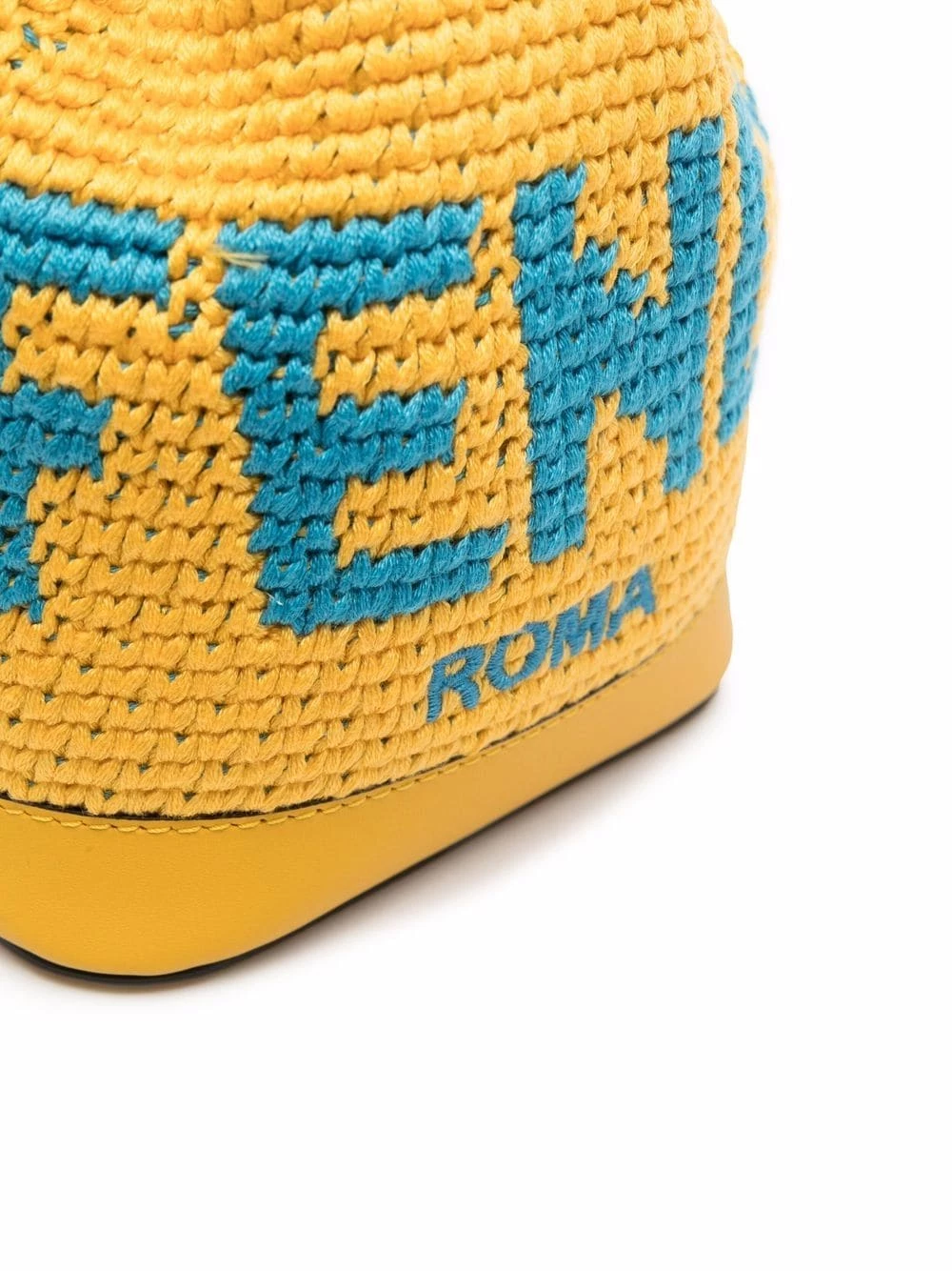 In French, ‘mon trésor’ is a term of affection, directly translated to mean ‘my treasure’. This mini Mon Trésor bucket bag is made from green braided cotton in traditional crochet and is finished with a blue FENDI ROMA logo.