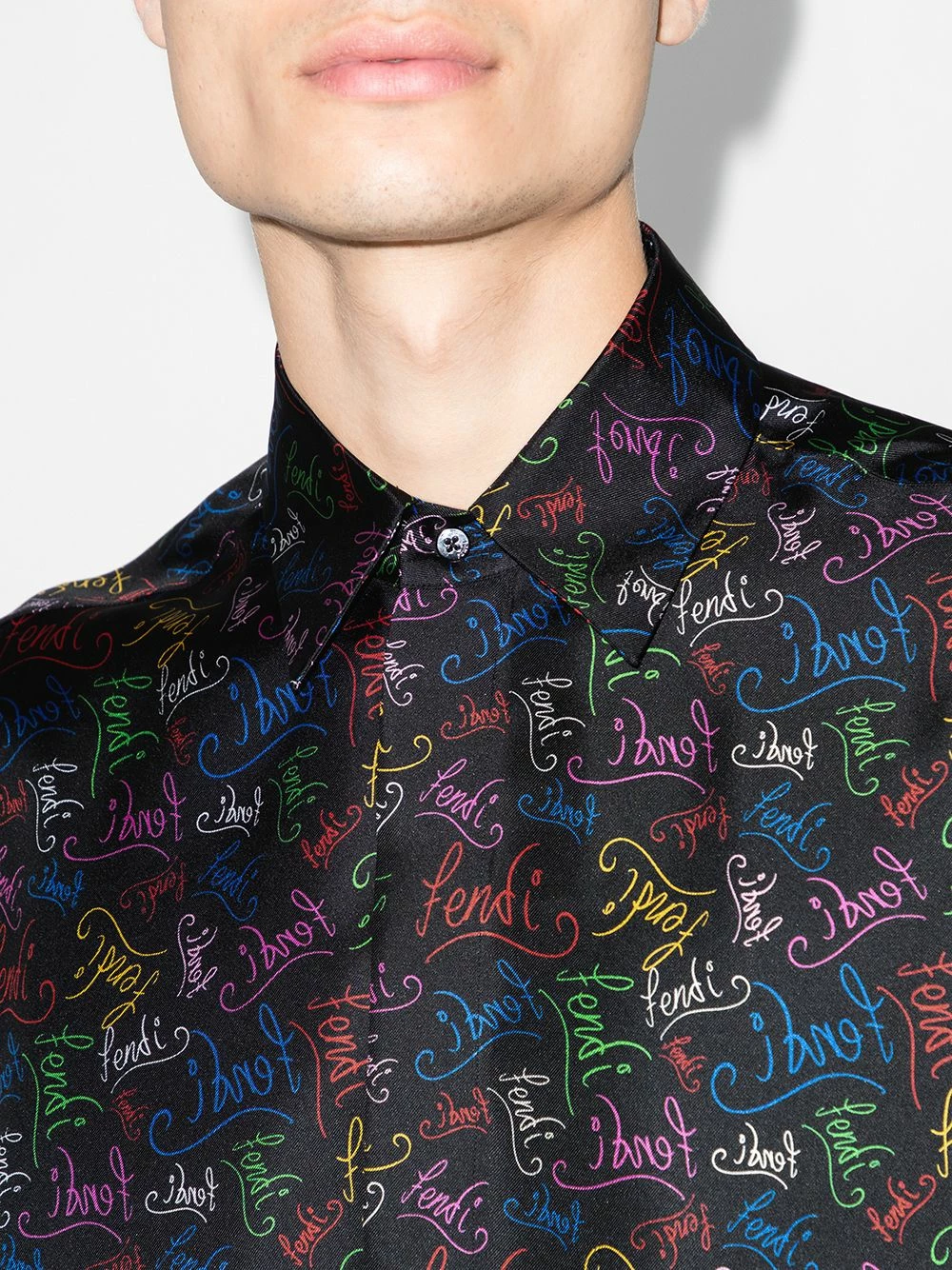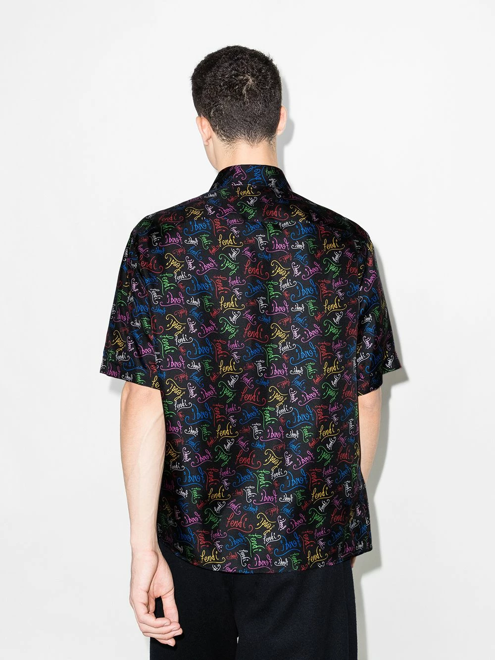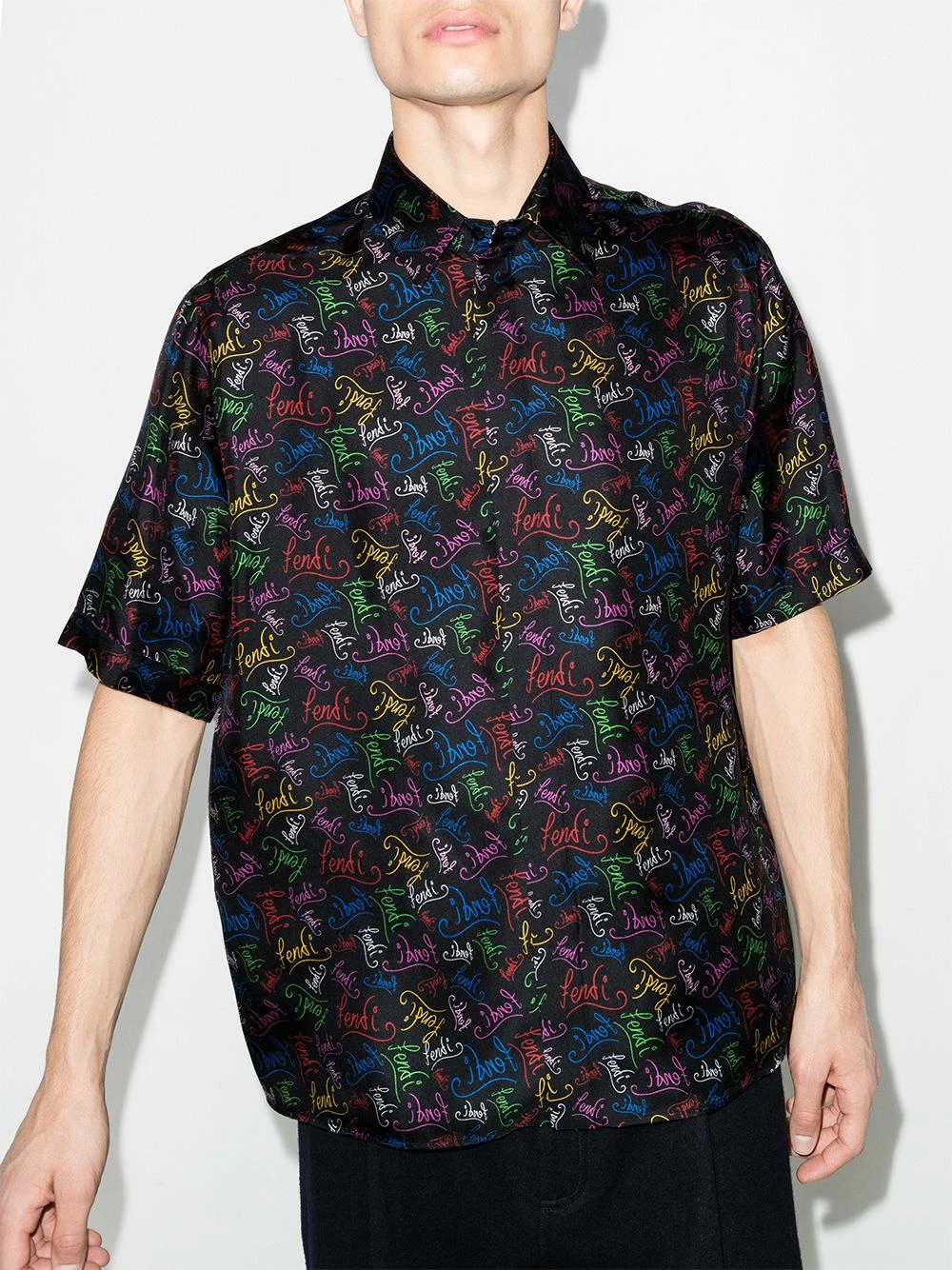 Woven in a soft silk twill with a relaxed silhouette, this Fendi shirt features a colourful all-over logo print designed by artist Noel Fielding for his collaboration with the Italian house. Fastening at the front with a concealed button closure, the shortsleeved shirt is finished with a classic pointed collar.