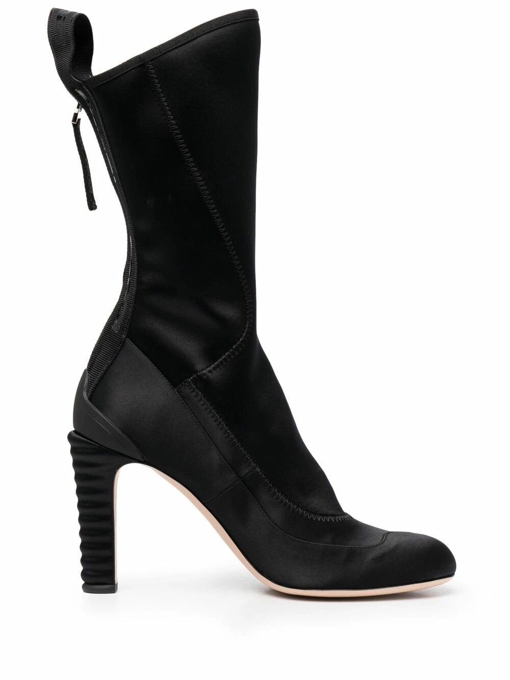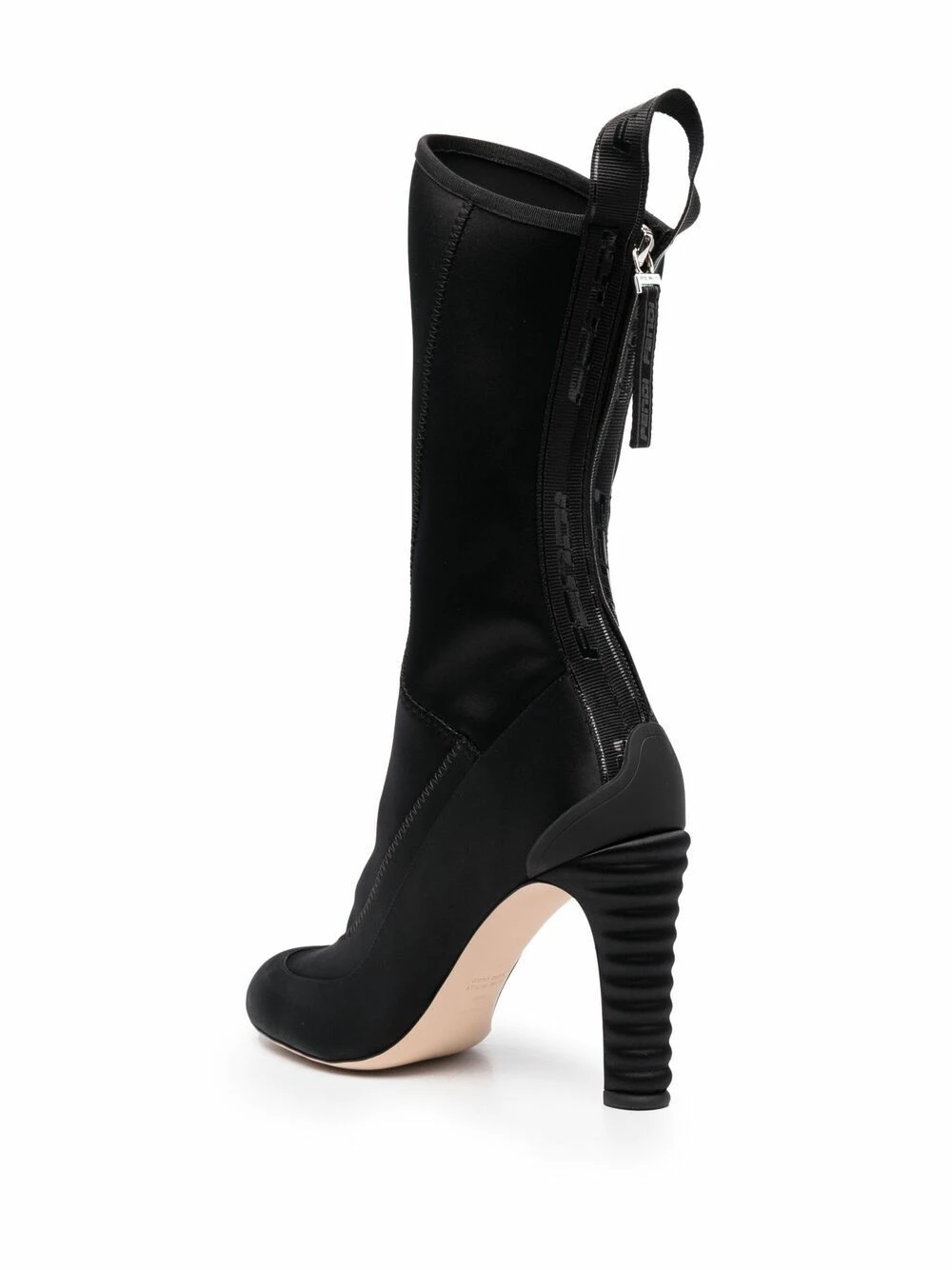 Strut in style. Crafted from black leather, these calf-length boots from Fendi are placed atop a high heel for added drama and definition. Zip up and walk like you mean it.Β