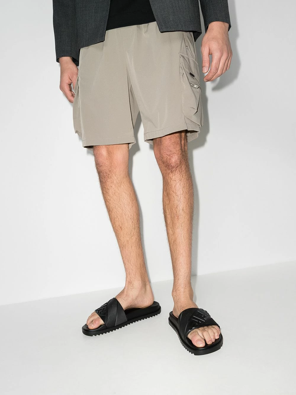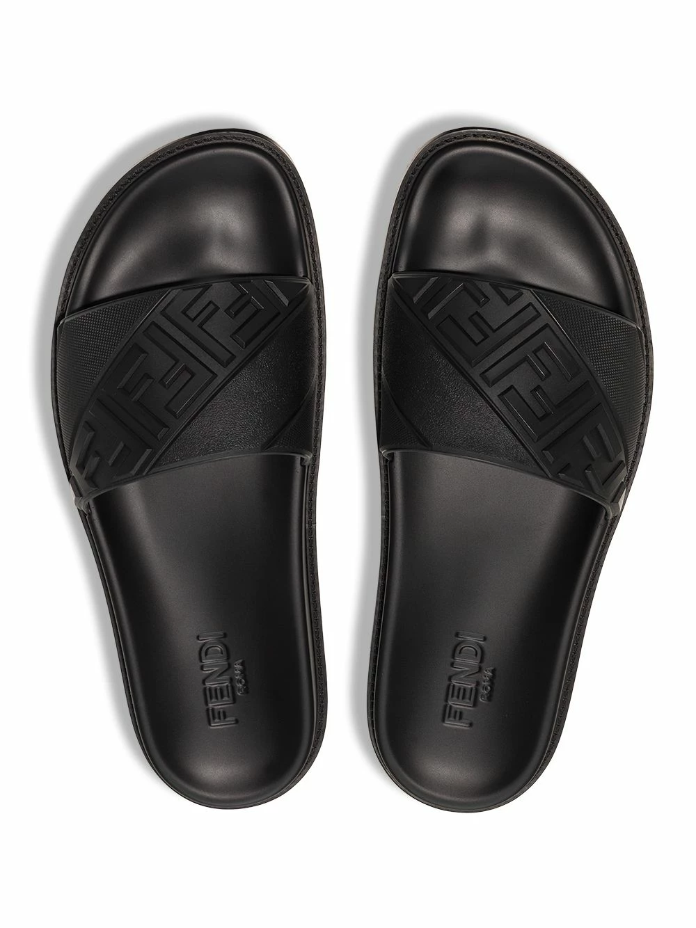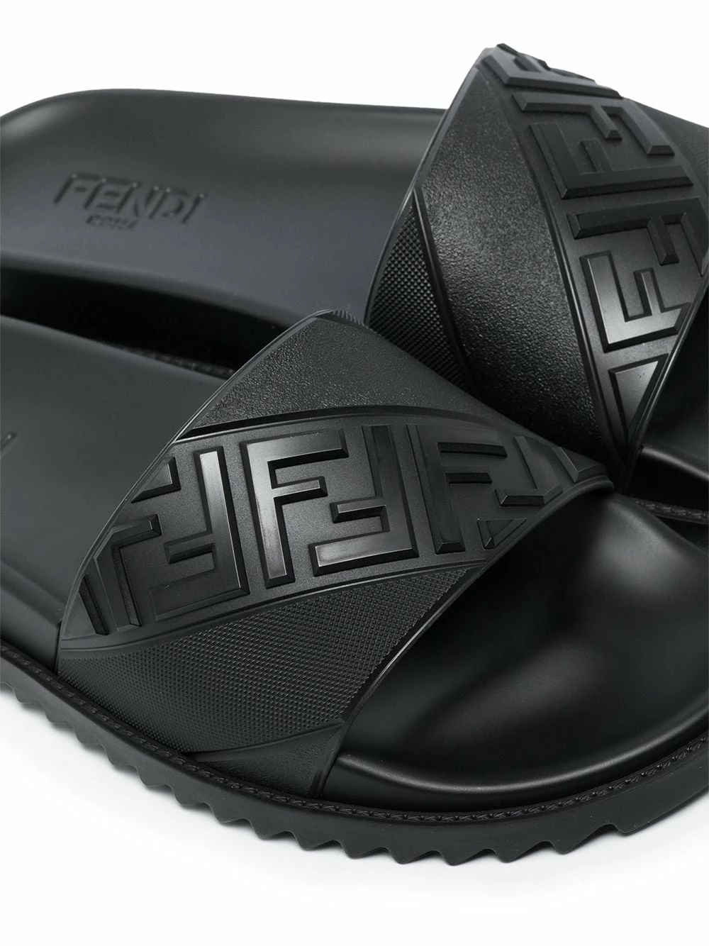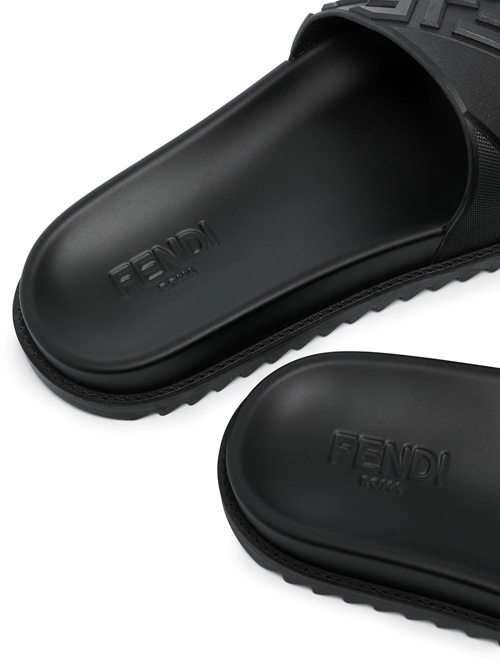 The Italian luxury fashion brand, Fendi, is known for its timeless styles and high-quality materials. A fine example are these black rubber slides, constructed with a flexible polyurethane footbed and decorated with an embossed FF diagonal motif and intarsia stripes.