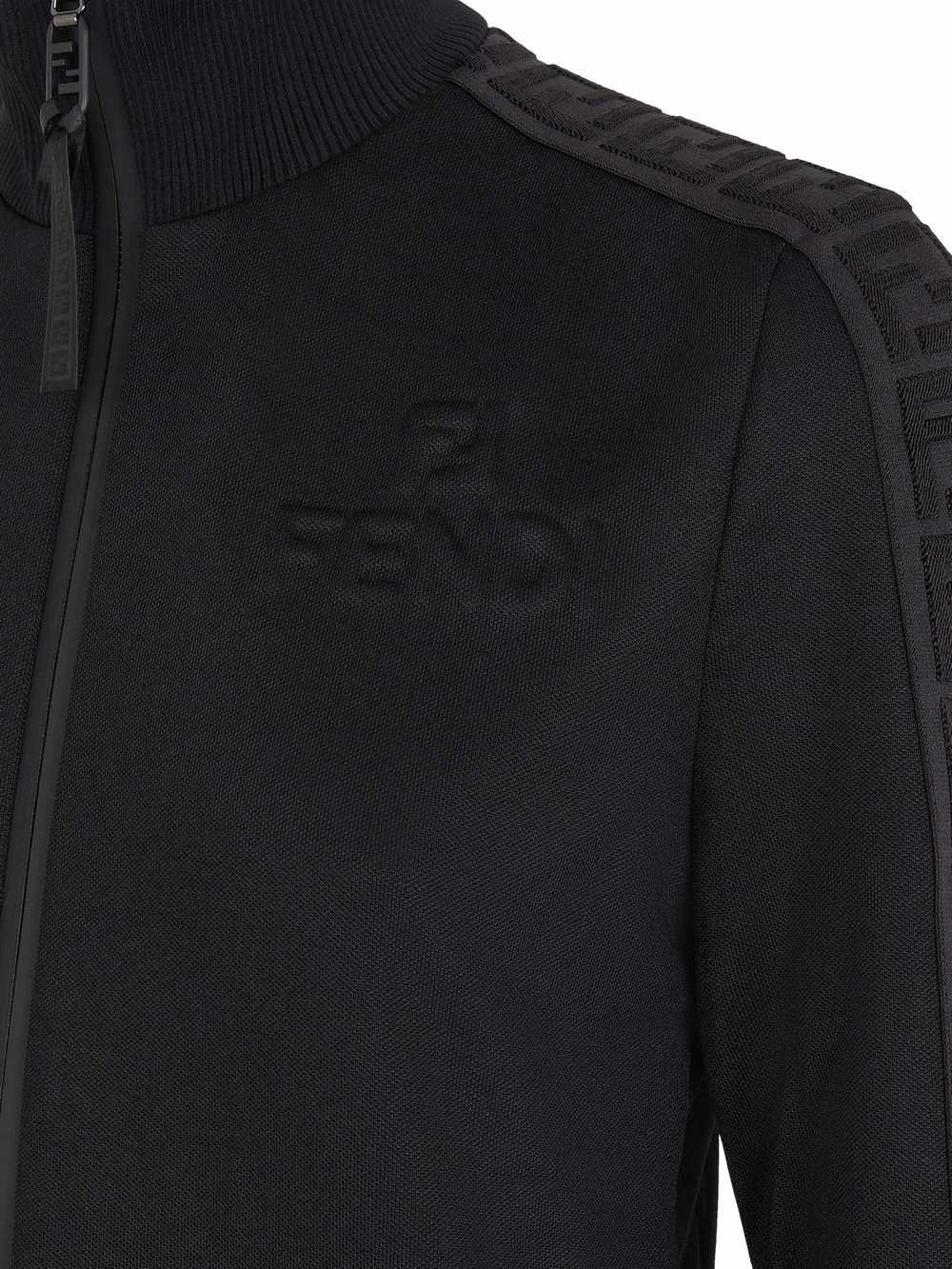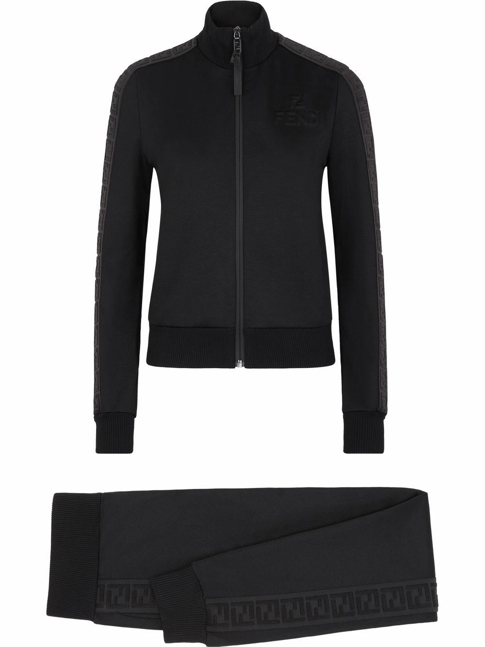 Venturing into a sporty aesthetic, Fendi presents this two-piece tracksuit. This all-black set is subtly elevated by an embossed logo at the chest and FF logo stripes to the side of each sleeve and leg.