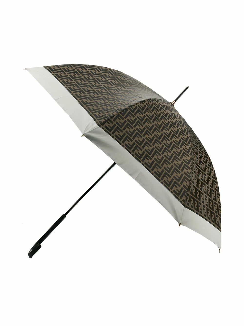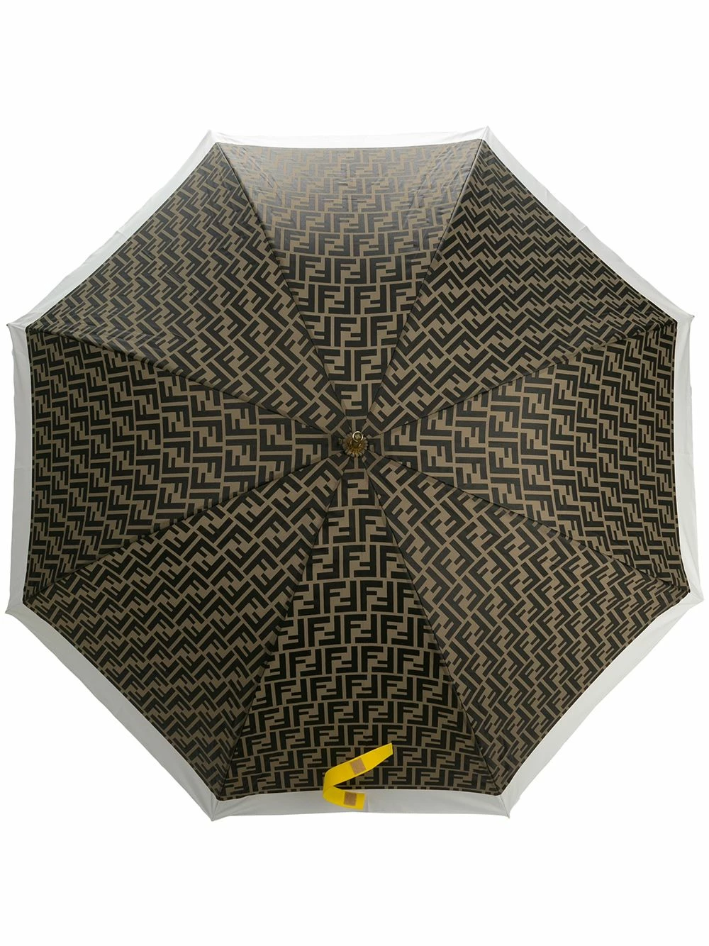 Fendi constantly reinvents itself with abstract, graphic motifs for logos and the signature FF monogram patterns, sprawled across contemporary, street-inspired offerings each season, as seen in this brown FF motif umbrella. Featuring an embossed logo, a contrasting white trim, a brand buckle and FF motif all-over.
