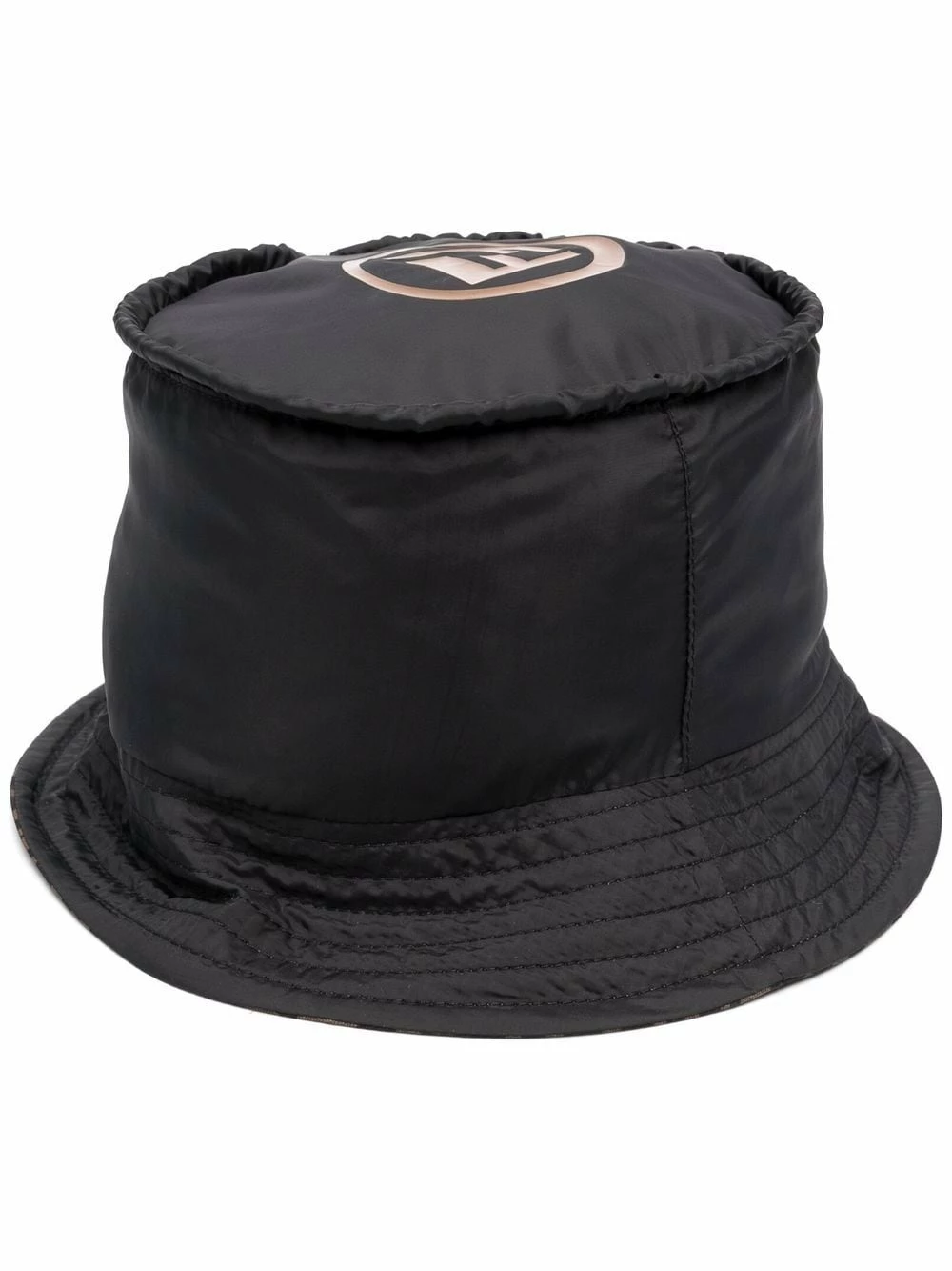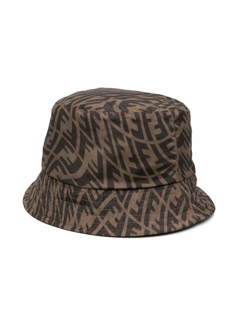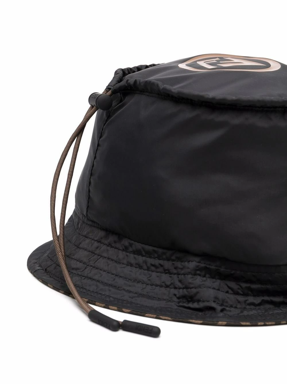 Black/tobacco brown reversible FF logo-print drawstring bucket hat from FENDI featuring dropped narrow brim, tonal stitching, drawstring fastening, FF-logo print, reversible and FF motif.