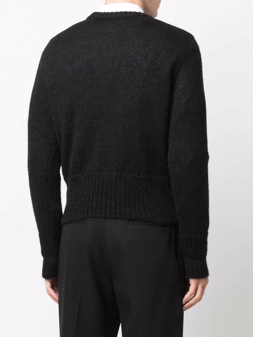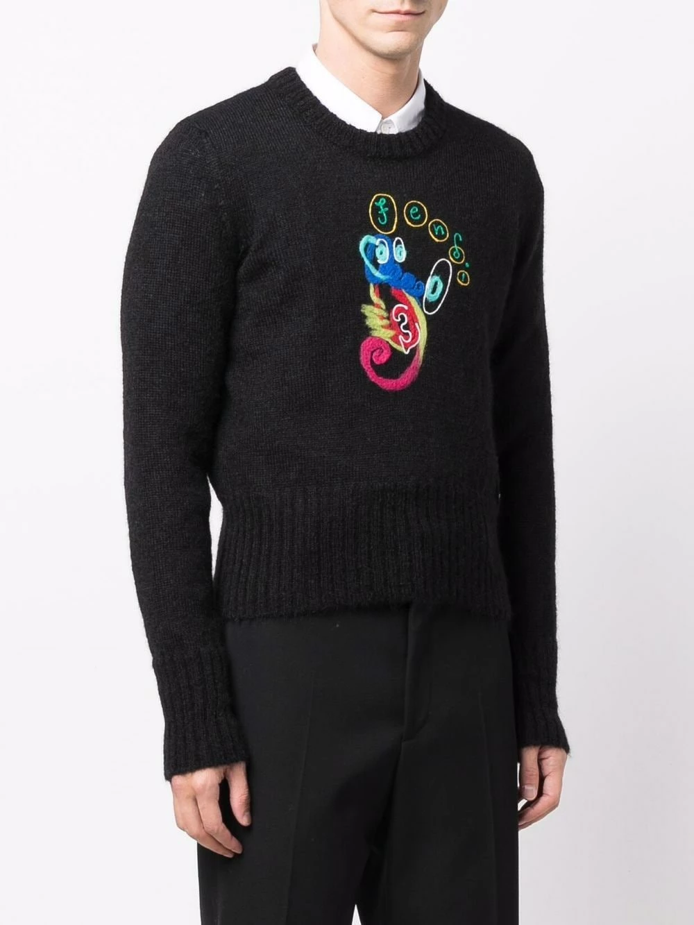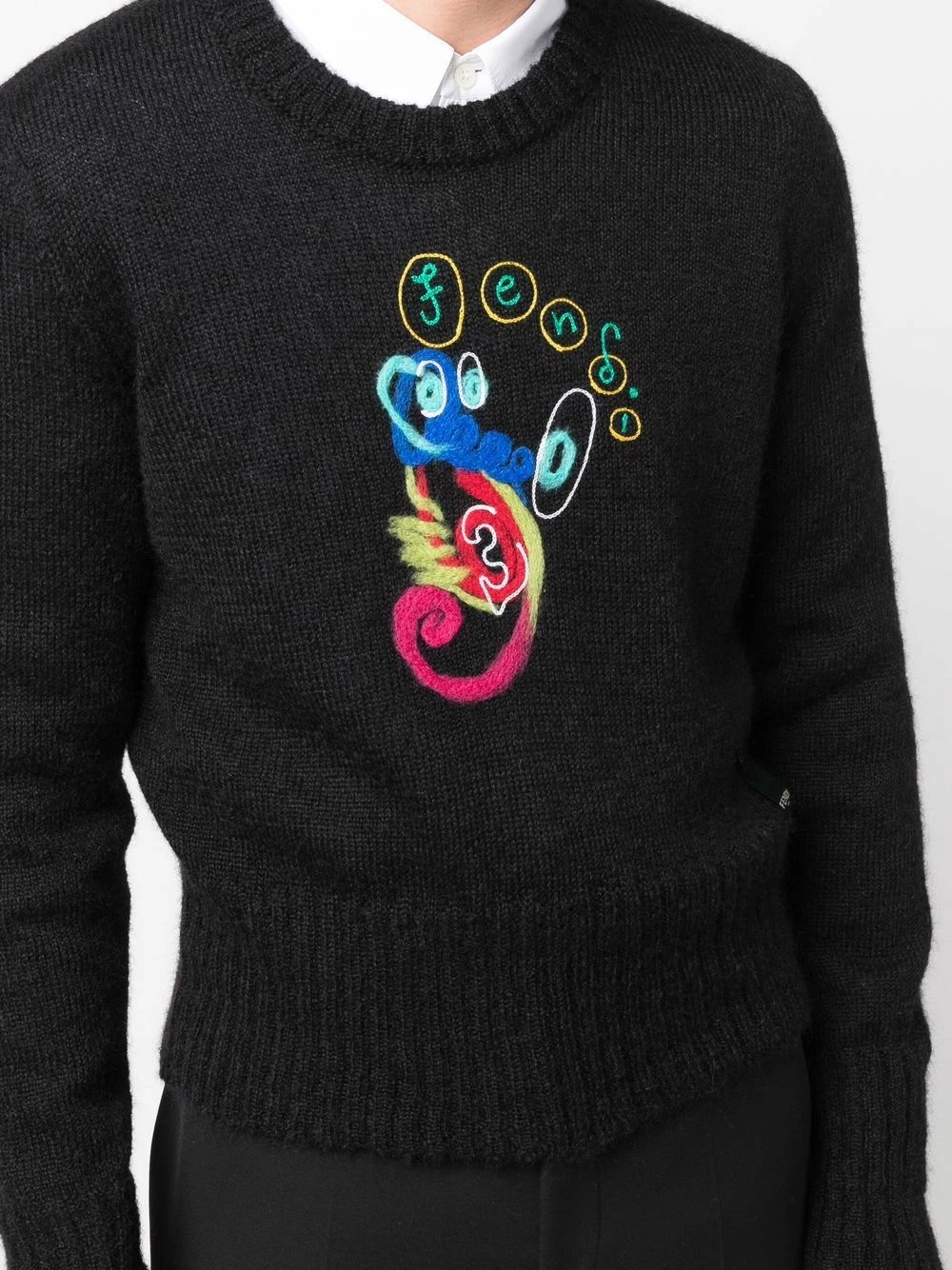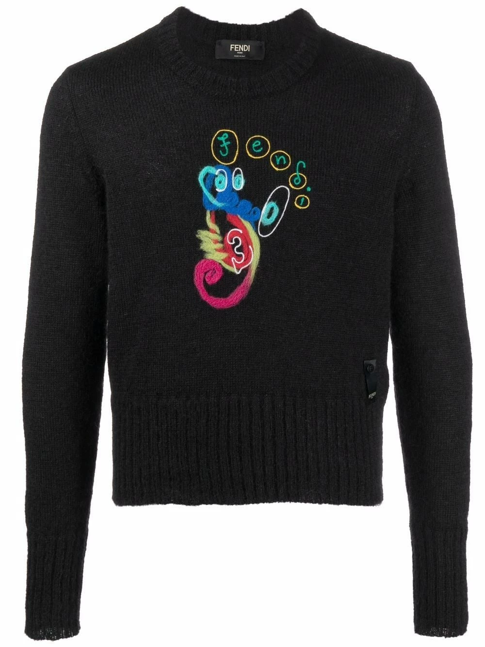 Fendi’s collaboration with artist Noel Fielding sees this crew neck jumper brought to the forefront. Fabricated from a black mohair blend, it features a multicolour abstract pattern knit to the front with distinctive embroideries.