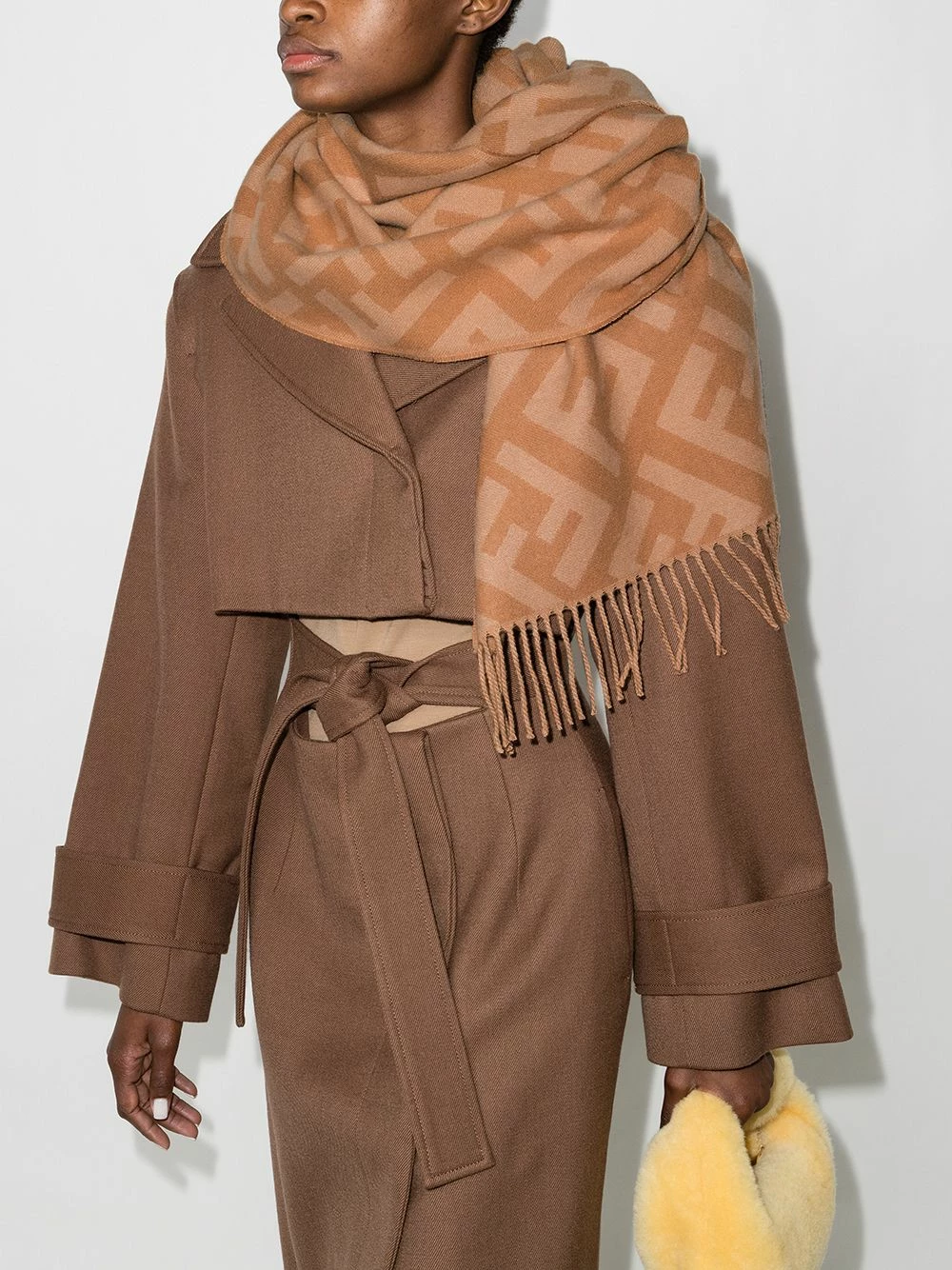 Fendi’s scarf is a cosy option for winter dressing. Spun from plush cashmere, this dark honey iteration is decorated with the iconic FF logo all over – a nod to the brand’s bold aesthetic.