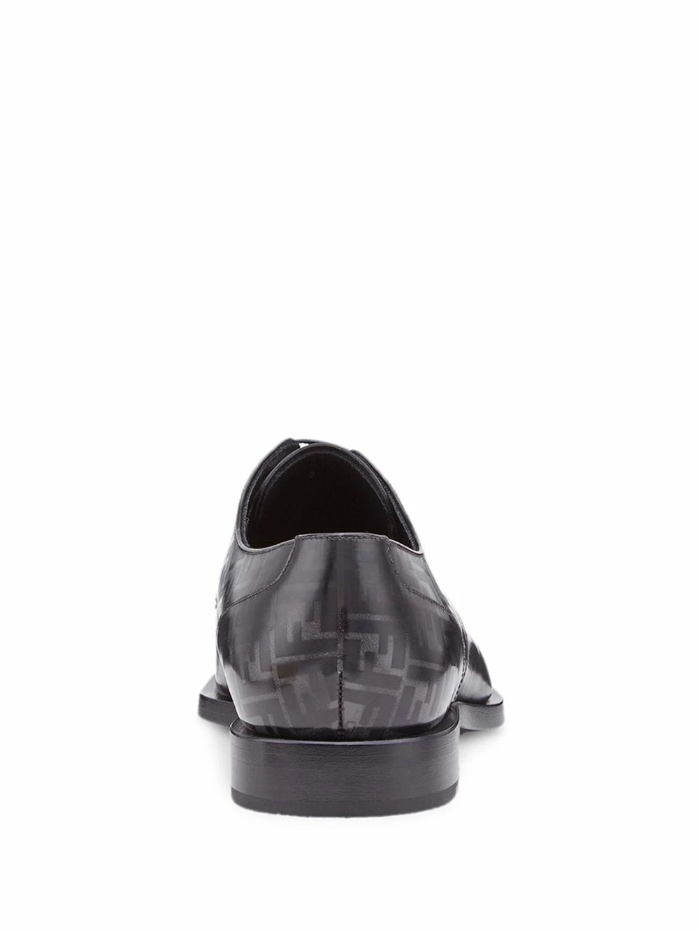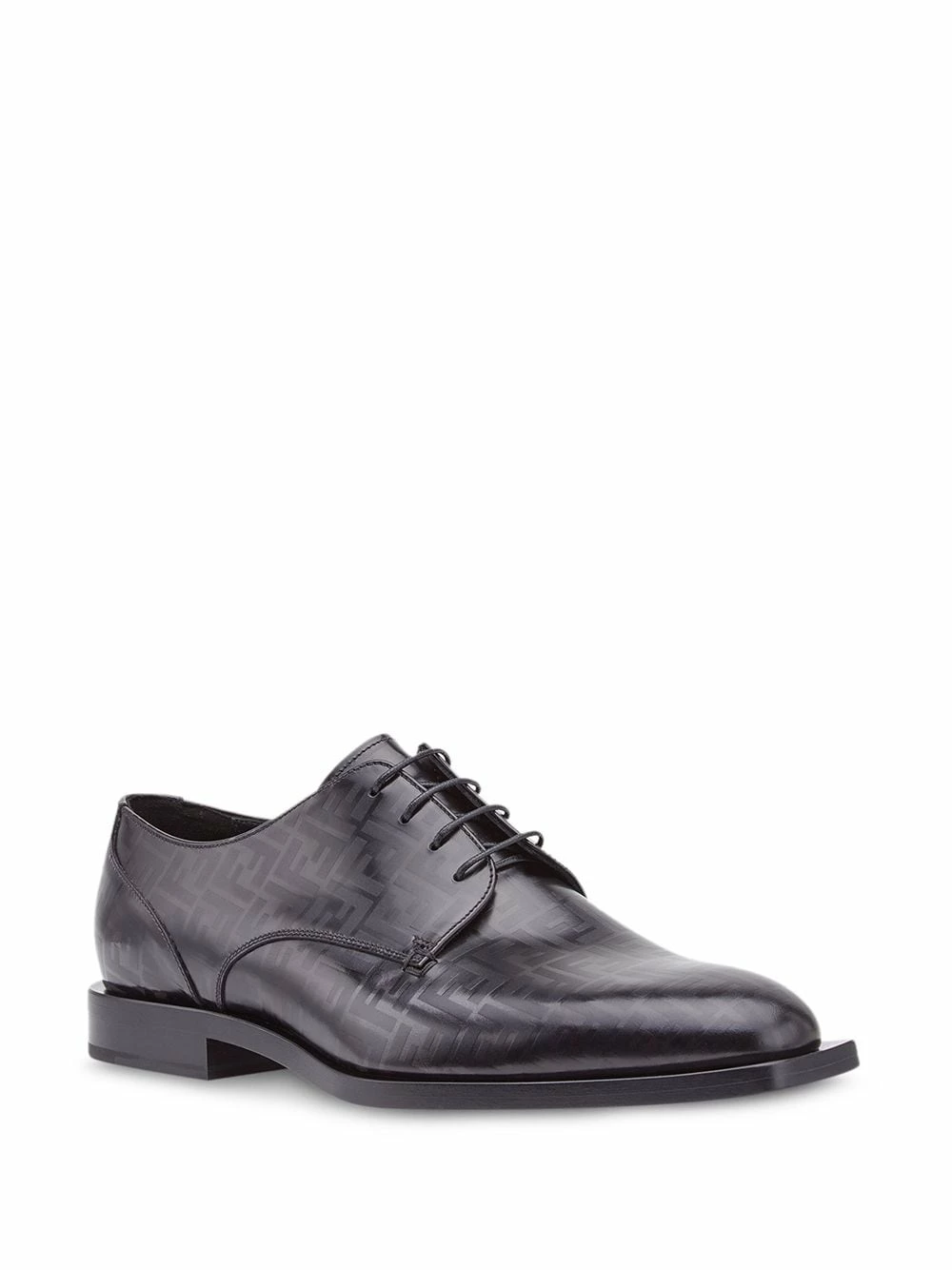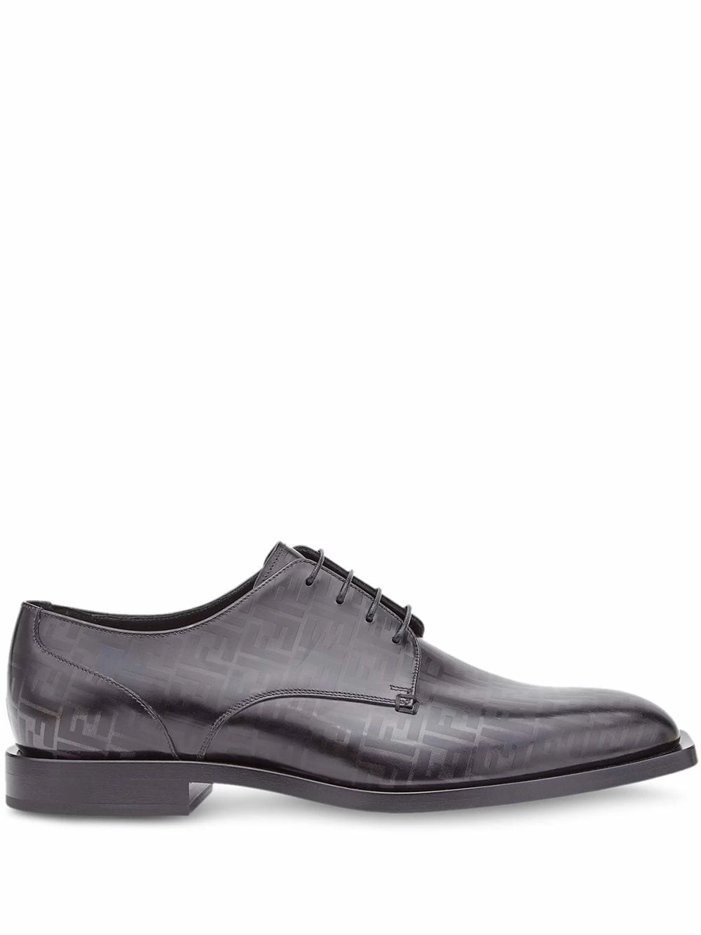Experience glamour and elegance this season by purchasing a signature piece from Fendiβs newest collection. These asphalt black FF print Derby shoes are crafted from leather and feature a square toe, a lace-up front fastening, a low block heel, a branded insole and tonal stitching.