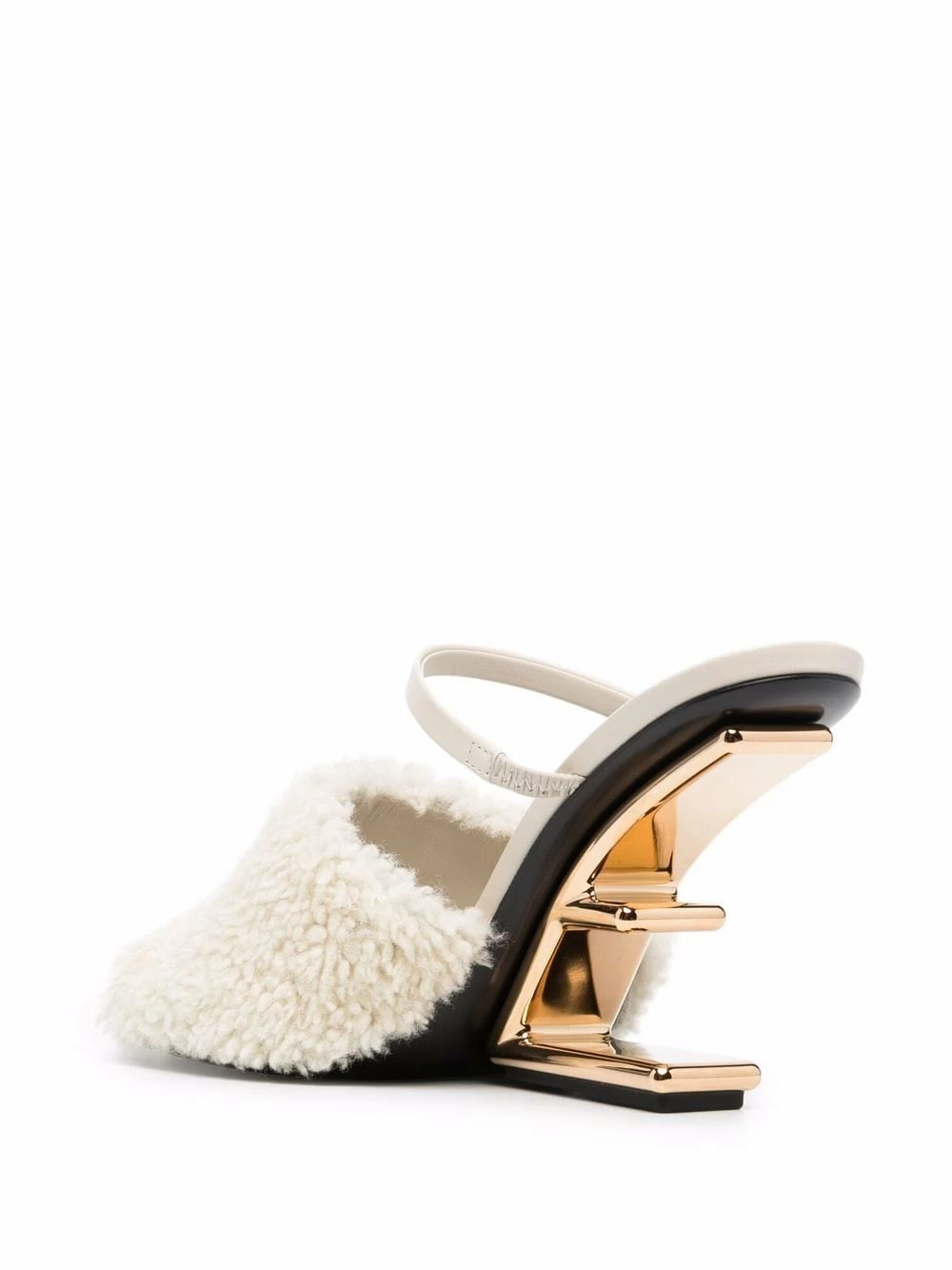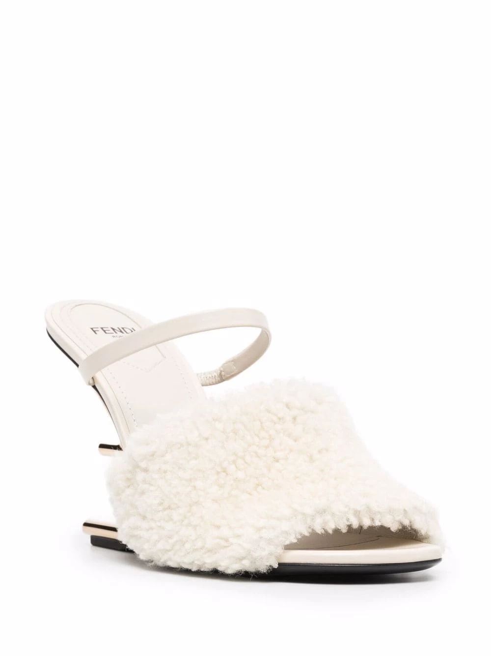 Showcasing Fendi’s creative approach, these sandals stand out thanks to unexpected shearling detailing. The unpredictable design continues with a sculptural gold-tone heel in the shape of an ‘F’.