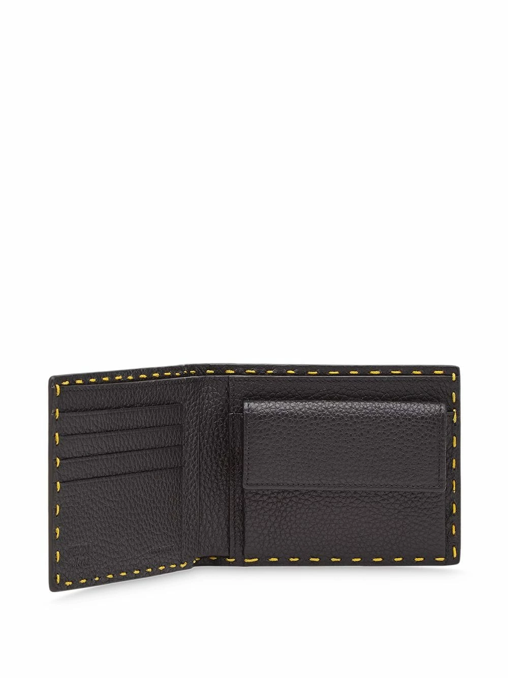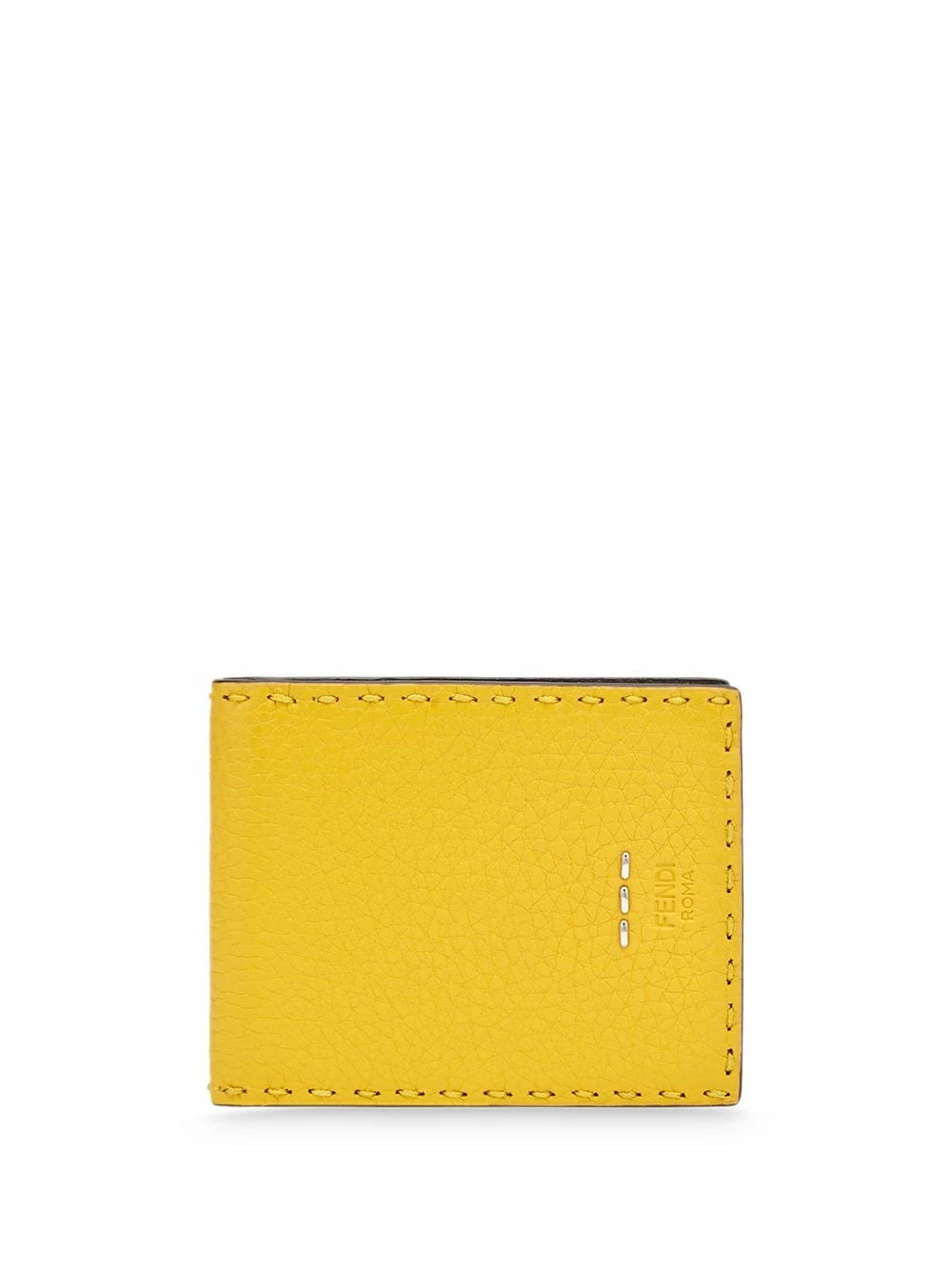 Fabricated in Italy, this colour block bi-fold wallet from Fendi is designed with a tonal stitching design that runs the entire perimeter of this versatile accessory. Designed in a sunflower yellow and black hue, it features an internal flap coin pocket and card slots.