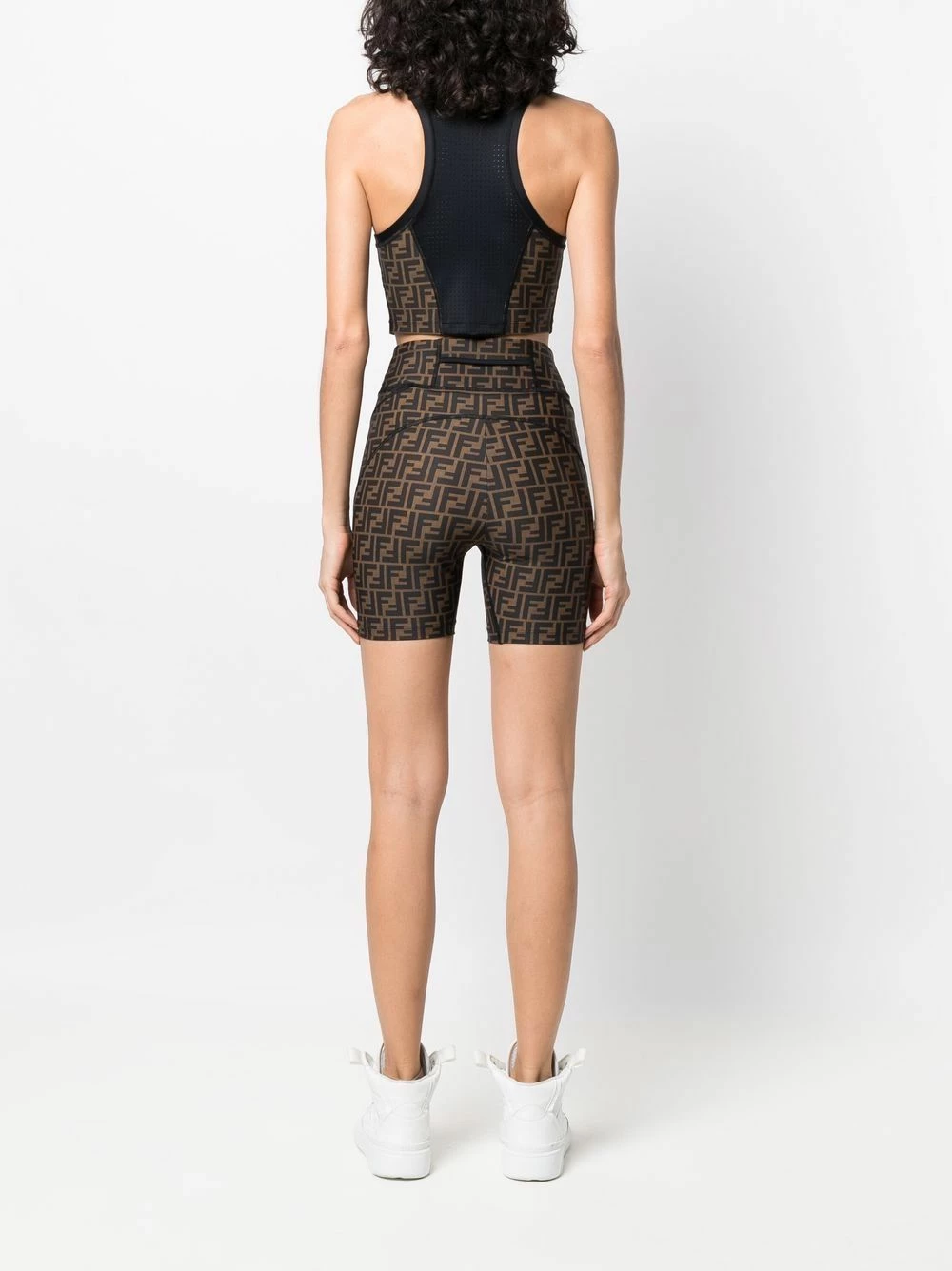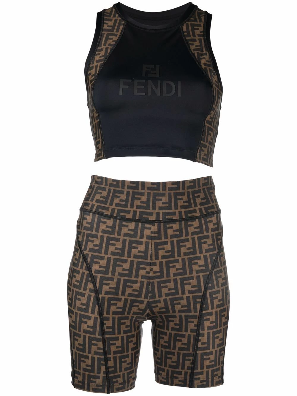 Fendi leaps into activewear with signature charm for AW21. This two-piece set features the Zucca pattern repeated on the racerback top and compression shorts, whilst an embroidered logo decorates the chest in case any confirmation is needed on who designed this look.