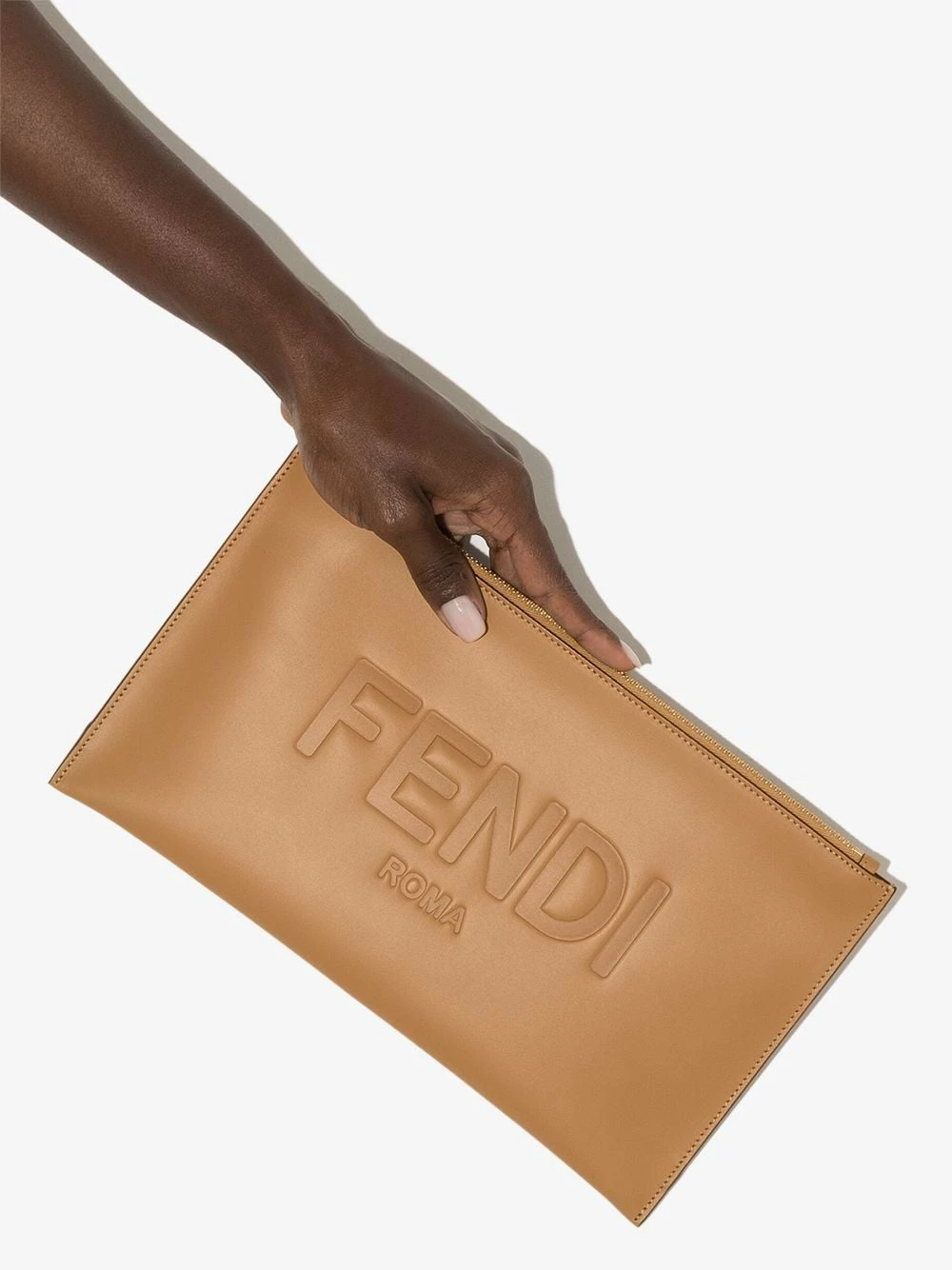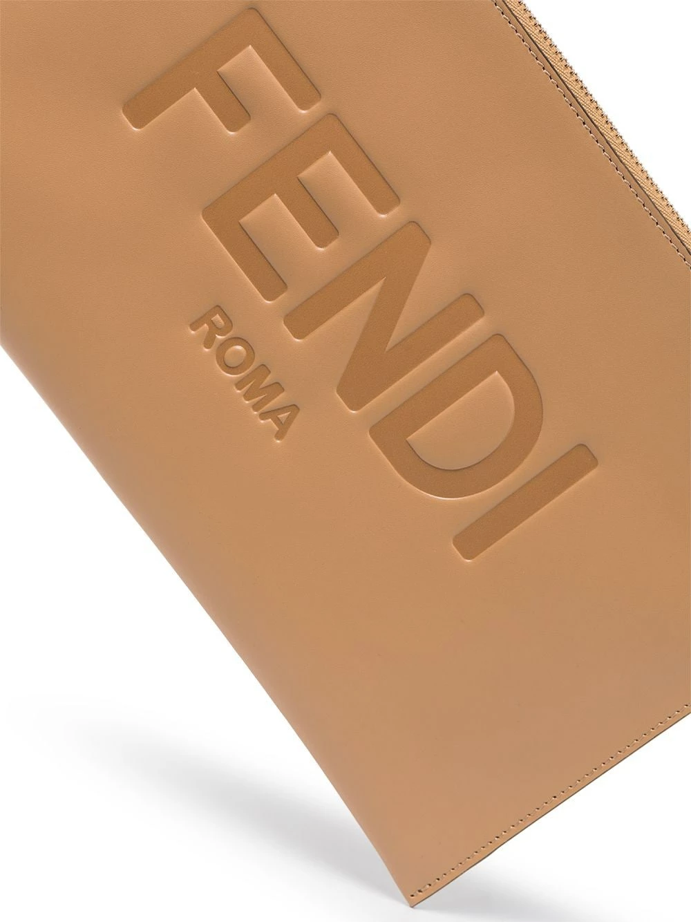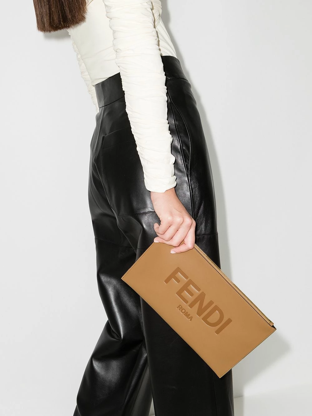 Fendi pairs the brand’s signature opulence with timeless design in this clutch bag, with a monochromatic debossed logo at the front. Classic details such as a top zip fastening add to the effortlessly sophisticated feel of the accessory.Β