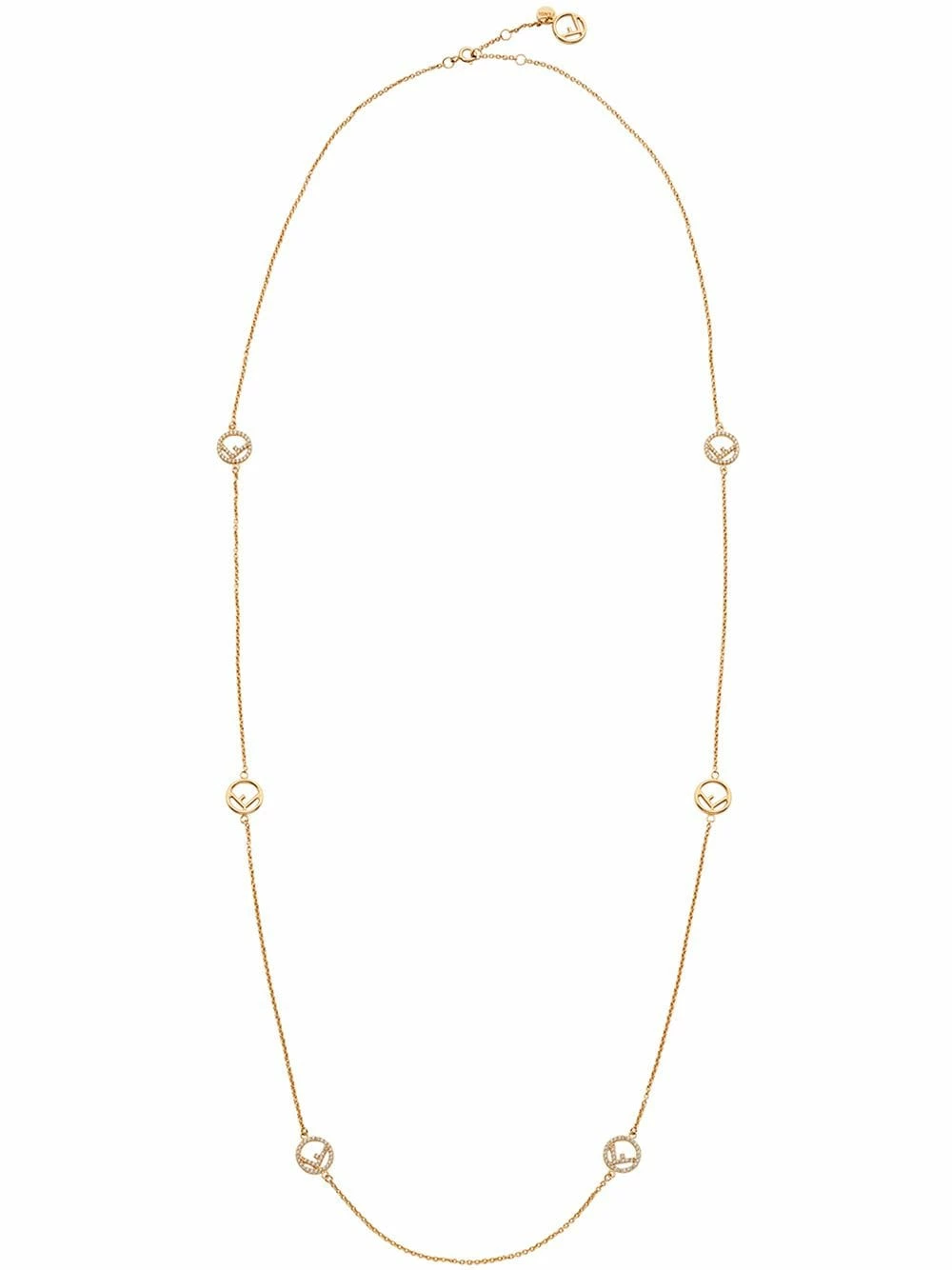 Fendi creates the ultimate baubles to adorn the directional ready-to-wear collections. The signature line of costume jewellery is defined by delicate linear monogramming, wrapped leather cuffs and geometric layered pastel stones. Gold-toned brass and zirconium F logo necklace featuring a lobster clasp closure, a micro rolo chain and mini circular charms.