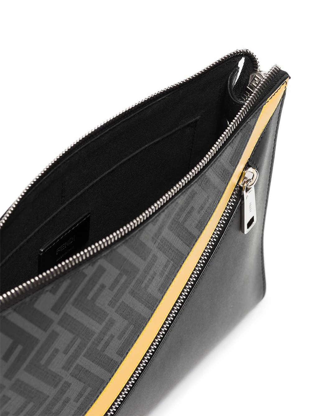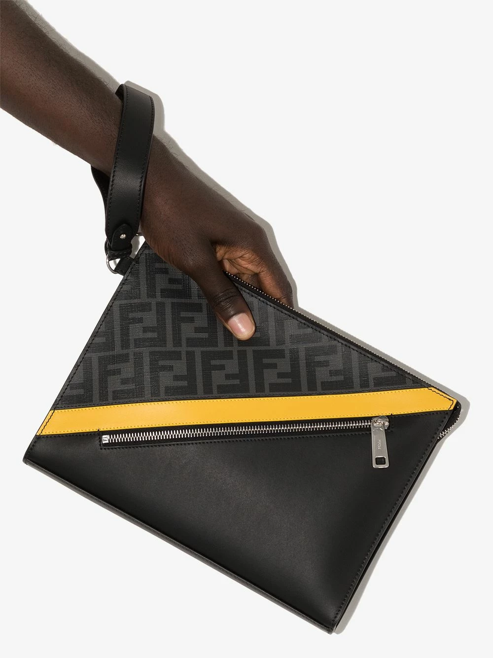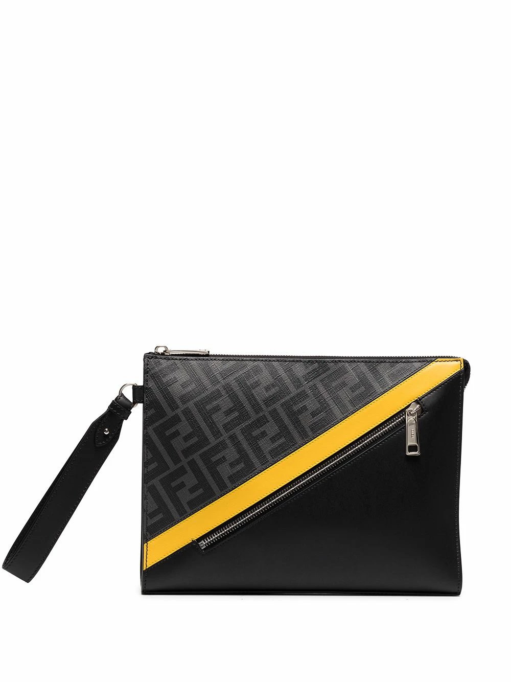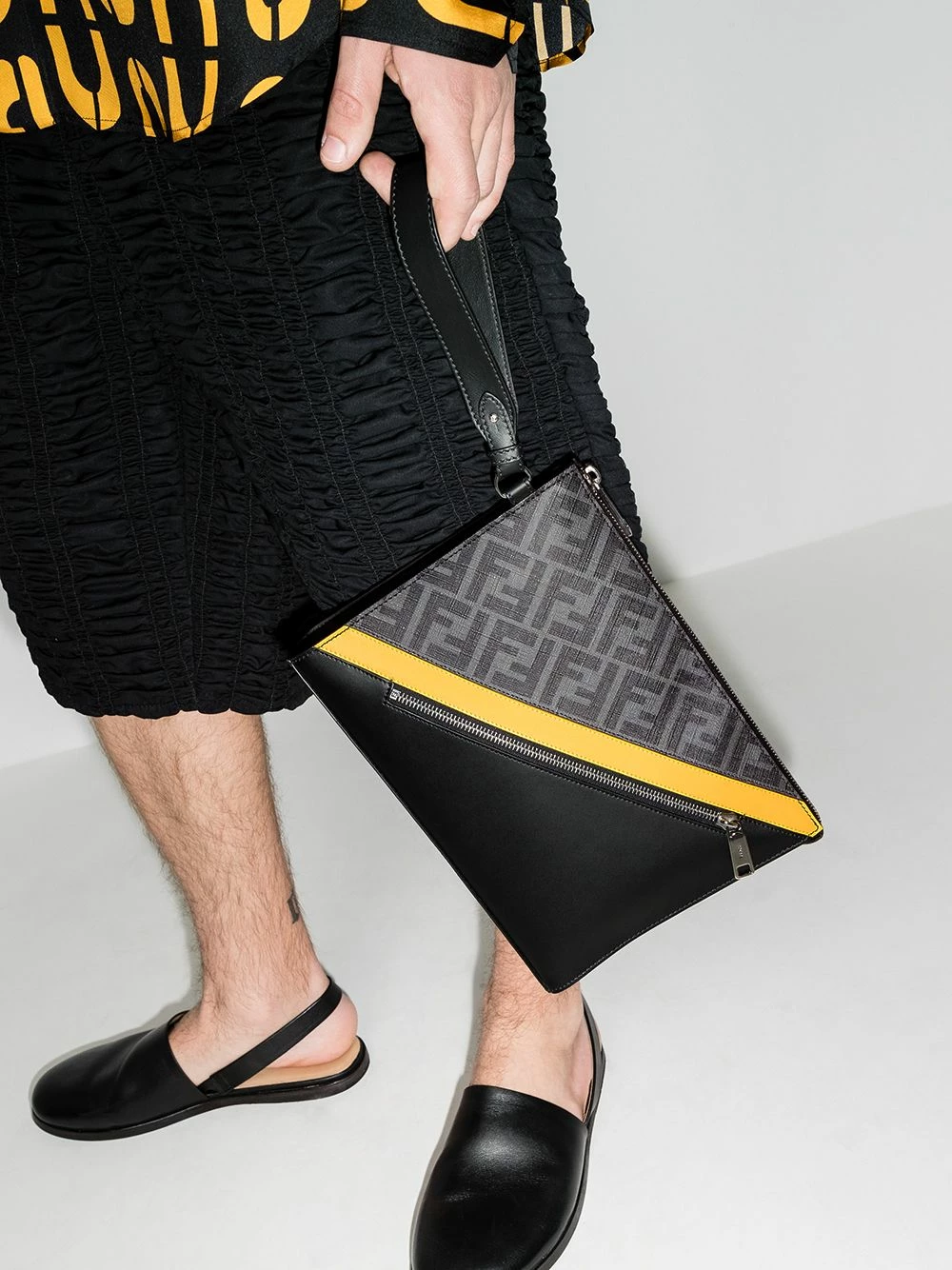 Fendi’s clutch bag showcases the ability of the brand to add its graphic touch to classic items. Crafted from leather, this clutch bag is cut with clean lines that are elevated by the iconic FF-logo print and a contrasting yellow diagonal stripe.Β