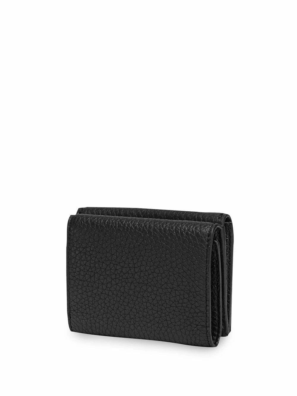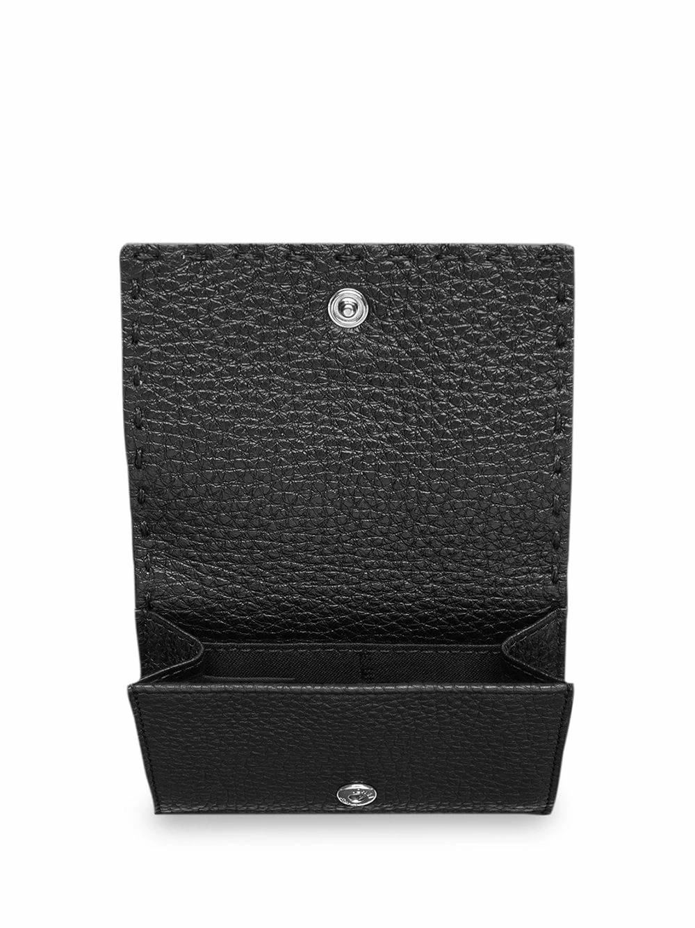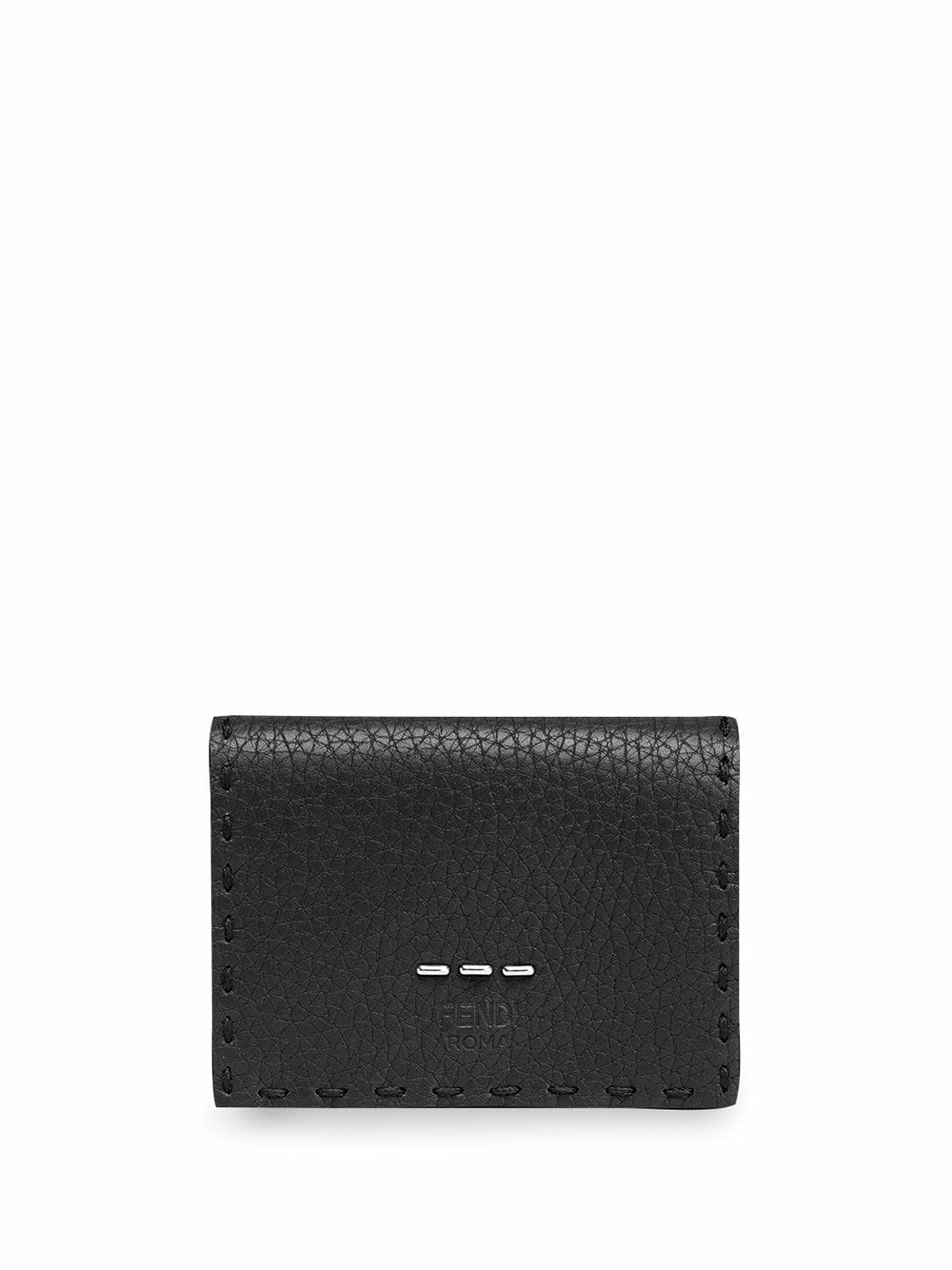 A Fendi collection wouldn’t be complete without its range of exceptionally crafted accessories like this black calf leather trifold wallet. It presents silver-tone metallic details at the front for a delicate distinctive touch. Subtlety is key! Featuring a pebbled leather texture, silver-tone metal, stitching details, multiple interior compartments and a snap button closure.