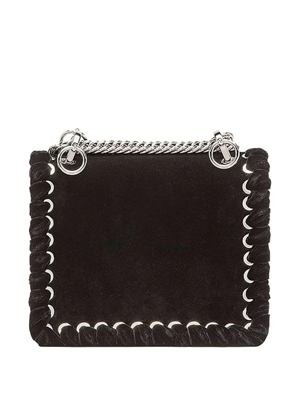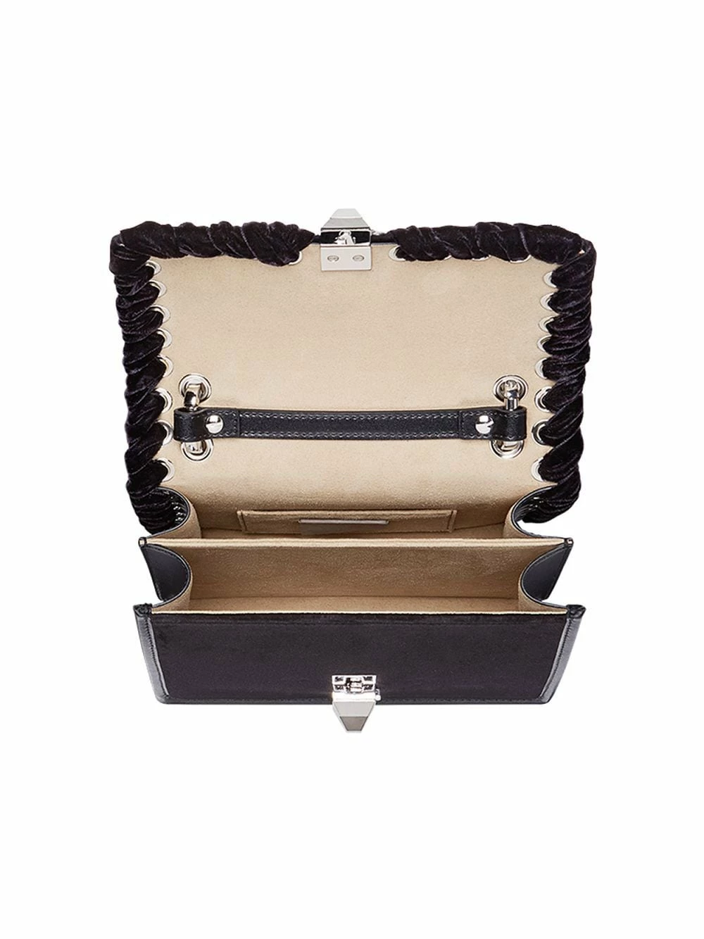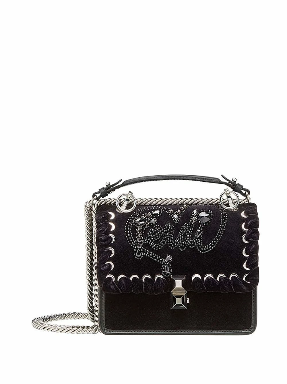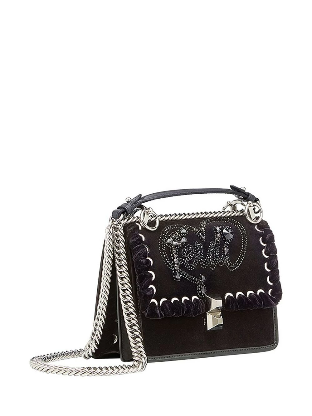 Technical construction is Fendiβs forte when it comes to leather goods. Championing the luxurious finish that makes their handbags a universal favourite, the Italian brand are constantly pushing their own boundaries, reimagining classics for the new season. This black calf leather and velvet Kan I logo embellished shoulder bag from Fendi features a top handle, a chain shoulder strap, a foldover top with clasp closure, crystal embellishments, silver-tone hardware and interior compartments divided by a partition.