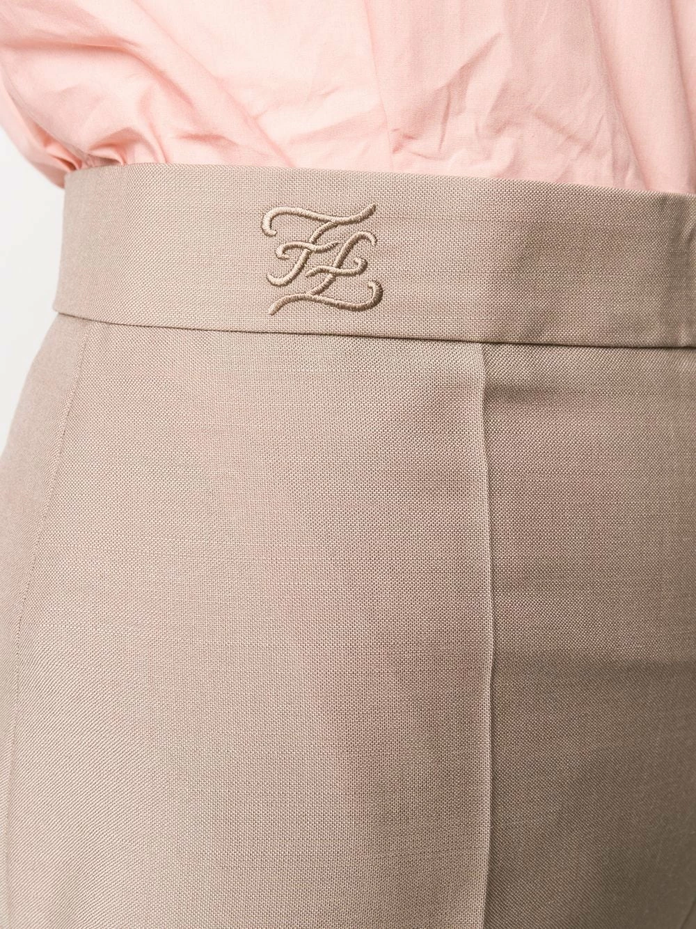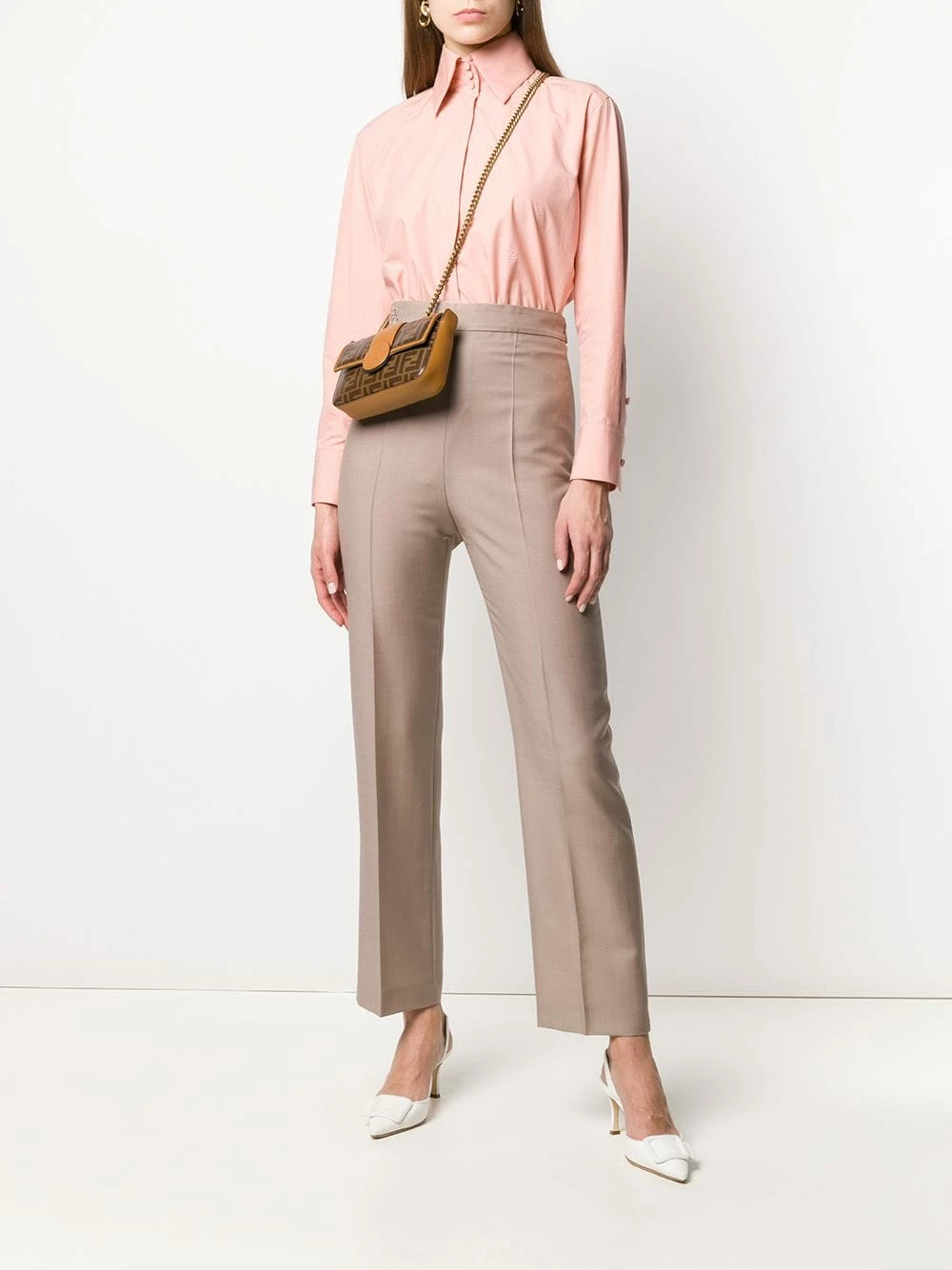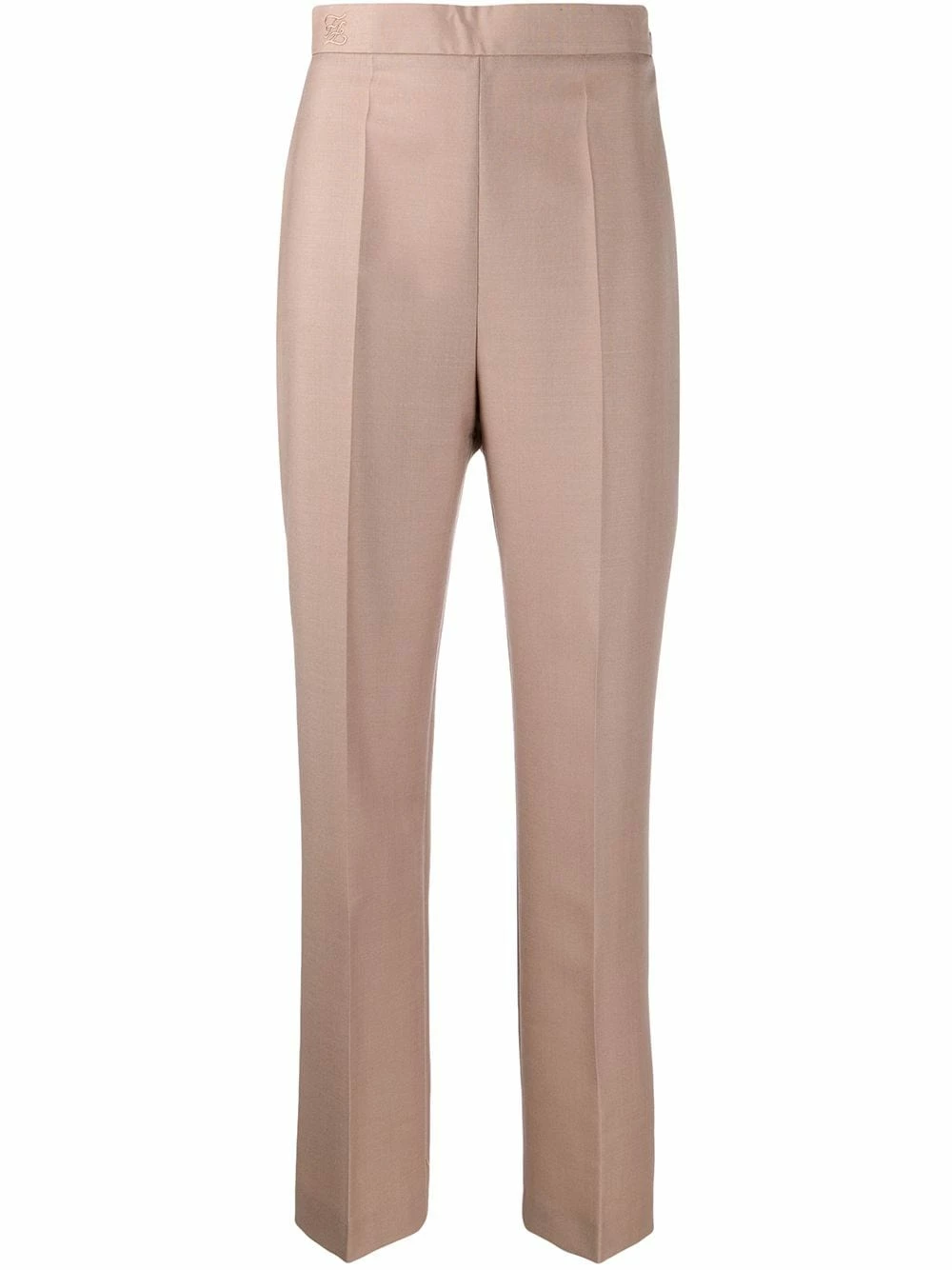There’s nothing more powerful than an expertly cut, tailored fit pair of trousers. Something Italian designer Fendi knows all too well and has mastered with these beige mohair wool blend tailored trousers. Leaving the iconic mark with the embroidered FF signature to the waistband. Featuring a fitted waist, an embroidered logo to the front, a side zip fastening, a tailored design and a pressed crease to the front and back.