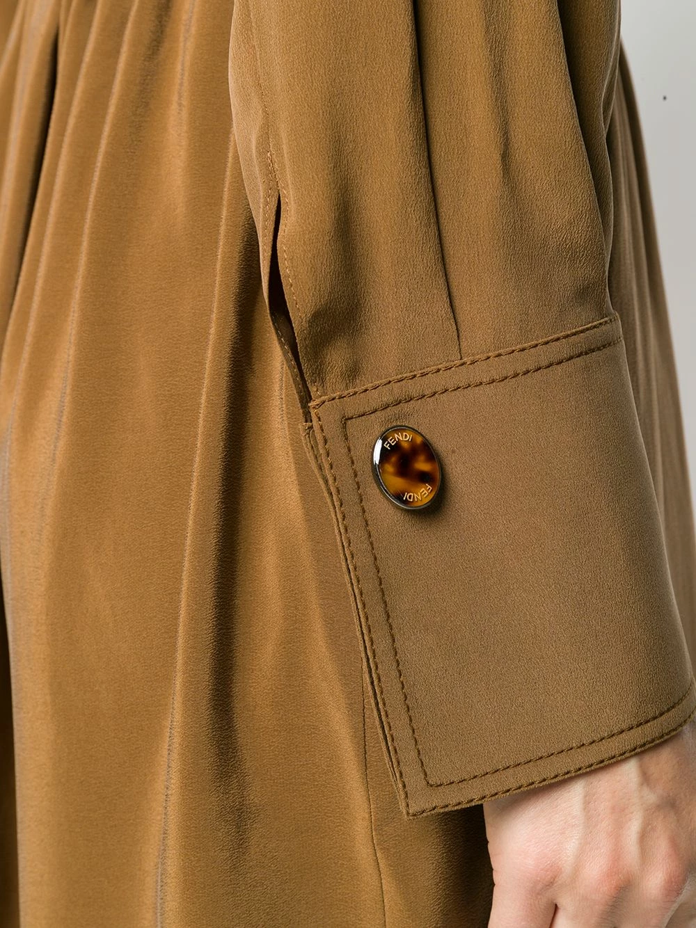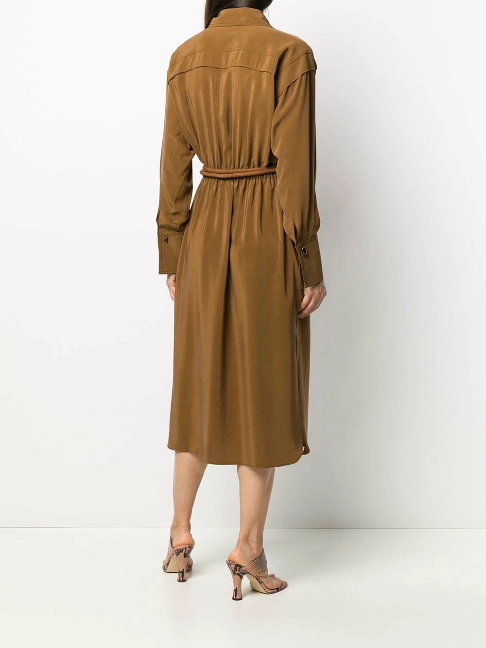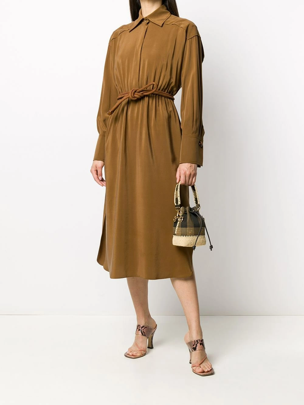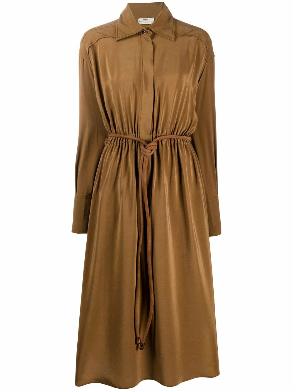 Have a taste for looking elegant? This chocolate brown crΓͺpe de Chine shirt dress from Fendi will have your mouth watering thanks to its silk construction that glides across the body loosely with a relaxed shape. No need to salivate any longer put this look into your basket immediately. Featuring a collar style, a concealed front button placket, a tie waist, ruched details, a relaxed shape, side slits, stitched panels, long sleeves and button cuffs.