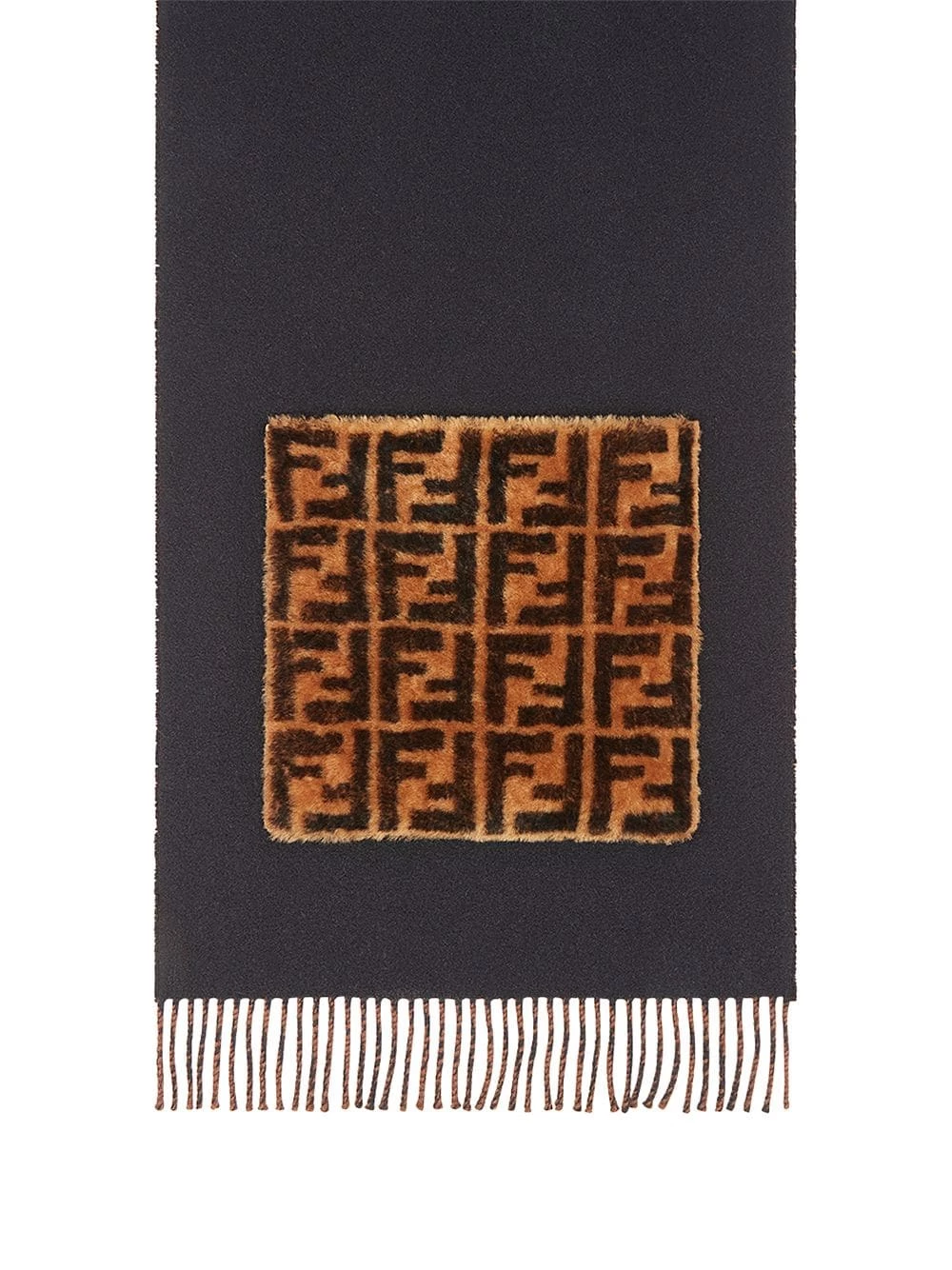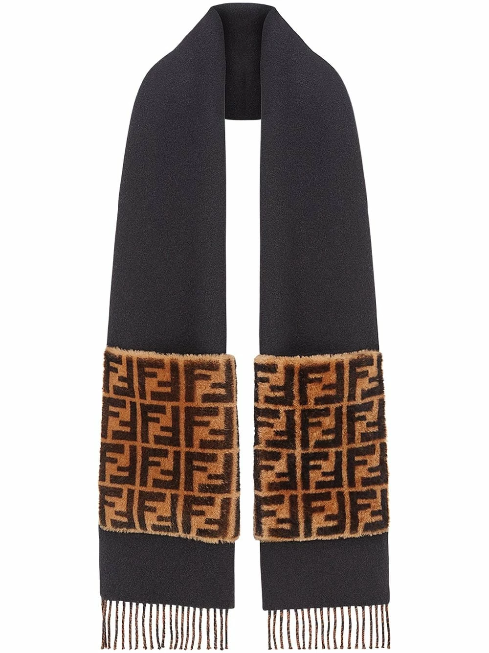 Fancy a slight touch of fur? Crafted from a black wool-cashmere blend, this Fendi scarf boasts brown shearling appliquΓ©s with the FF motif. For that little bit extra. Featuring contrasting panels, fringed edges and FF pattern shearling appliquΓ©s.