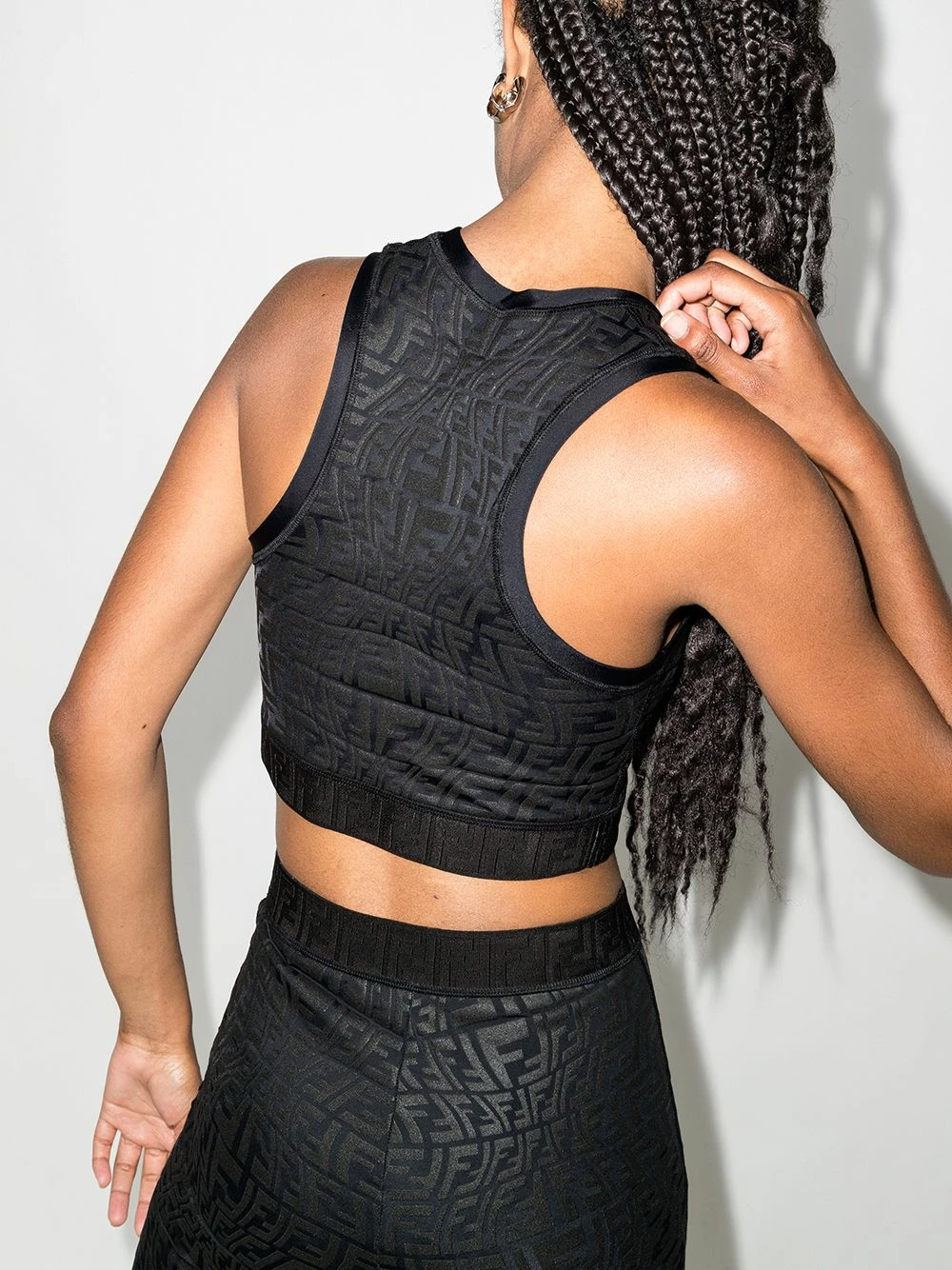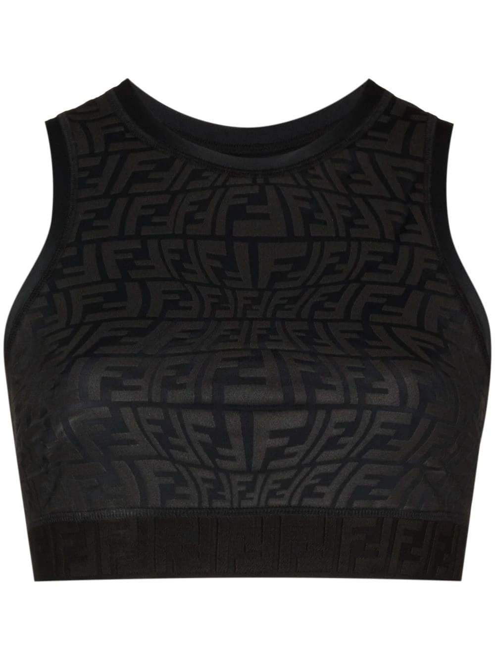 Created in collaboration with NYC-based designer Sarah Coleman, the FF FishEye motif adds dimension and a retro look to Fendi’s AW21 collection. In a versatile black shade, this sports bra features a round neck and racer back and is completed with an elasticated band at the hem for added support.