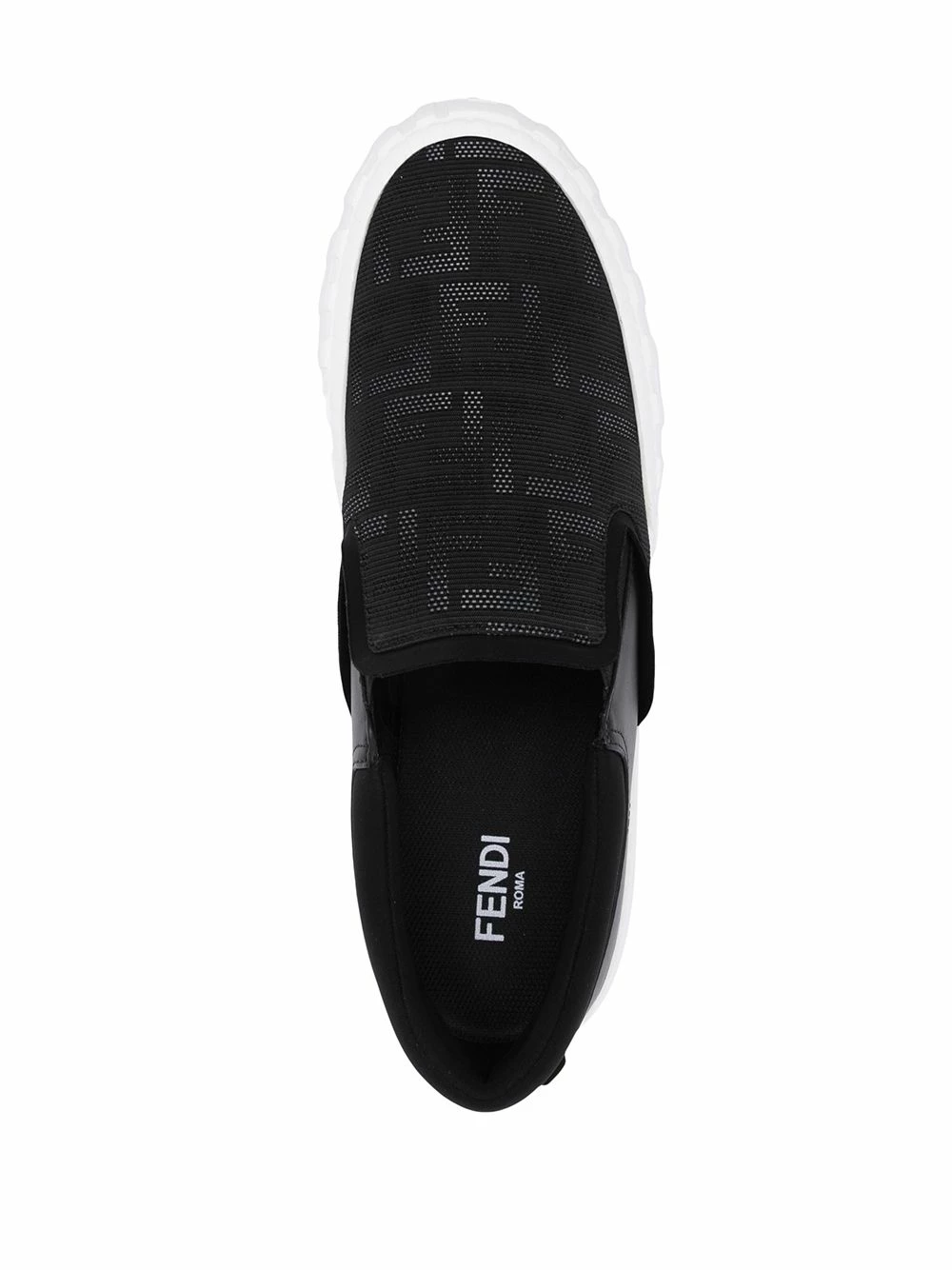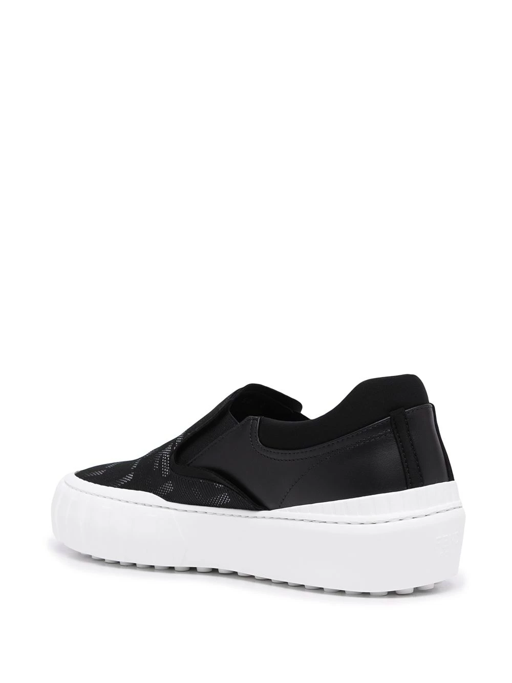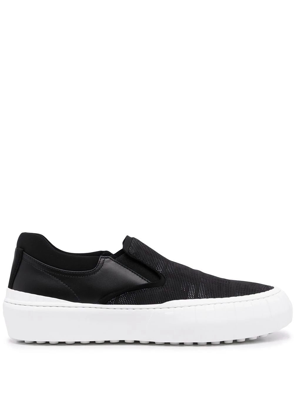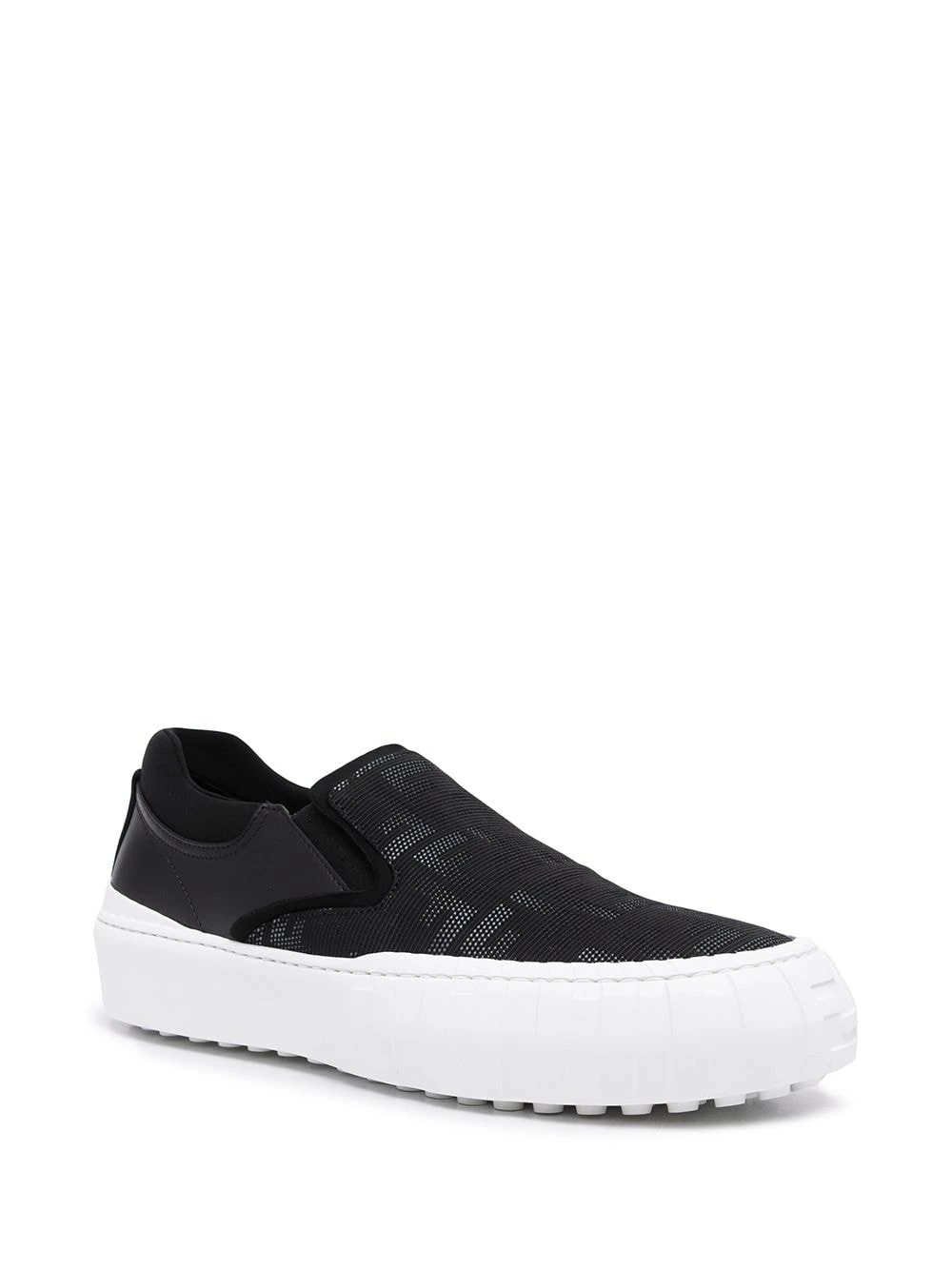 A revisited theme, Fendiβs iconic FF motif adds a recognisable look to these slip-on sneakers. Presented in a tonal black hue, the pattern adorns the front section of this low-top design.Β