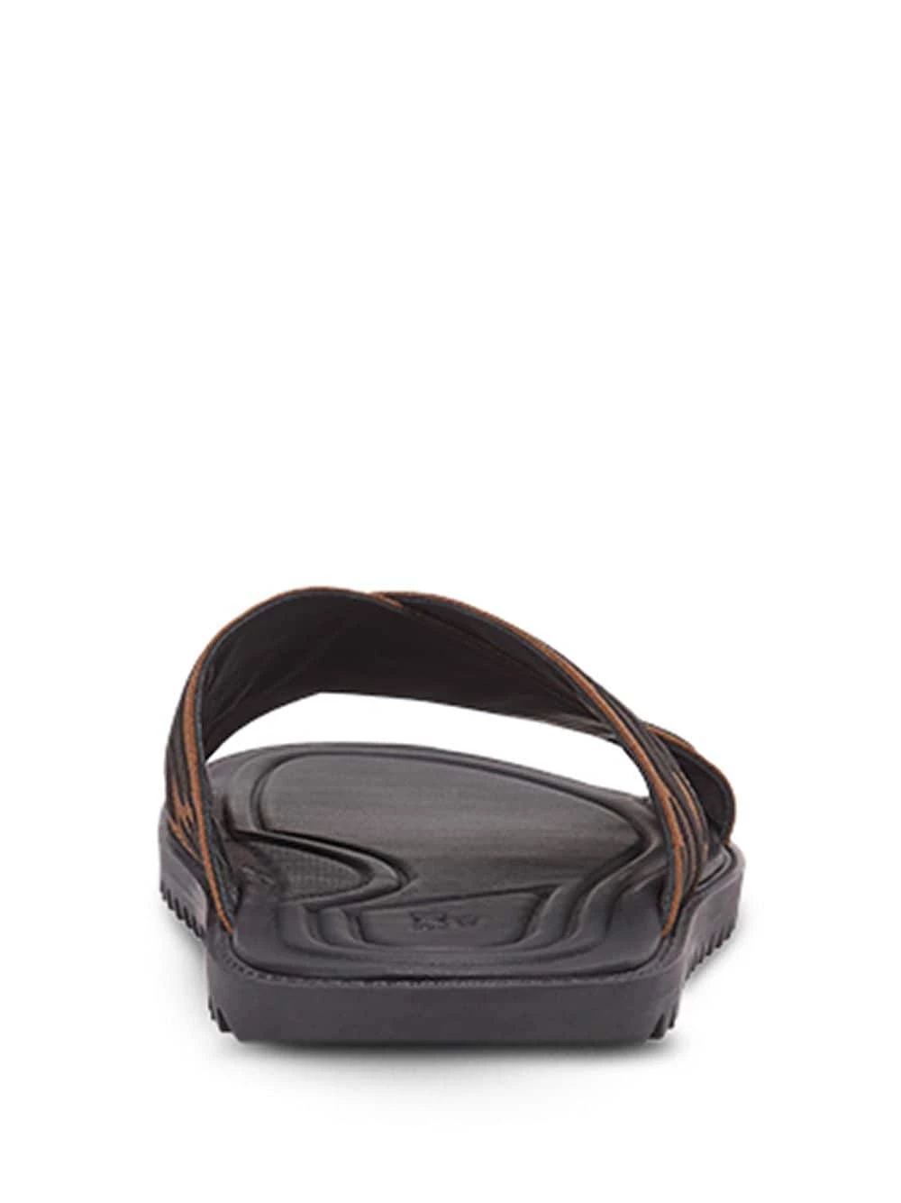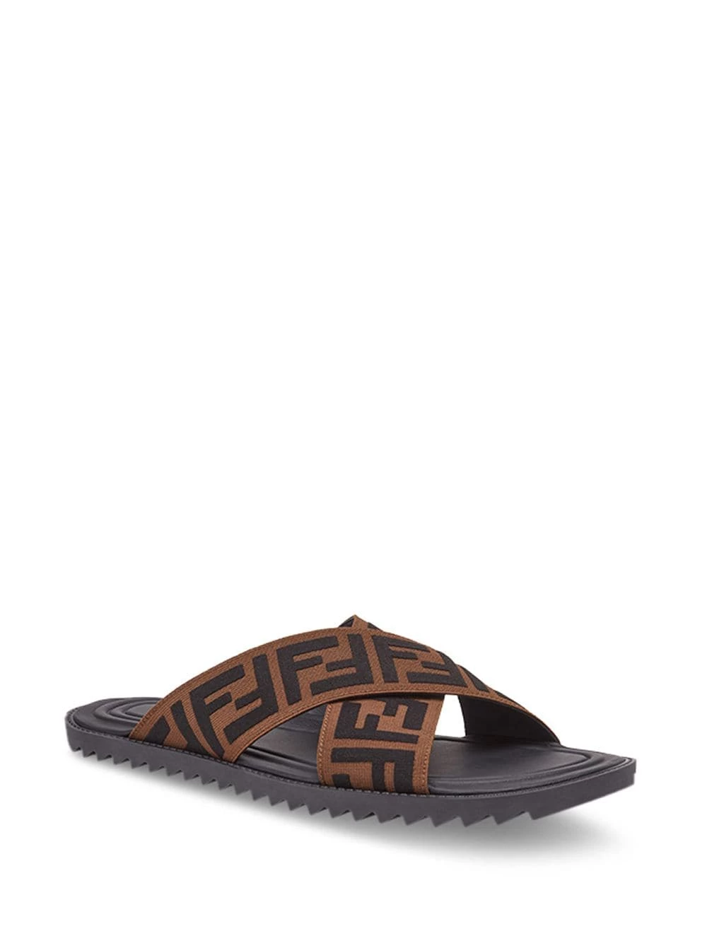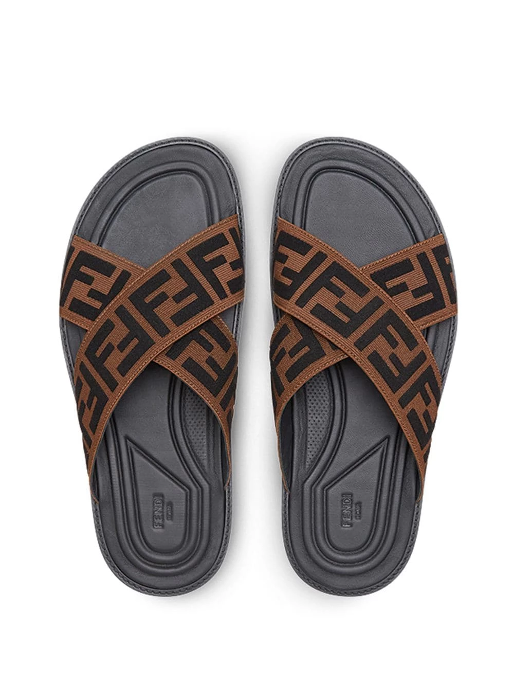 Fendi brings its infamous double F monogram to the crossover slides. Crafted in Italy, this backless open toe design features two maya brown crossover straps to the front, detailed with a jacquard logo pattern, finished with a black leather insole and a ridged rubber sole.