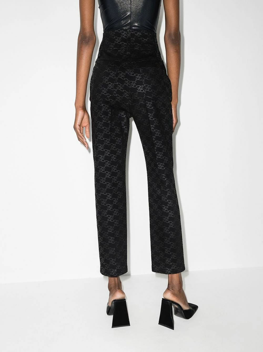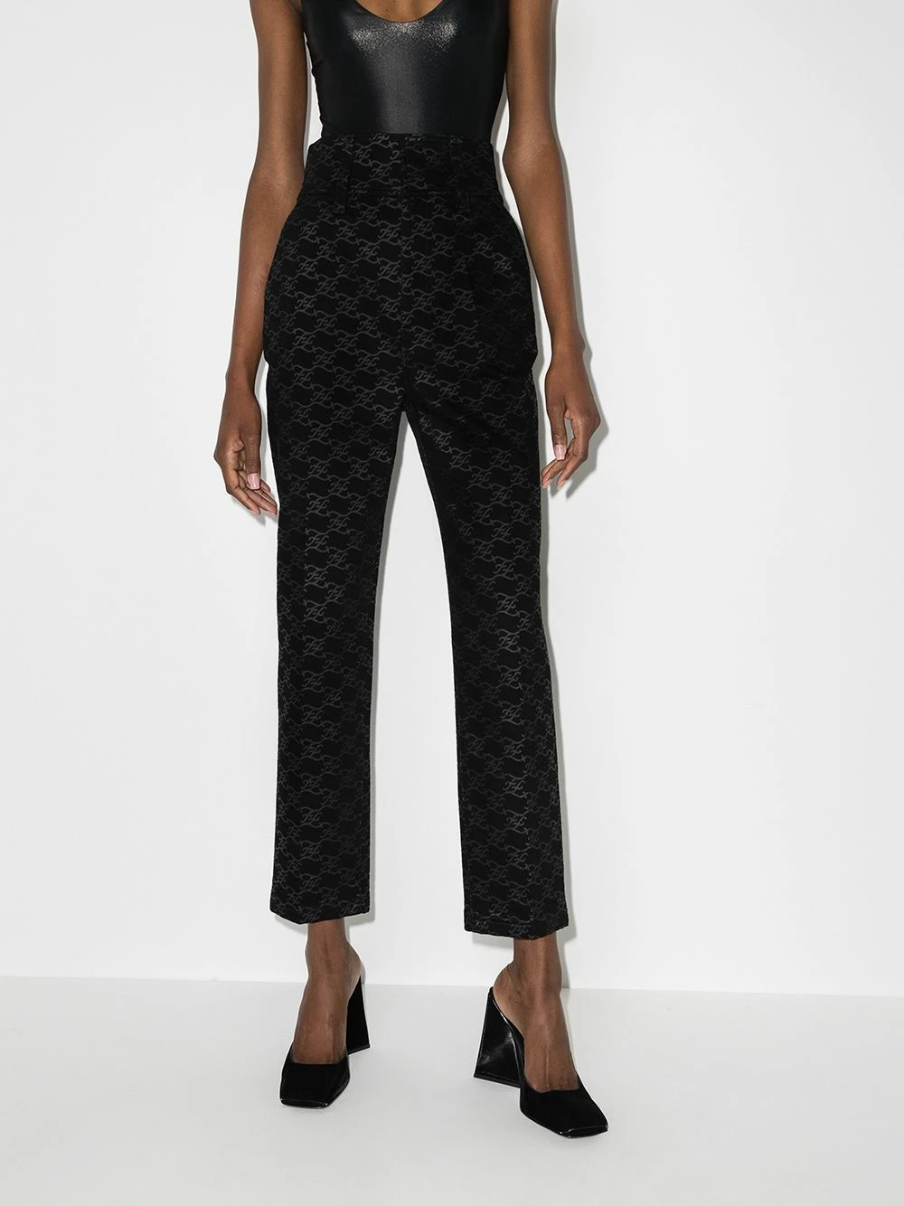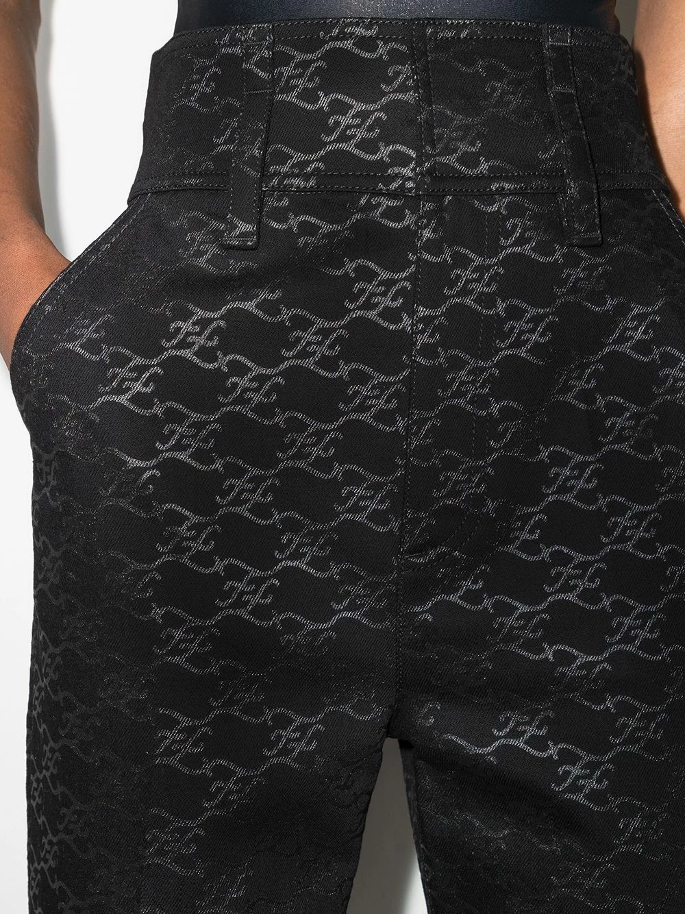 The FF Karligraphy motif was designed by Karl Lagerfeld, former creative director of Fendi. First seen in 1981, the logo is here presented in a subtle black hue covering these high-waisted trousers.