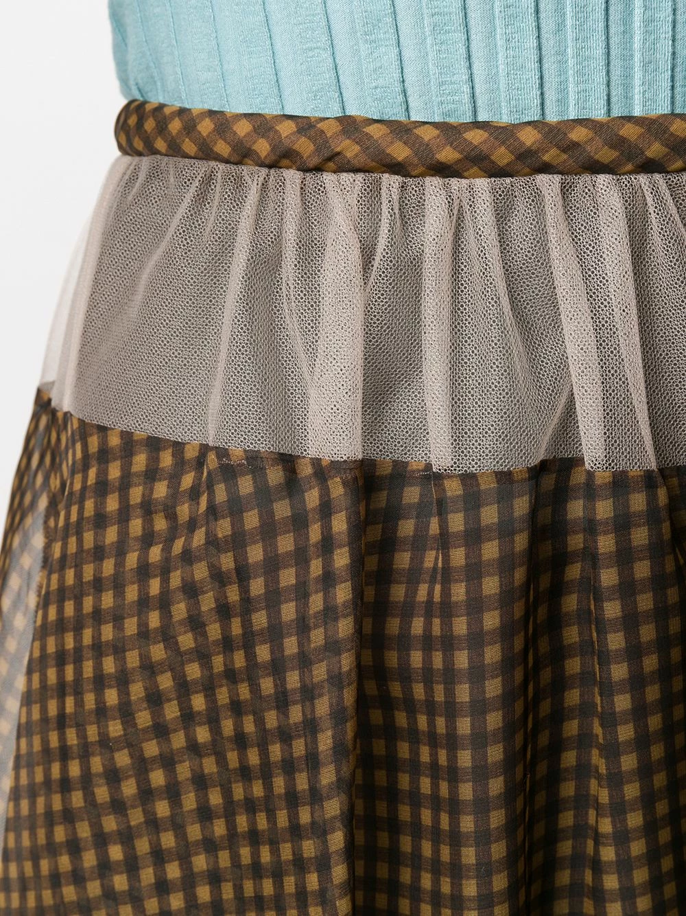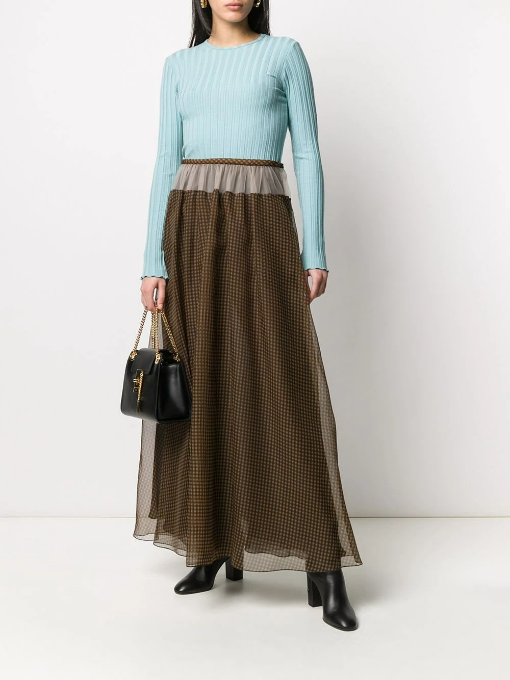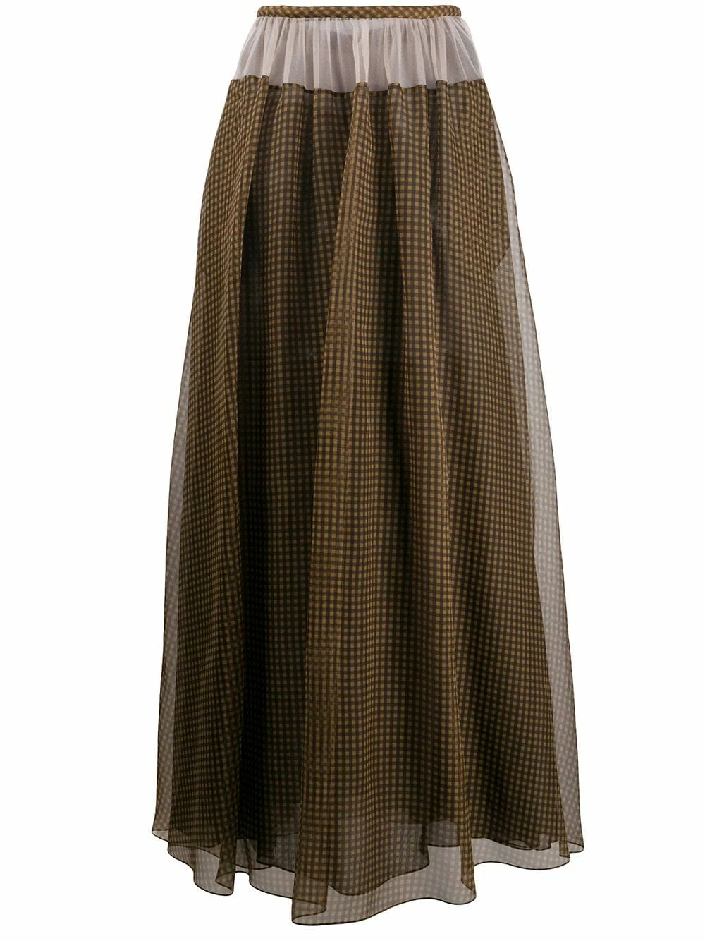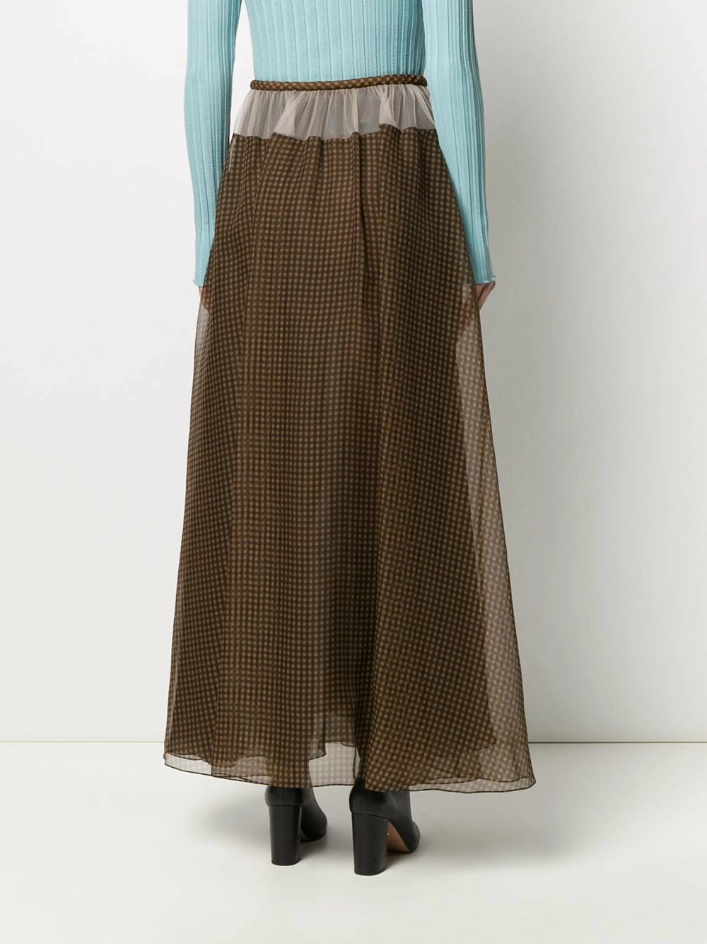 Time to upgrade your skirt game. Crafted from silk organza, this ebony brown skirt from Fendi is decorated with a Vichy pattern and detailed with a transparent panel at the waist. Ready to step up? Featuring a high waist, pleated details and a long length.